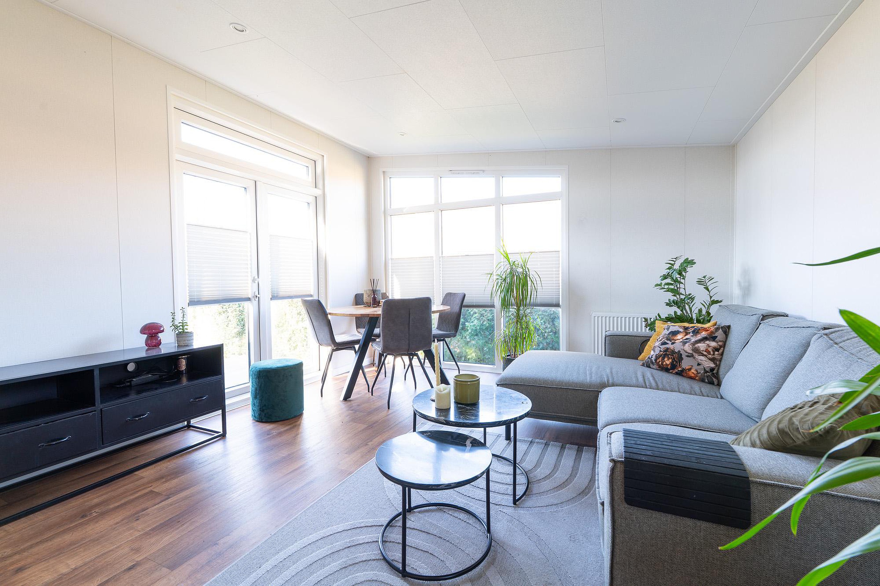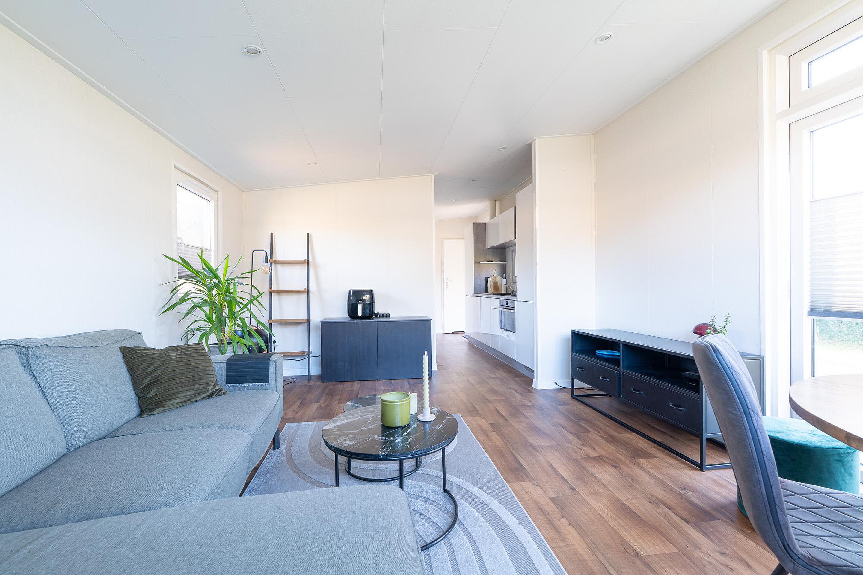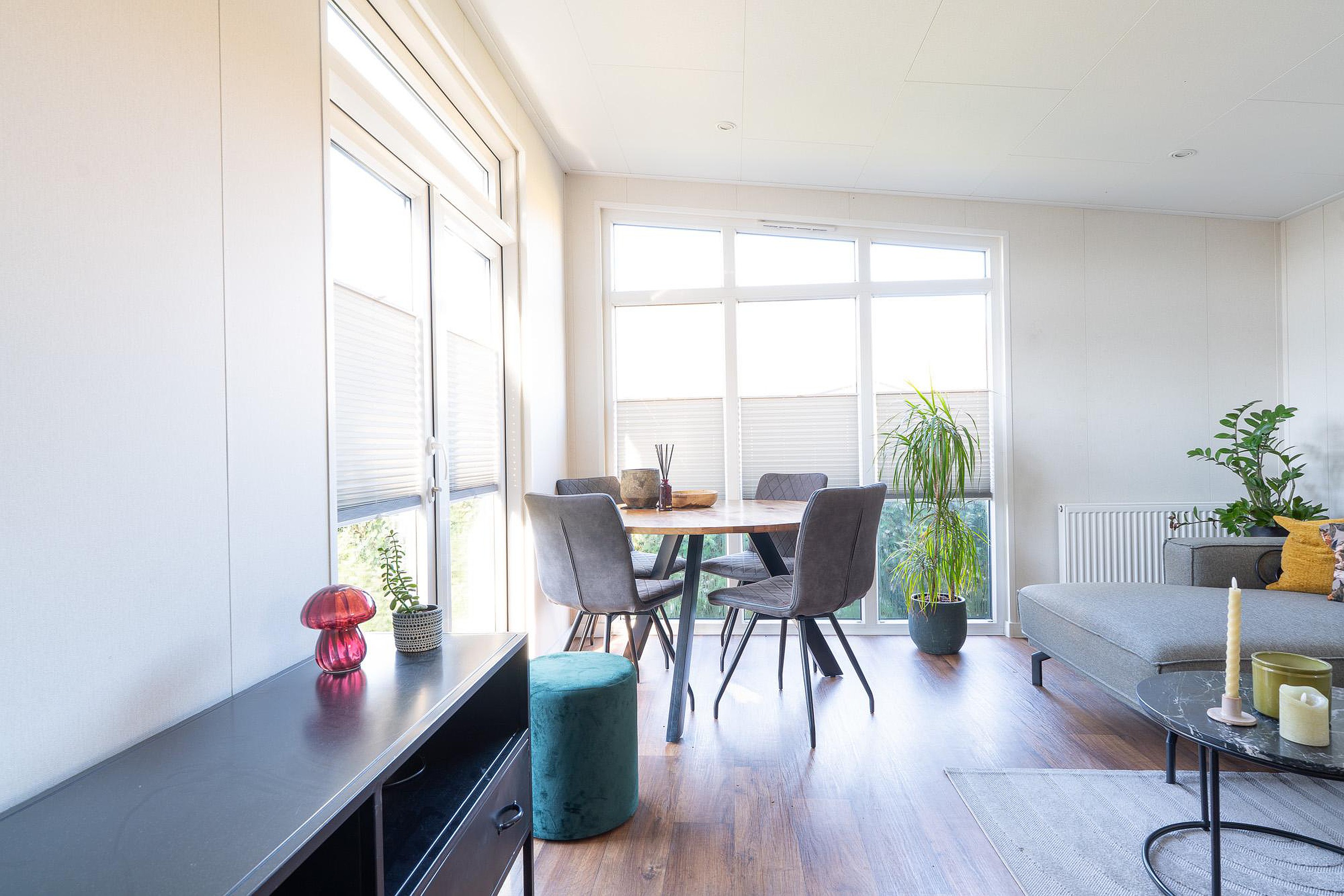 Begane grond Bij binnenkomst valt direct de ruime en lichte woonkamer op van circa 18 m2. Dankzij de grote ramen stroomt het daglicht rijkelijk naar binnen. De kamer biedt voldoende ruimte voor een comfortabele zithoek en een gezellige eethoek. Alle vertrekken in het chalet zijn voorzien van verwarming, waardoor het hier ook in het vroege voorjaar of het late najaar zeer aangenaam verblijven is.