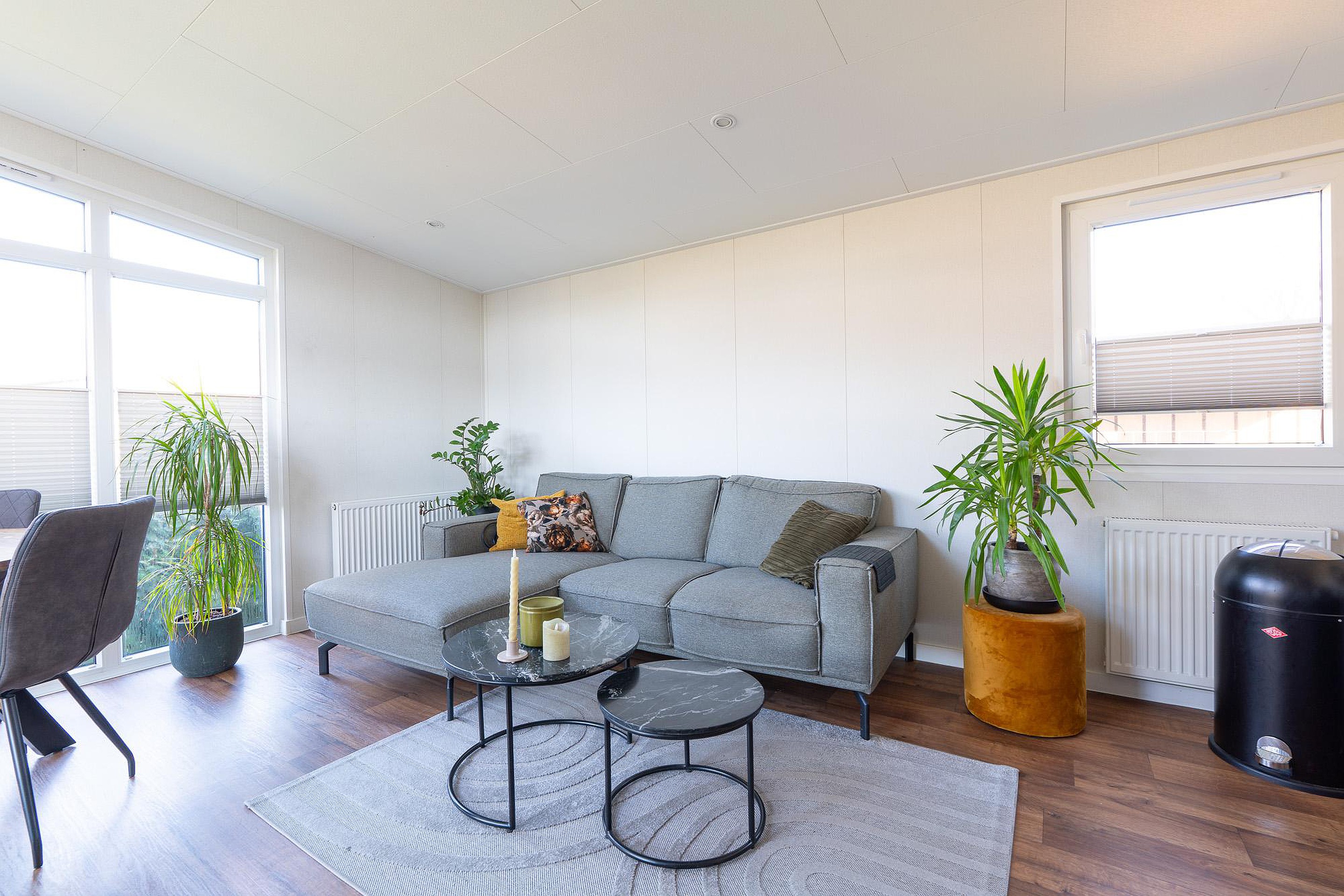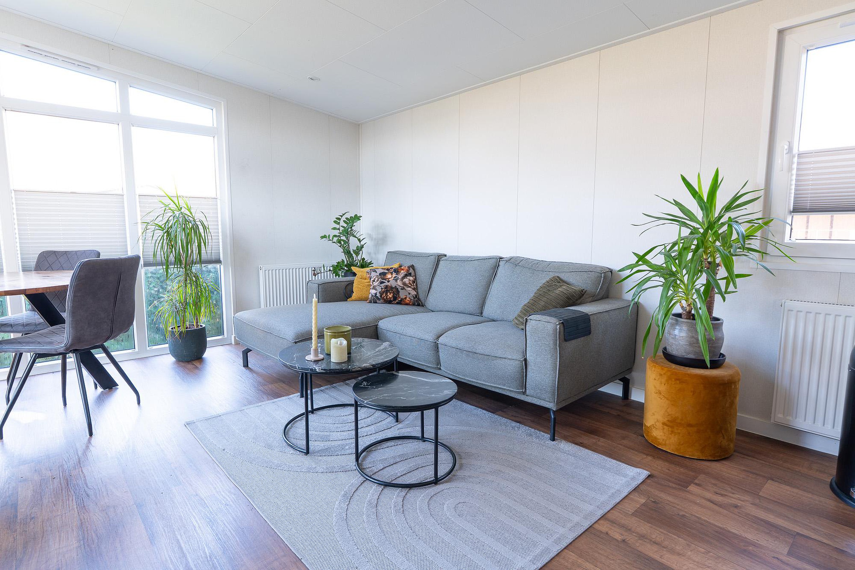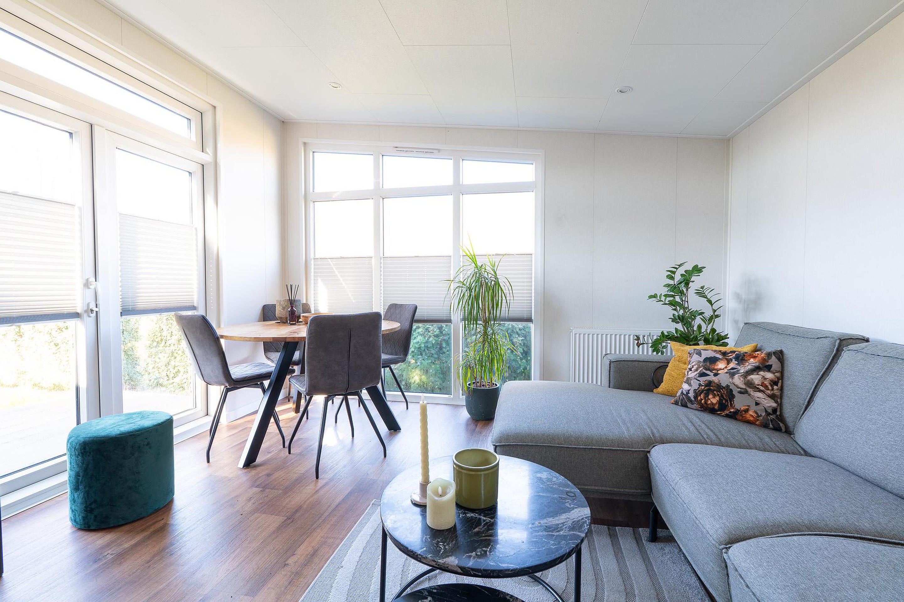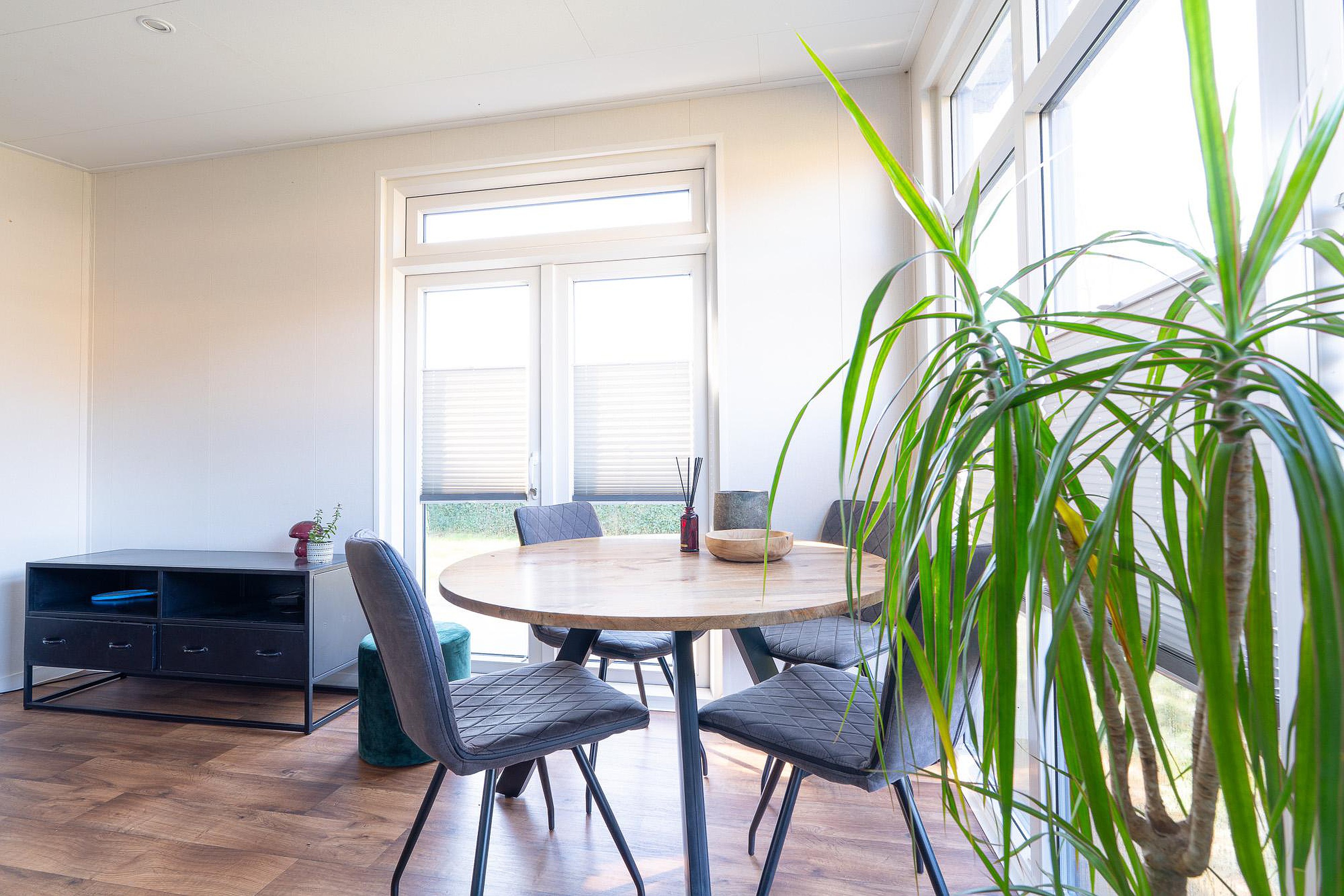 Begane grond Bij binnenkomst valt direct de ruime en lichte woonkamer op van circa 18 m2. Dankzij de grote ramen stroomt het daglicht rijkelijk naar binnen. De kamer biedt voldoende ruimte voor een comfortabele zithoek en een gezellige eethoek. Alle vertrekken in het chalet zijn voorzien van verwarming, waardoor het hier ook in het vroege voorjaar of het late najaar zeer aangenaam verblijven is.