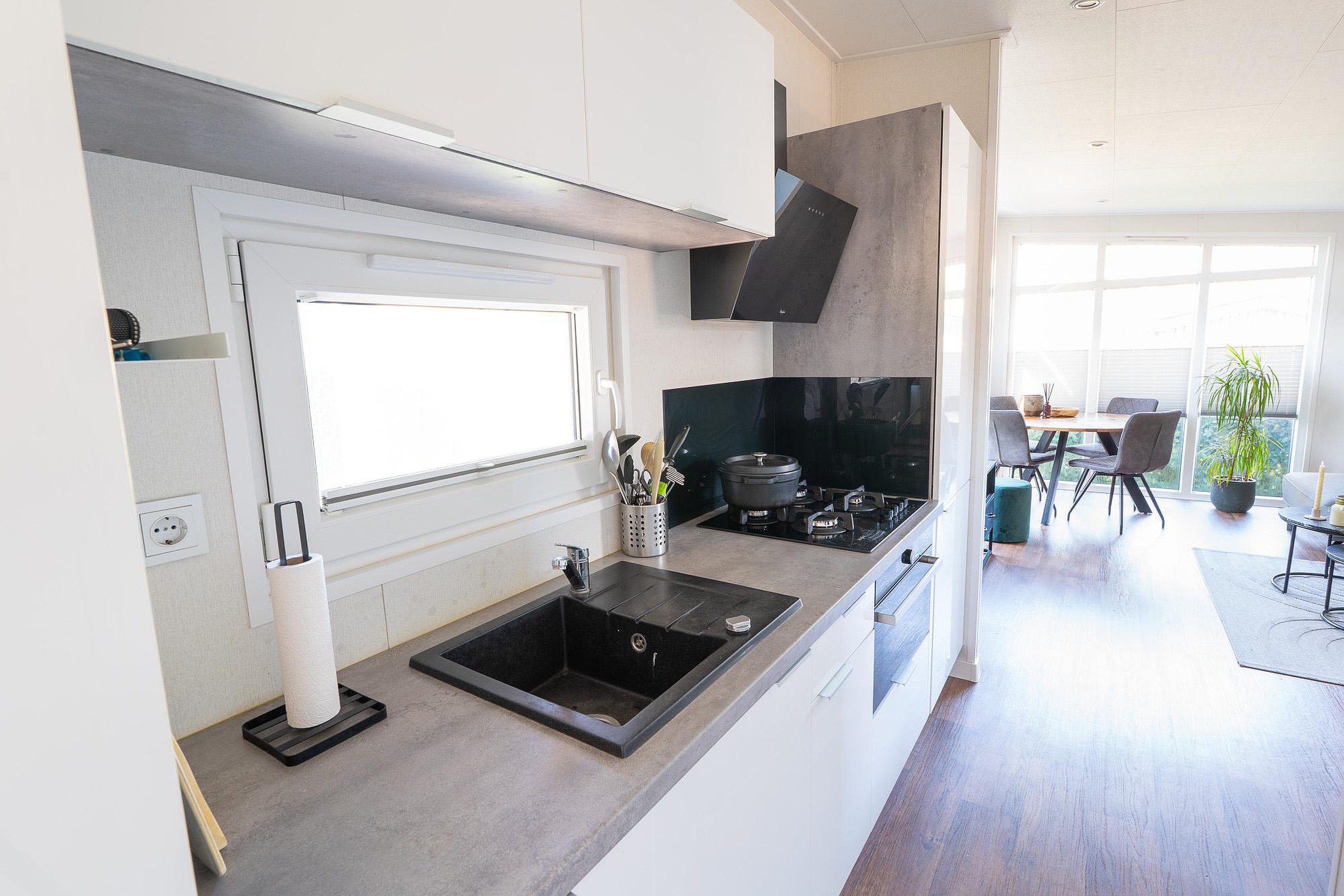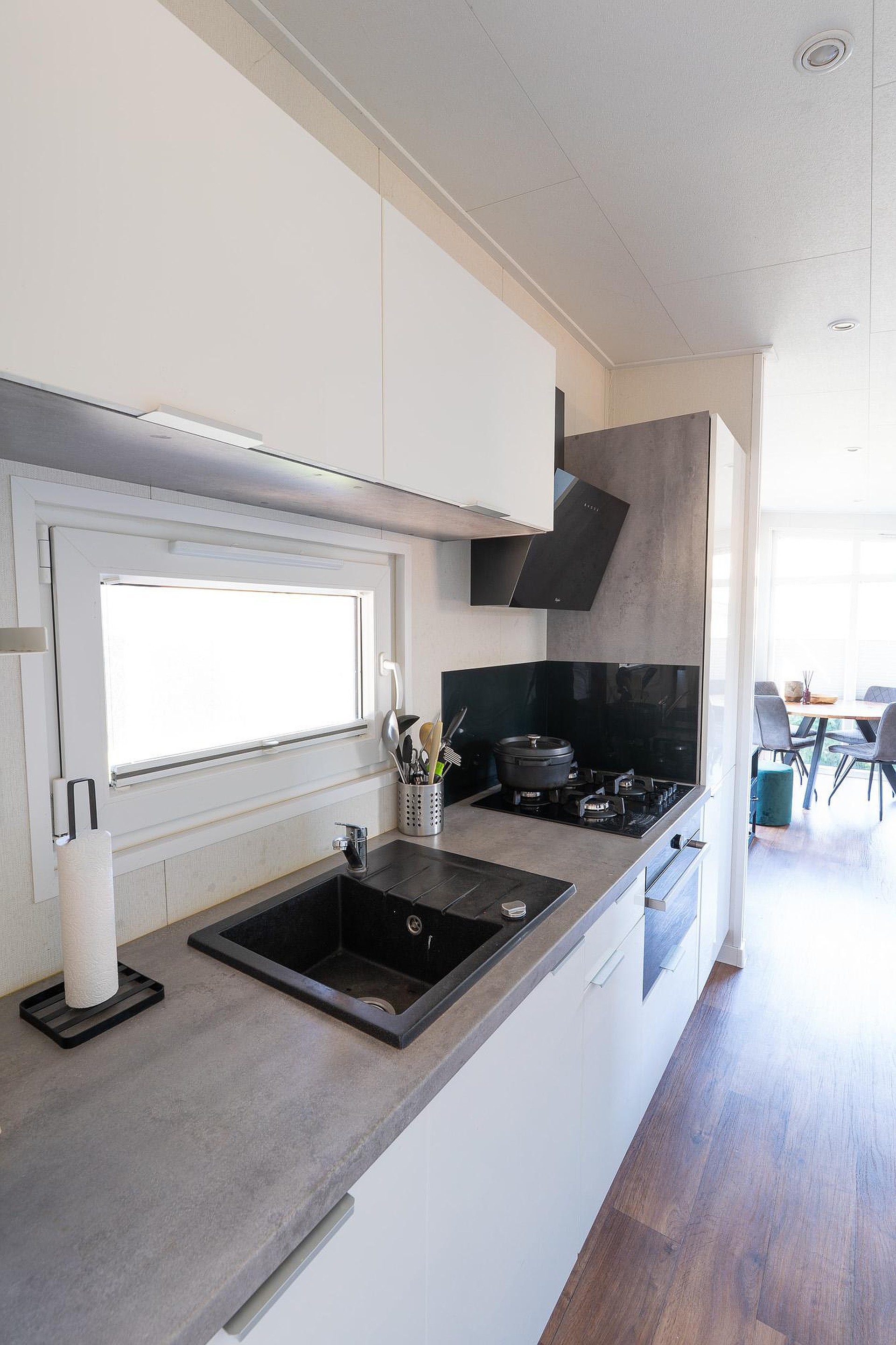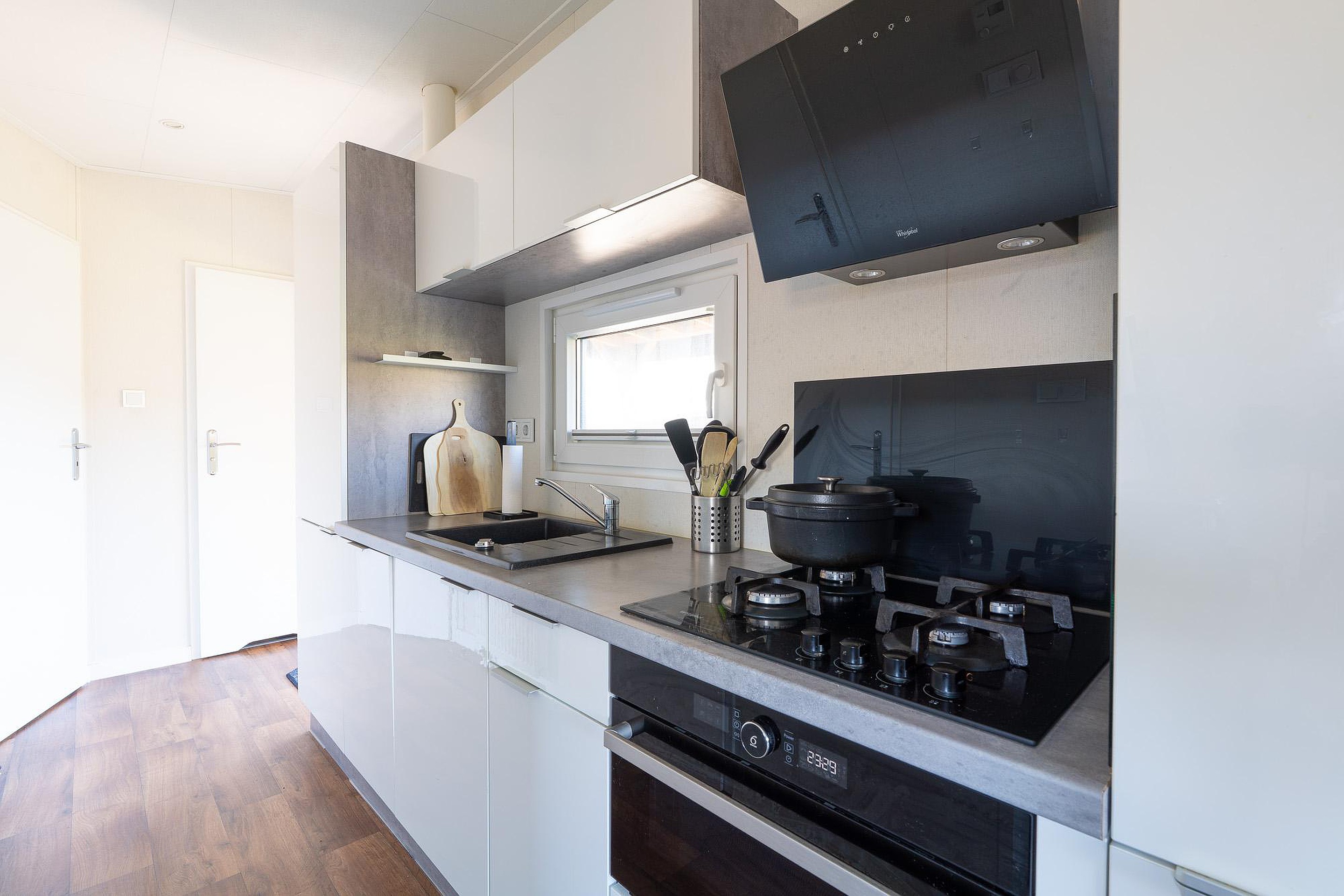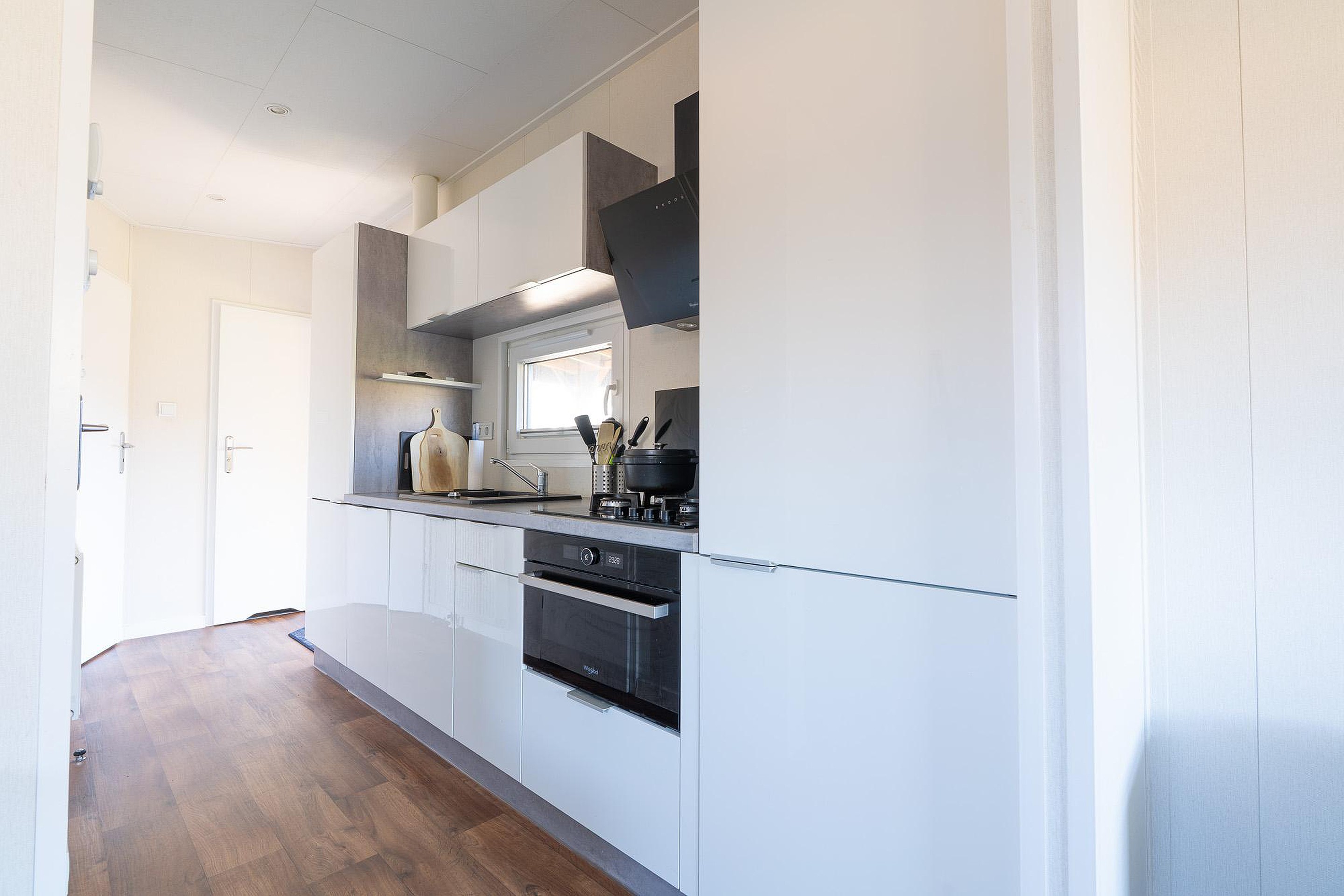 De open keuken is modern en compleet uitgevoerd. Voor wie ook tijdens de vakantie graag uitgebreid kookt, ontbreekt het hier aan niets. De keuken is voorzien van diverse inbouwapparatuur, waaronder een vaatwasser, een koelkast, vriezer, een oven en een gaskookplaat. De lichte fronten en het praktische werkblad maken het een functioneel en stijlvol geheel.