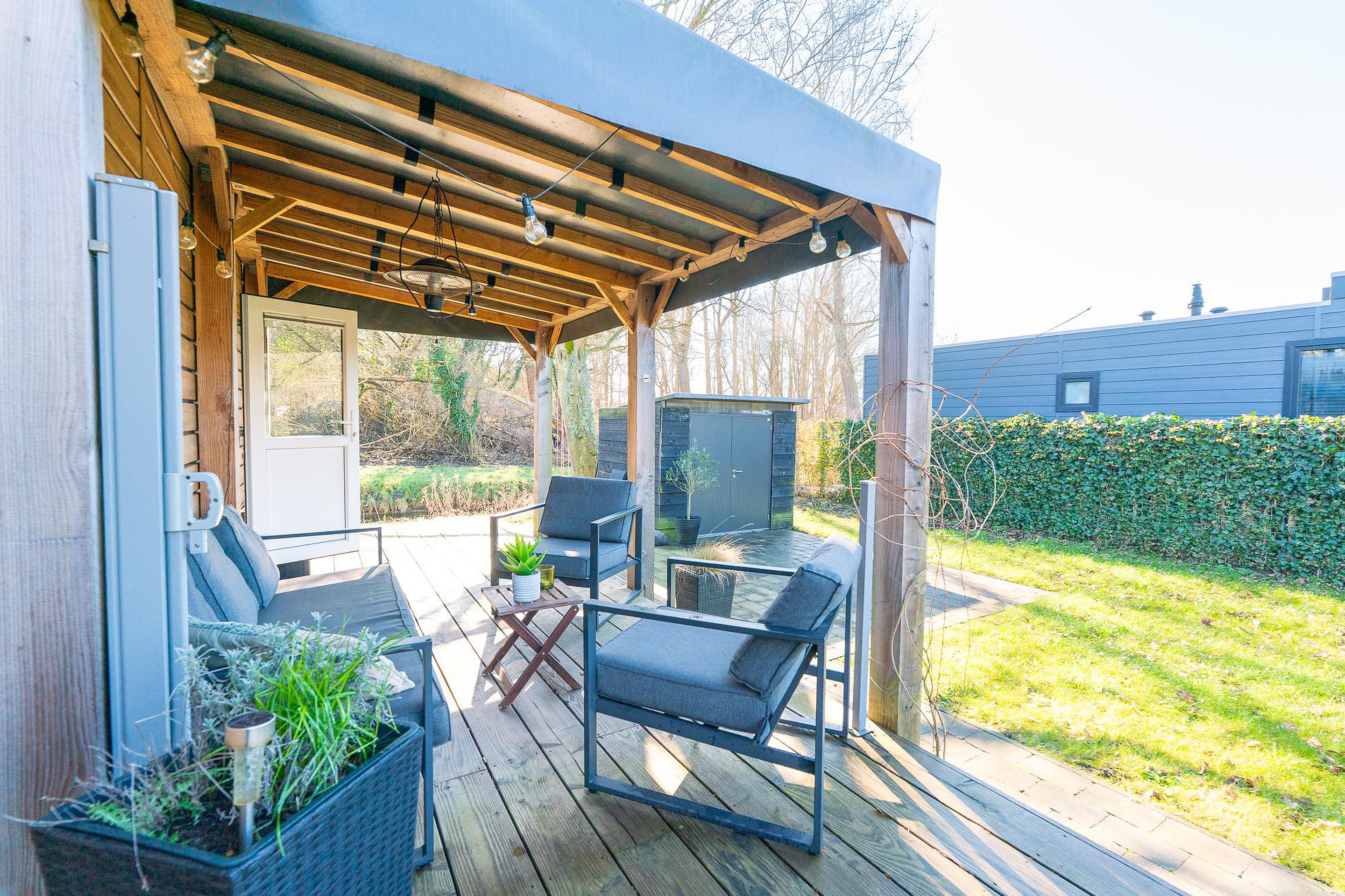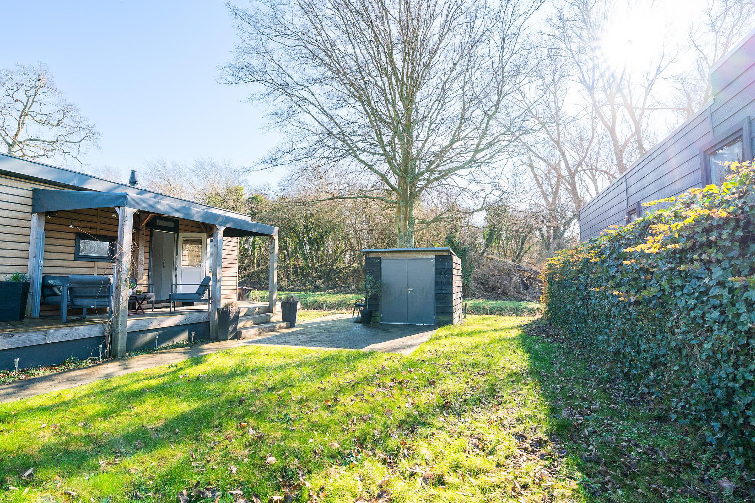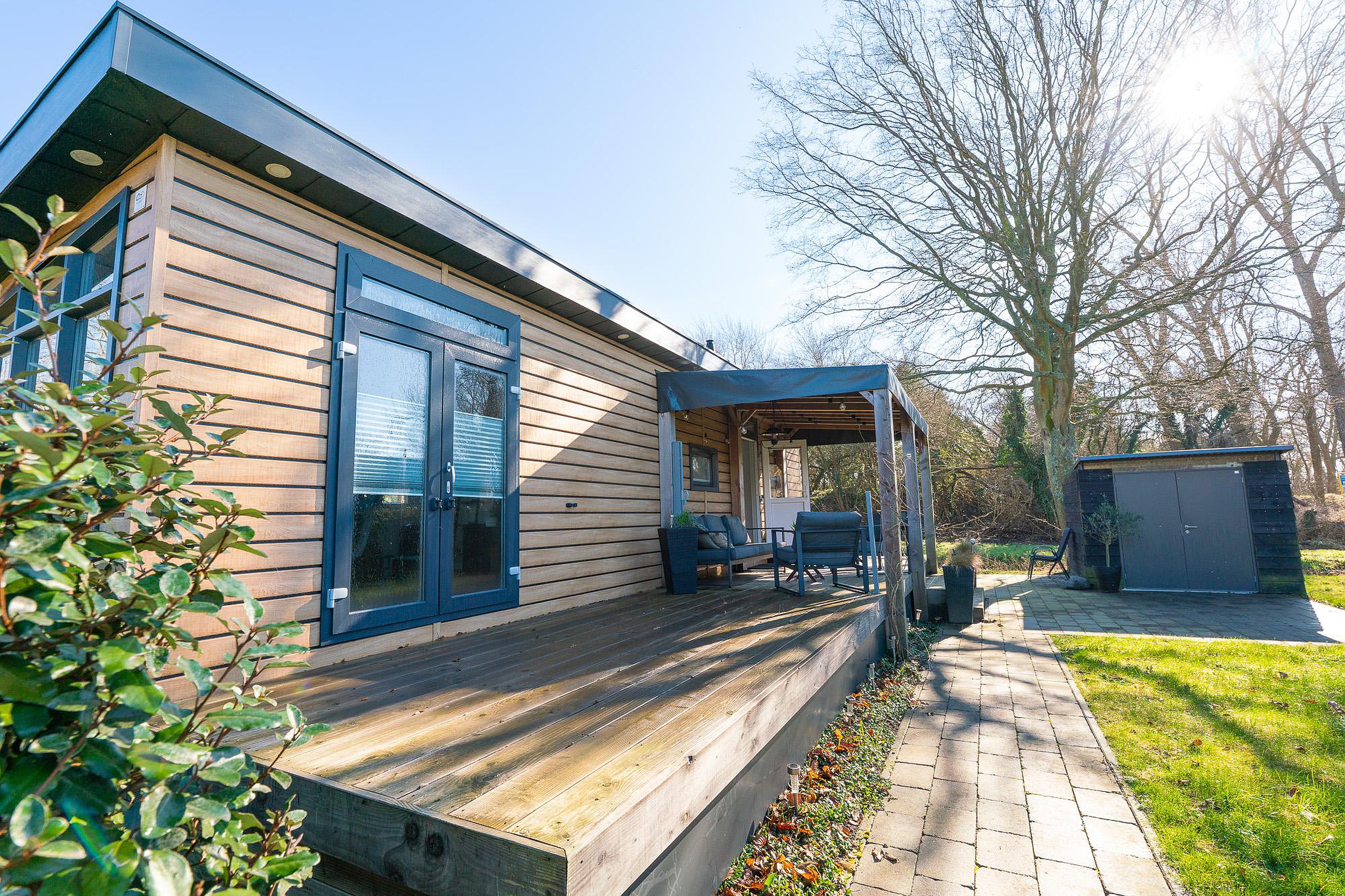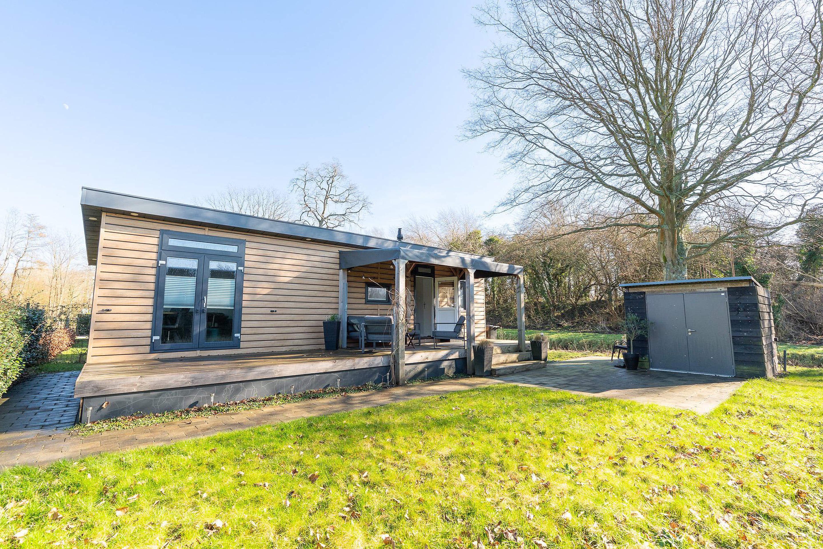 Zoals eerder vermeld, is het overdekte terras van 12 m2 een eyecatcher. Het houten terras ligt direct aan het chalet en nodigt uit tot lange barbecues of ontspannen ochtenden met een kop koffie. Daarnaast beschikt het perceel over een aparte, vrijstaande schuur van circa 4,5 m2. Deze is ideaal voor het stallen van fietsen, tuingereedschap of watersportuitrusting.