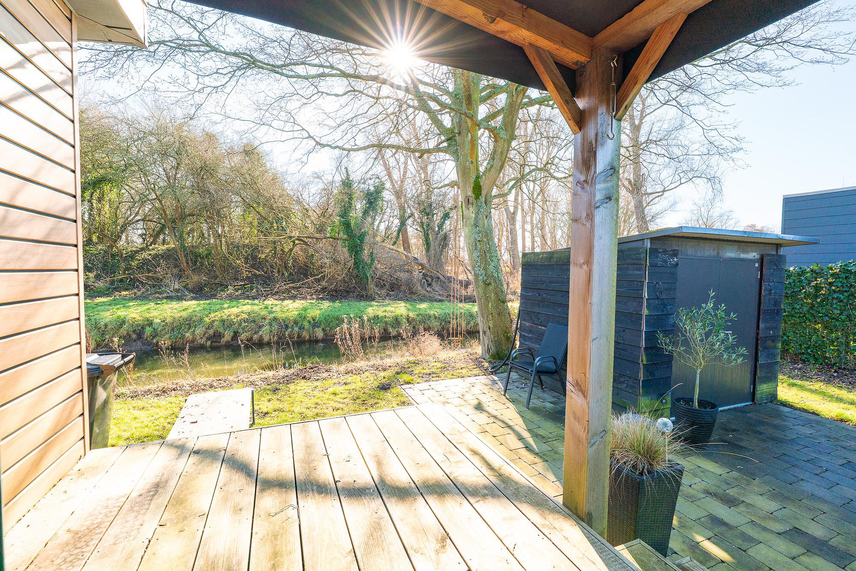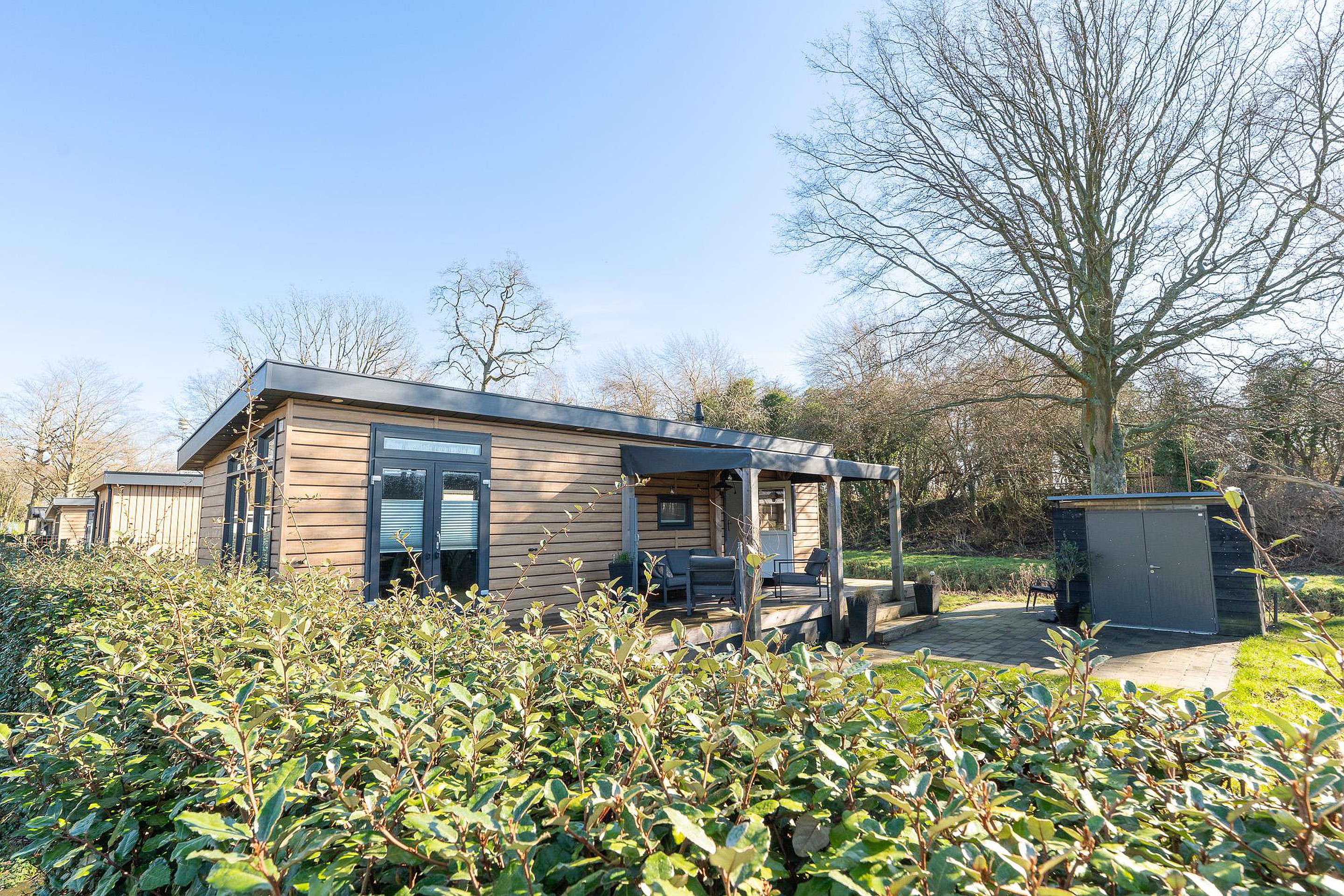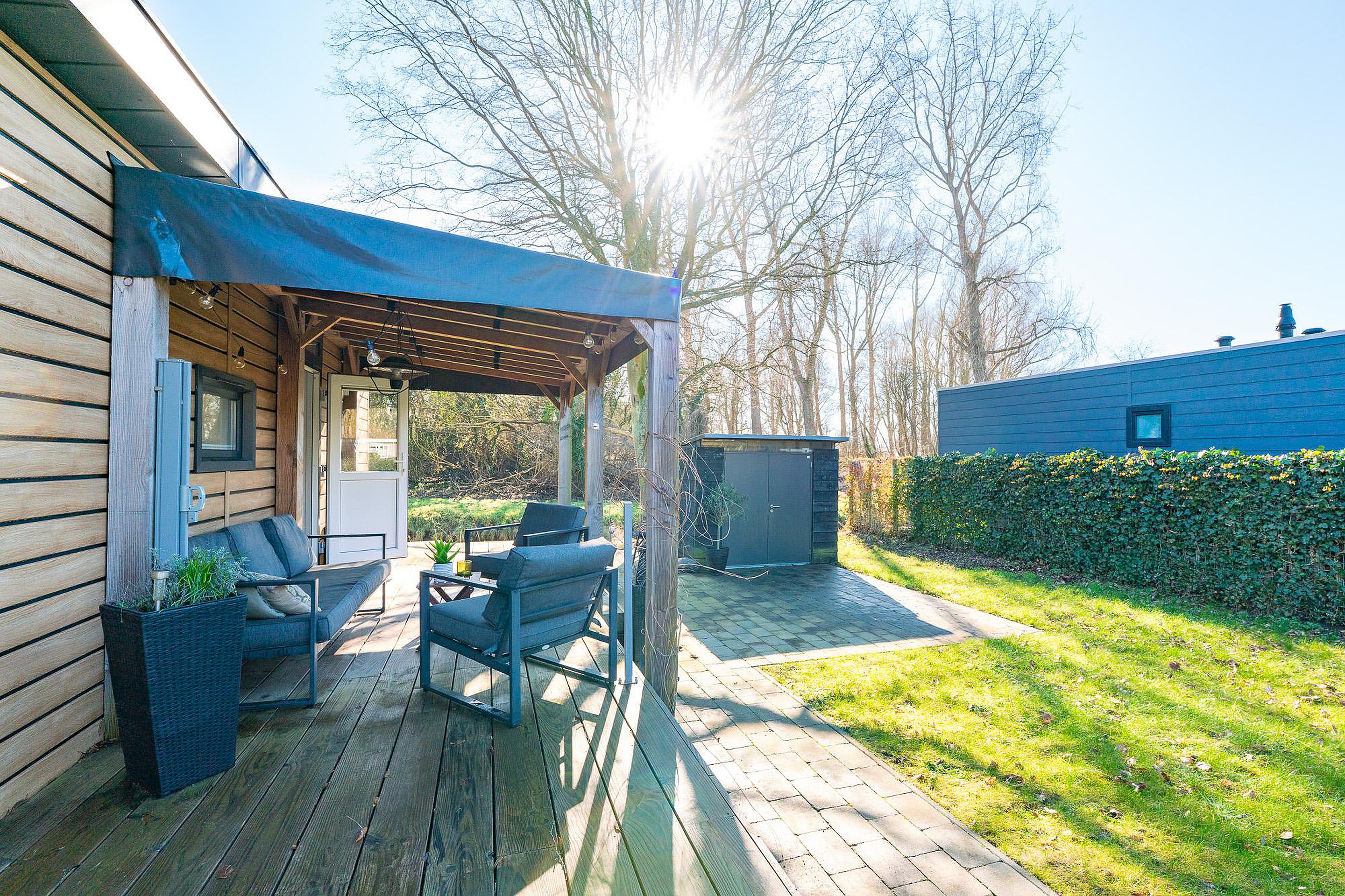 Zoals eerder vermeld, is het overdekte terras van 12 m2 een eyecatcher. Het houten terras ligt direct aan het chalet en nodigt uit tot lange barbecues of ontspannen ochtenden met een kop koffie. Daarnaast beschikt het perceel over een aparte, vrijstaande schuur van circa 4,5 m2. Deze is ideaal voor het stallen van fietsen, tuingereedschap of watersportuitrusting.