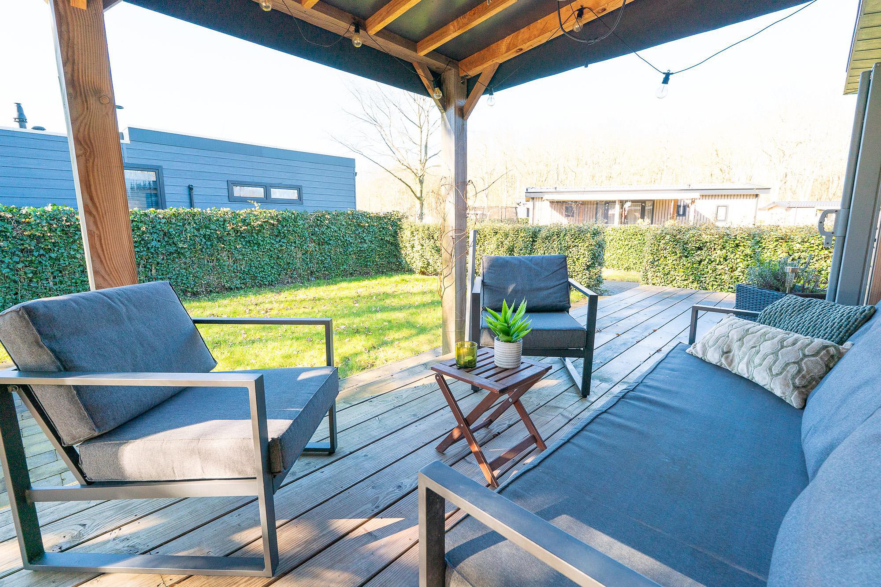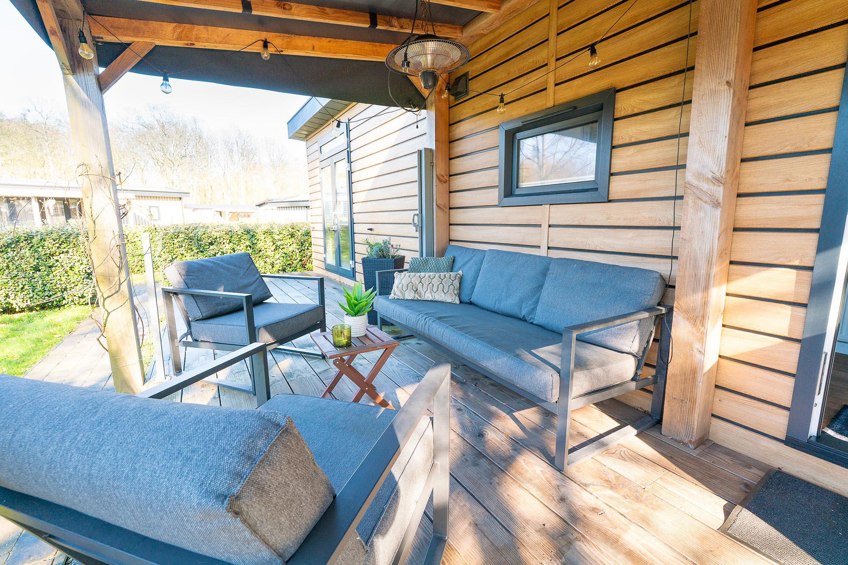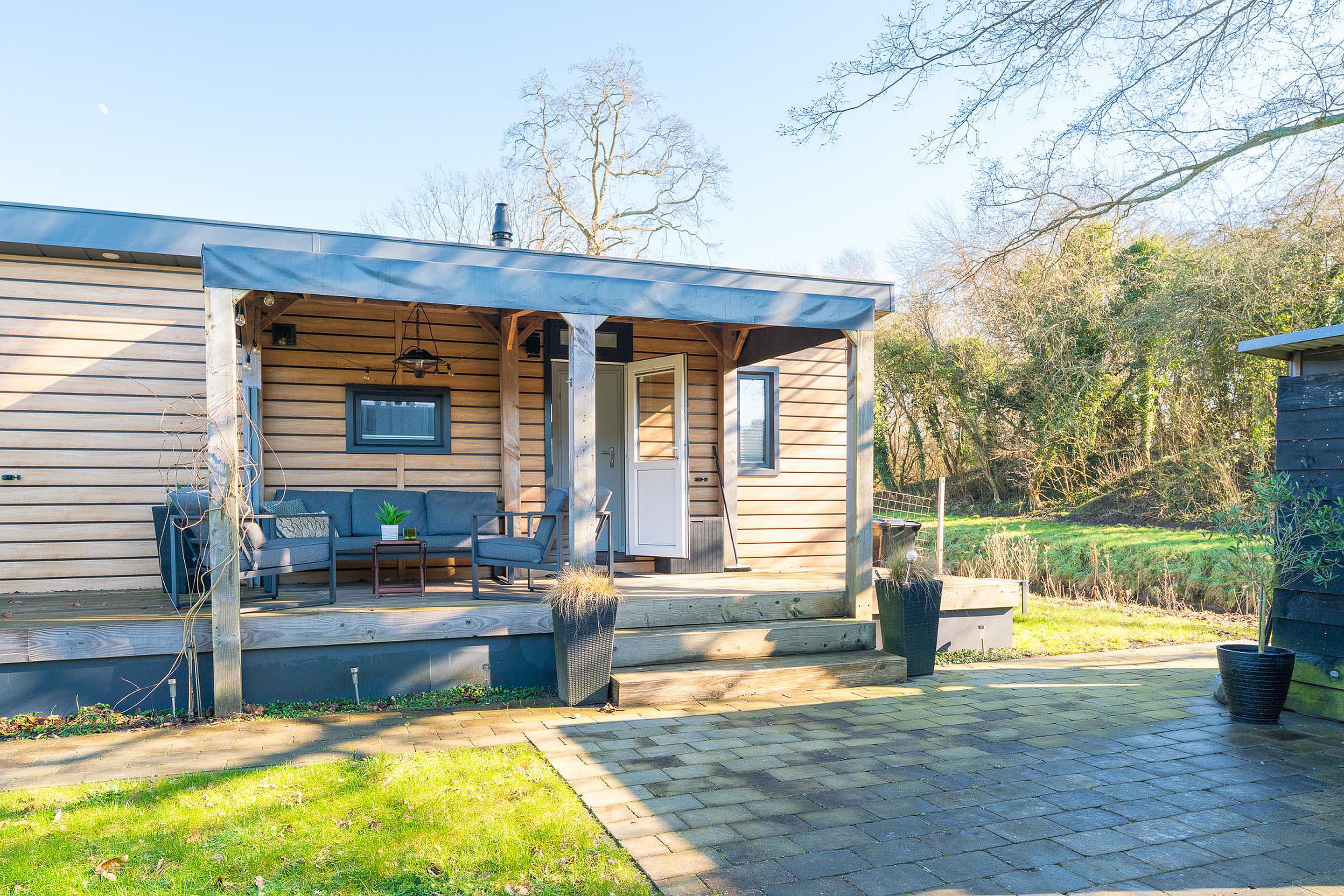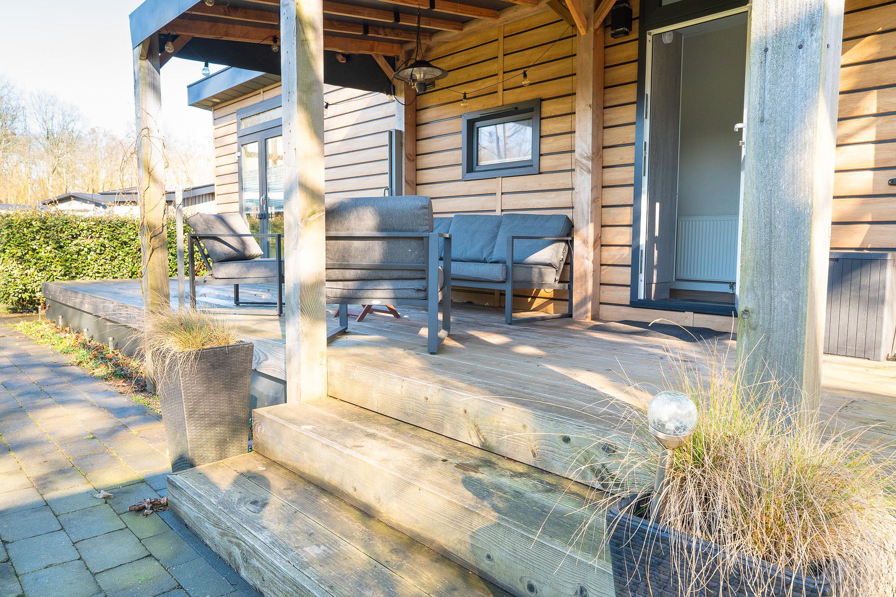 Zoals eerder vermeld, is het overdekte terras van 12 m2 een eyecatcher. Het houten terras ligt direct aan het chalet en nodigt uit tot lange barbecues of ontspannen ochtenden met een kop koffie. Daarnaast beschikt het perceel over een aparte, vrijstaande schuur van circa 4,5 m2. Deze is ideaal voor het stallen van fietsen, tuingereedschap of watersportuitrusting.