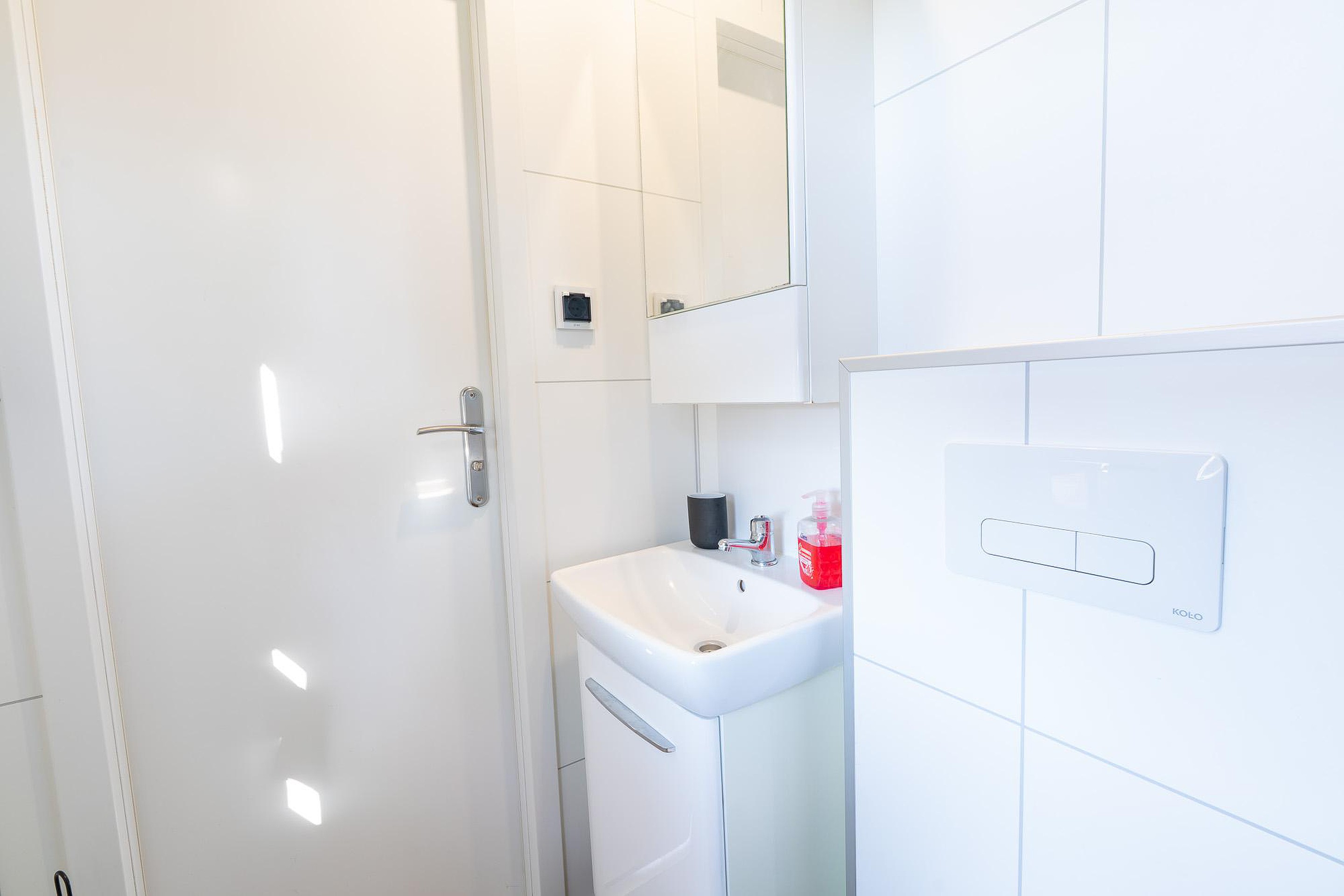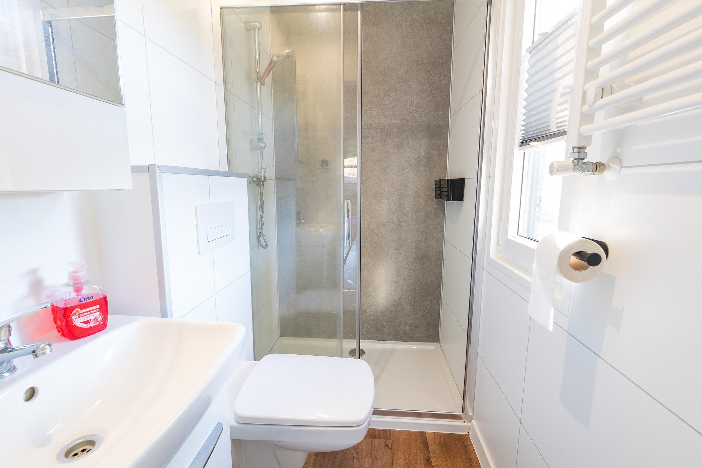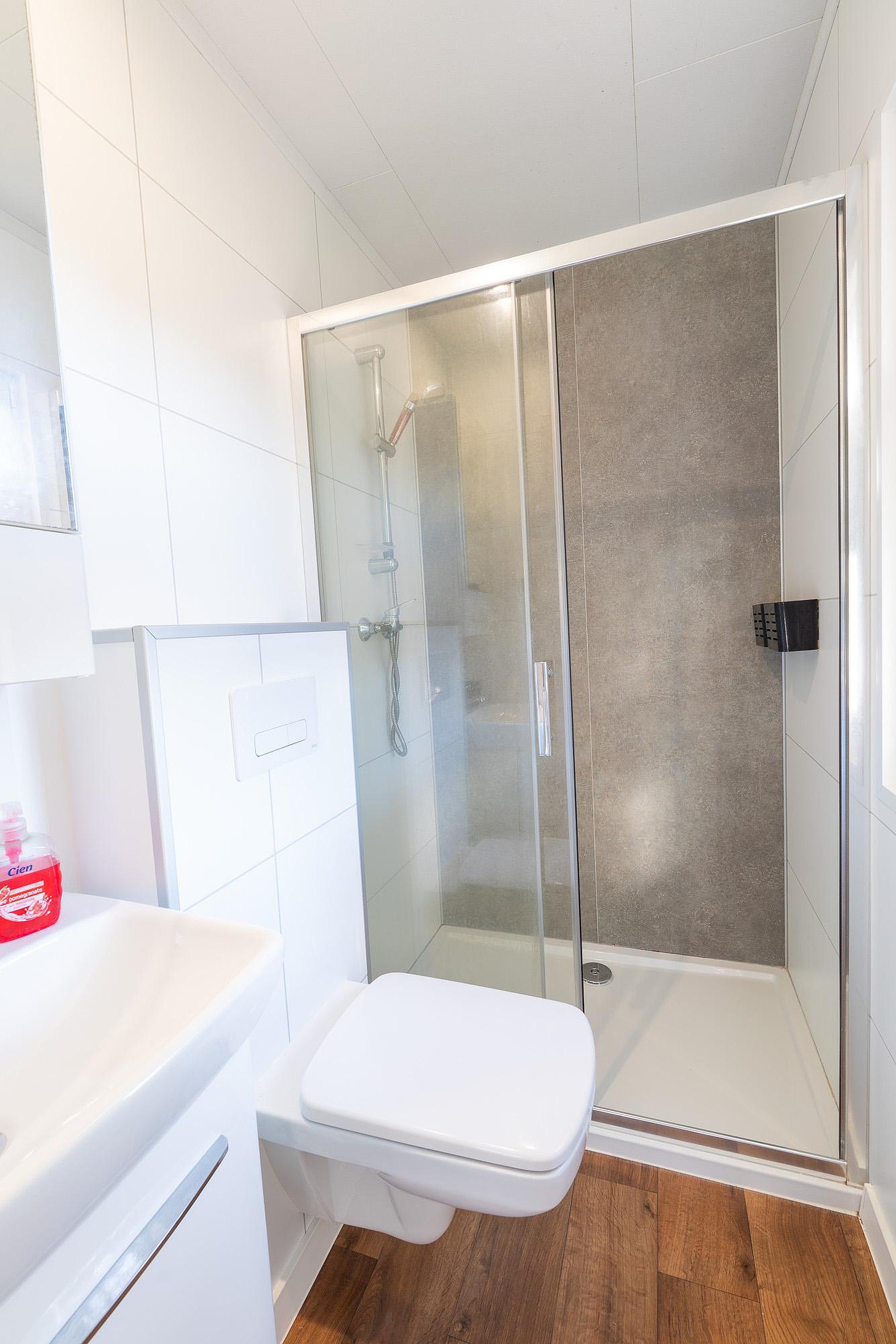 De badkamer is functioneel en modern afgewerkt. Hier treft u een ruime douchecabine, een wastafel met meubel en een toilet aan. De afwerking in neutrale tinten zorgt voor een frisse uitstraling die perfect past bij het vakantiegevoel.