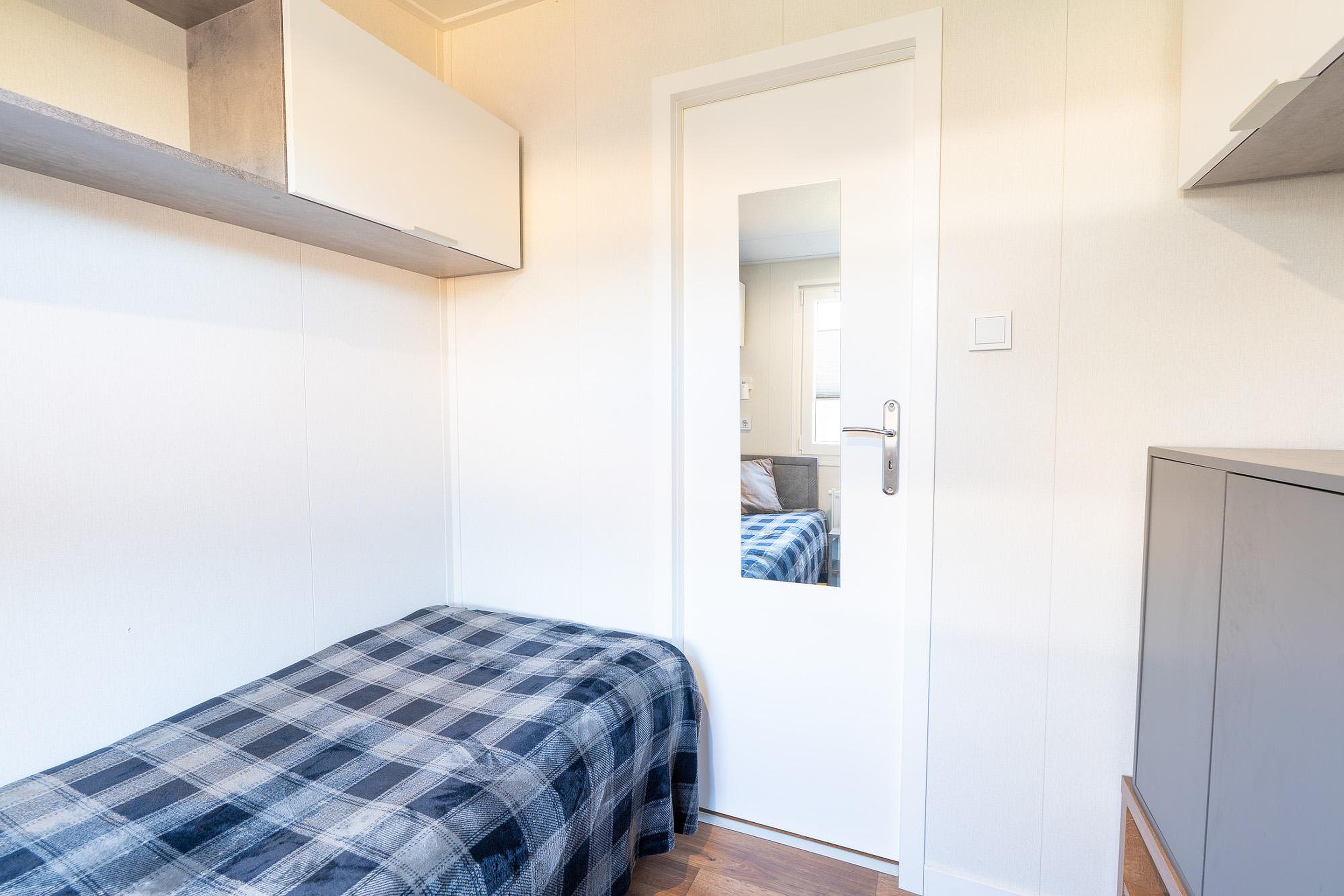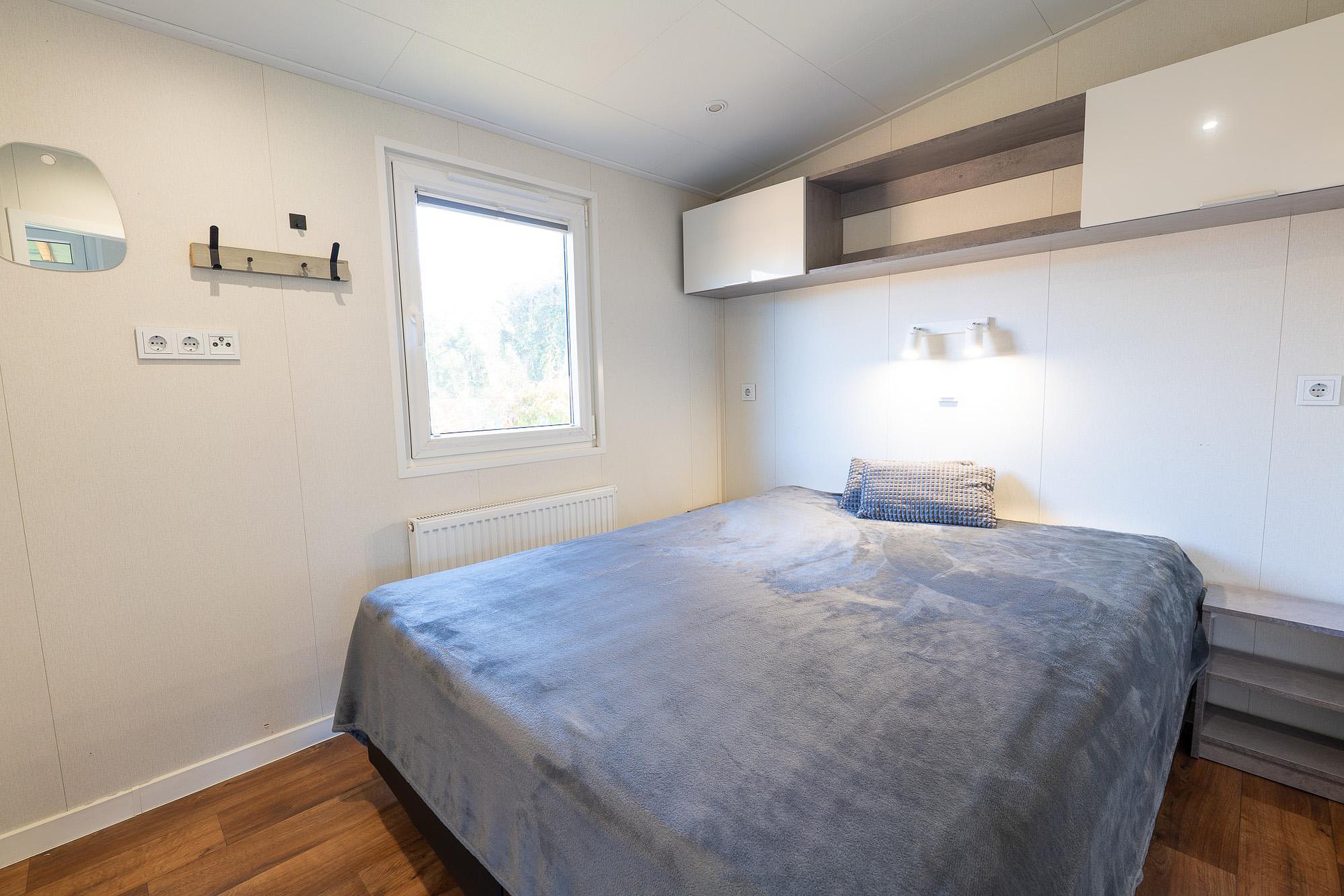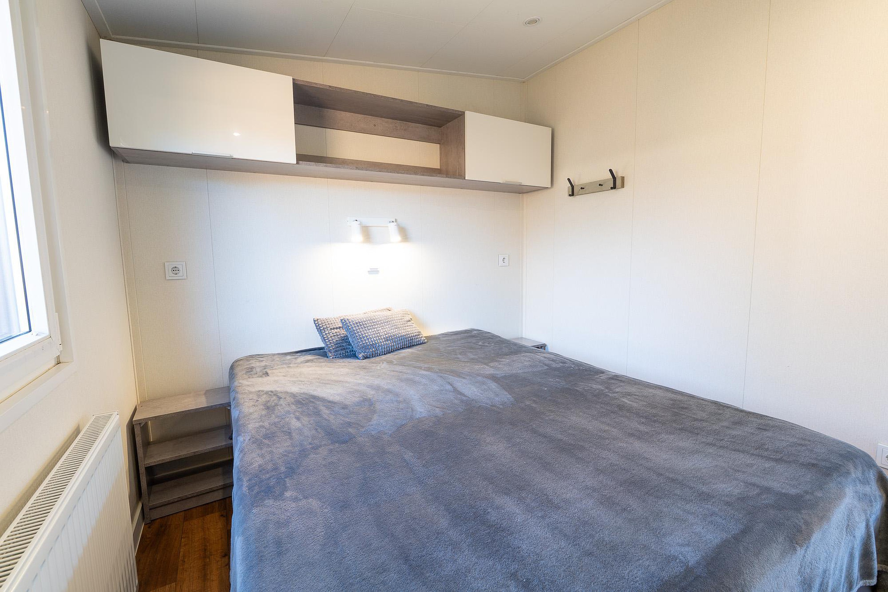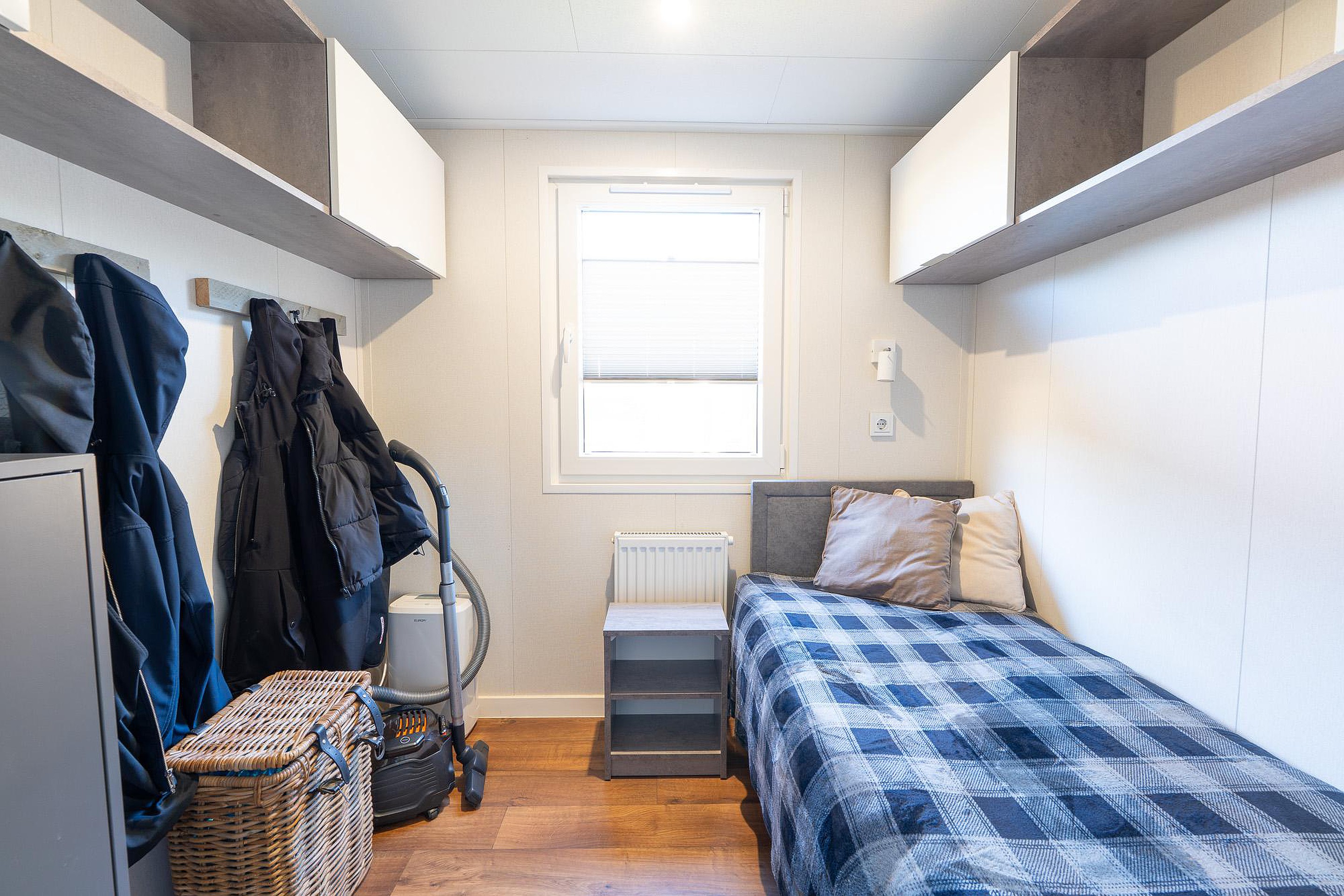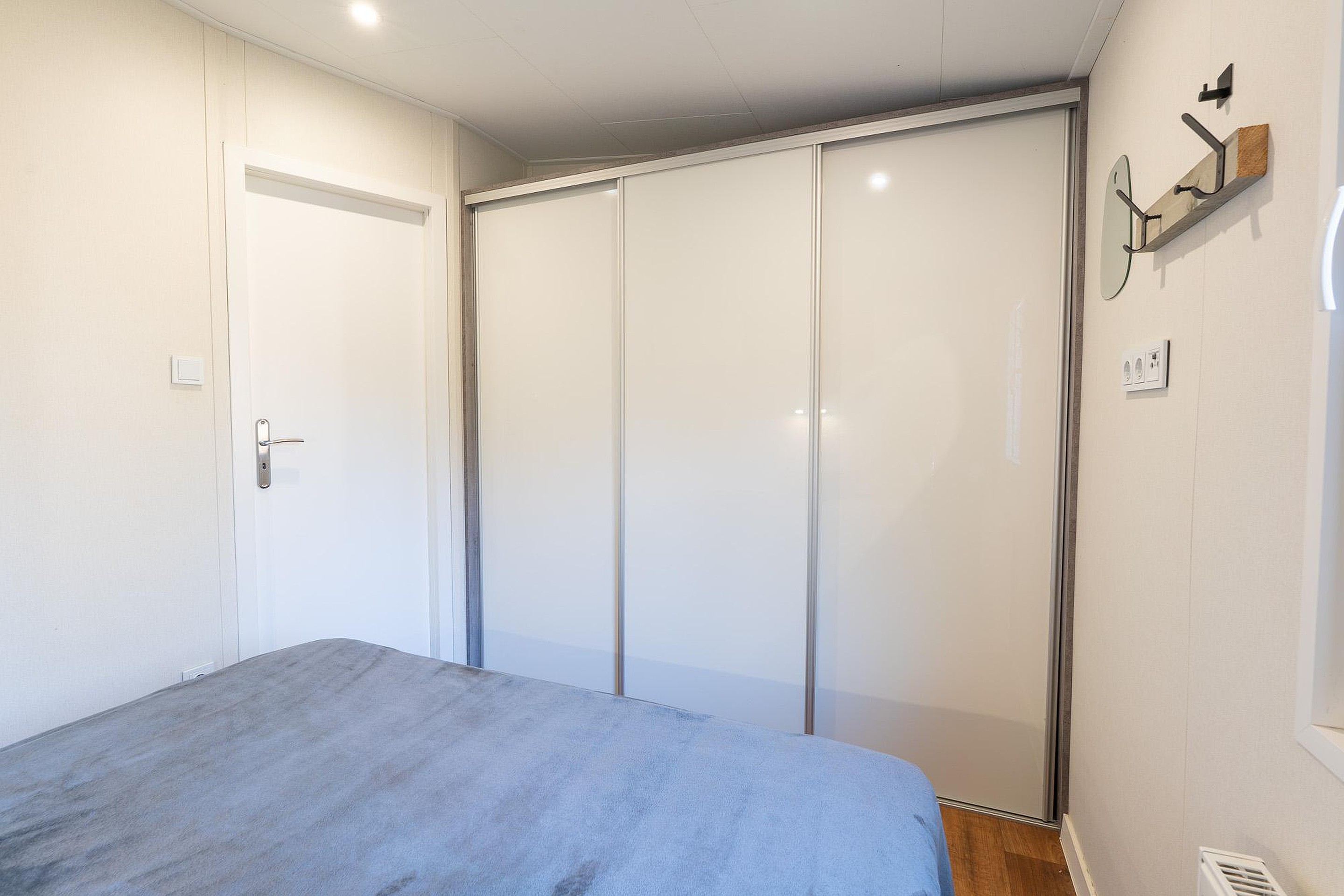Het chalet beschikt over twee goed ingedeelde slaapkamers. De hoofdslaapkamer is uitgerust met een comfortabel tweepersoonsbed en een vaste kastenwand voor uw garderobe. De tweede slaapkamer is momenteel voorzien van één bed, maar de afmetingen laten het toe om hier een tweede bed te plaatsen, ideaal voor gasten of kinderen. Slimme bergruimte vindt u terug in de kasten die boven de bedden zijn gemonteerd, waardoor de vloeroppervlakte vrij blijft.