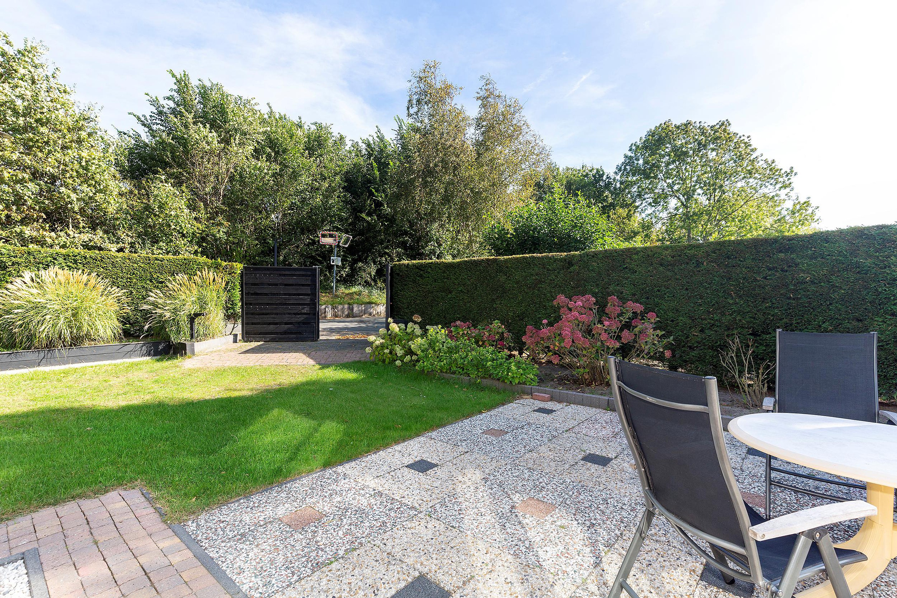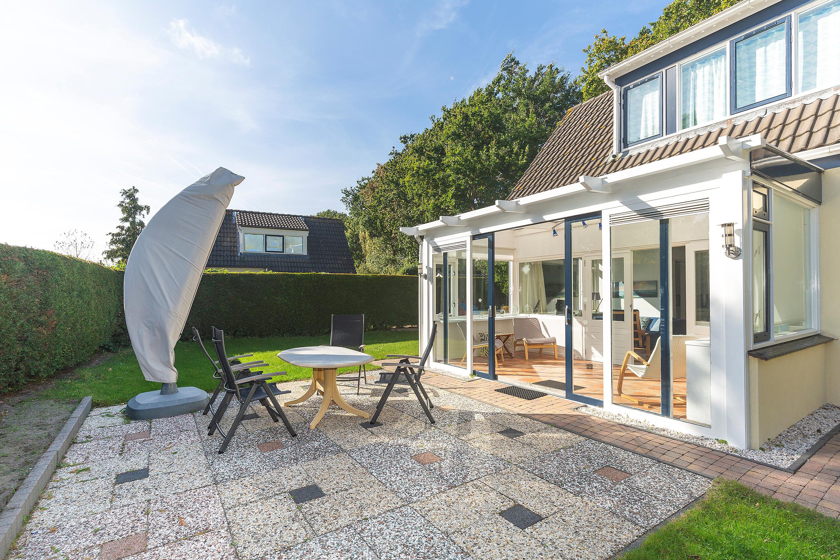 Tuin De tuin rondom de woning is keurig aangelegd, met een combinatie van gazon en bestrating. Hierdoor zijn er zowel aan de achterzijde als aan de voorzijde van de serre zitgelegenheden gecreëerd, waardoor er diverse plekjes zijn om van de zon te genieten. De heg die het perceel omringt, draagt bij aan extra privacy en beschutting.