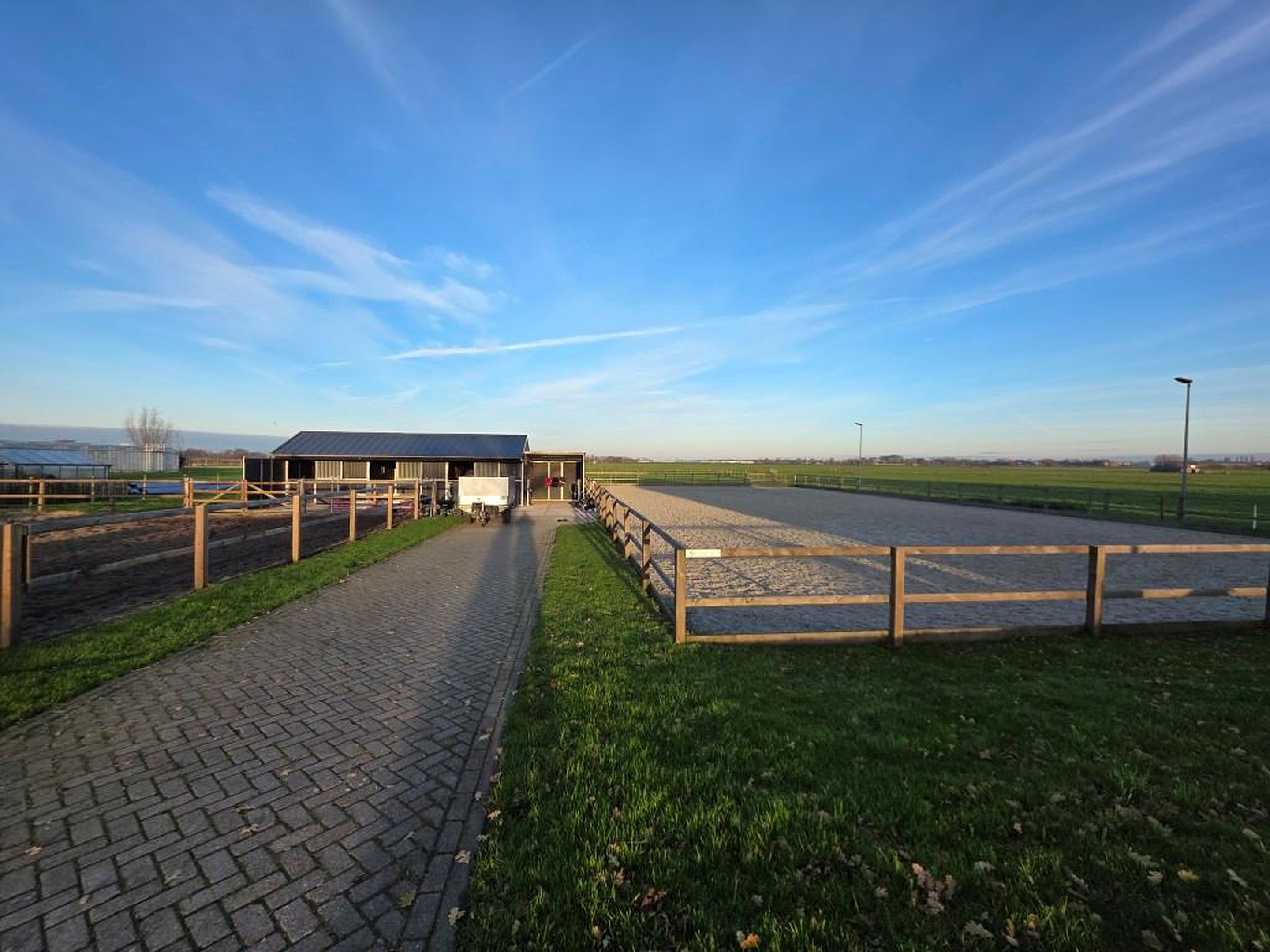 De paardenbak meet 40 x 20 meter en is voorzien van een hoogwaardige Zorgdrager eb- en vloedbodem, houten omheining en verlichting.