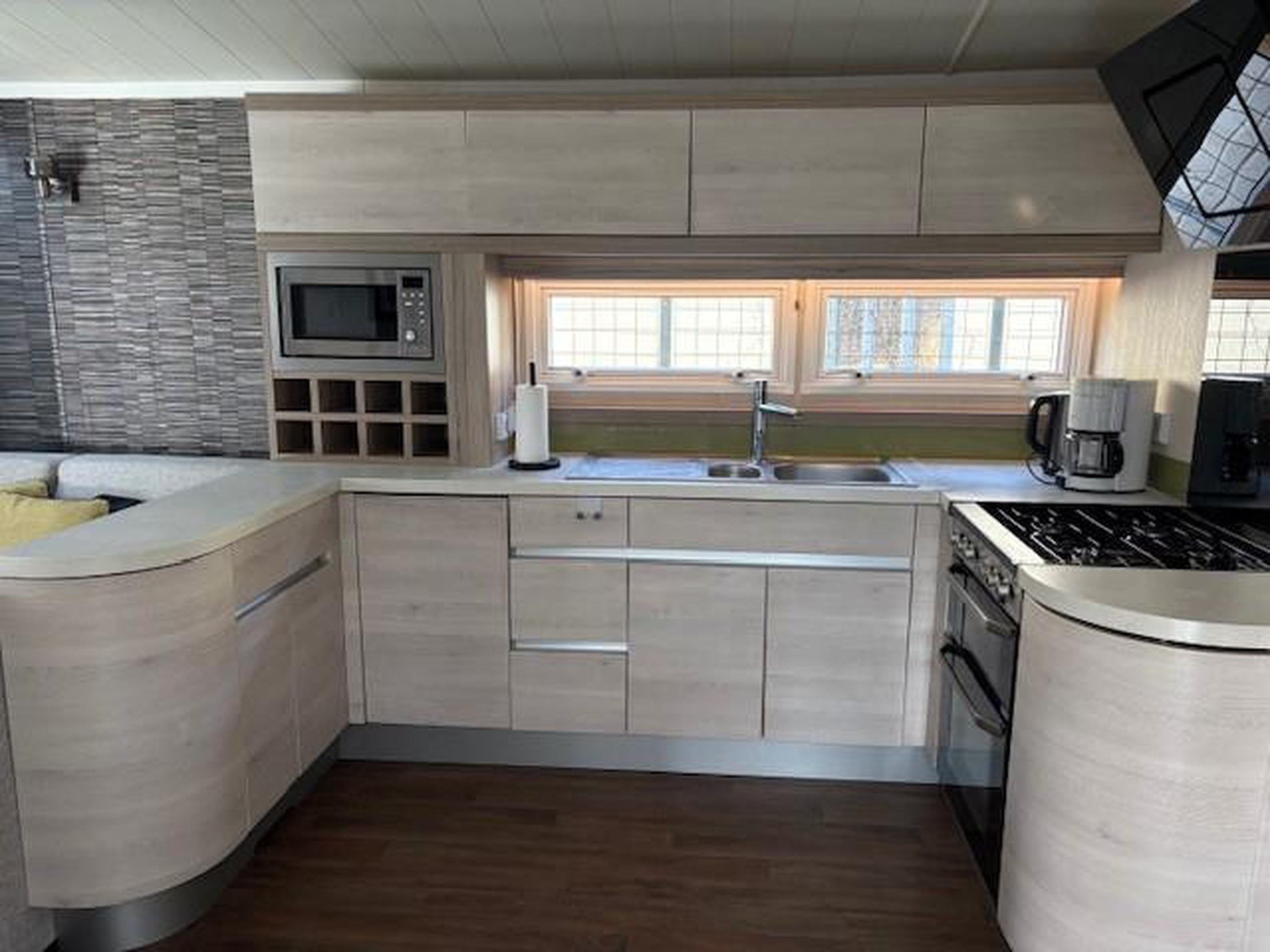 Begane grond Entree via de zeer ruime serre, eenmaal binnen, ruime woonkamer met twee schuifpuien welke toegang geven tot de serre, bank welke ook tot slaapbank kan worden omgebouwd, open keuken met diverse inbouwapparatuur zoals een kookplaat, afzuigkap, koelkast, oven en vaatwasser, halletje met toegang tot de slaapkamers en badkamer, in de badkamer een douchecabine, wastafel en toilet, eerste slaapkamer met twee enkele bedden, tweede zeer ruime slaapkamer met ruime kastenwand en tweede toilet.