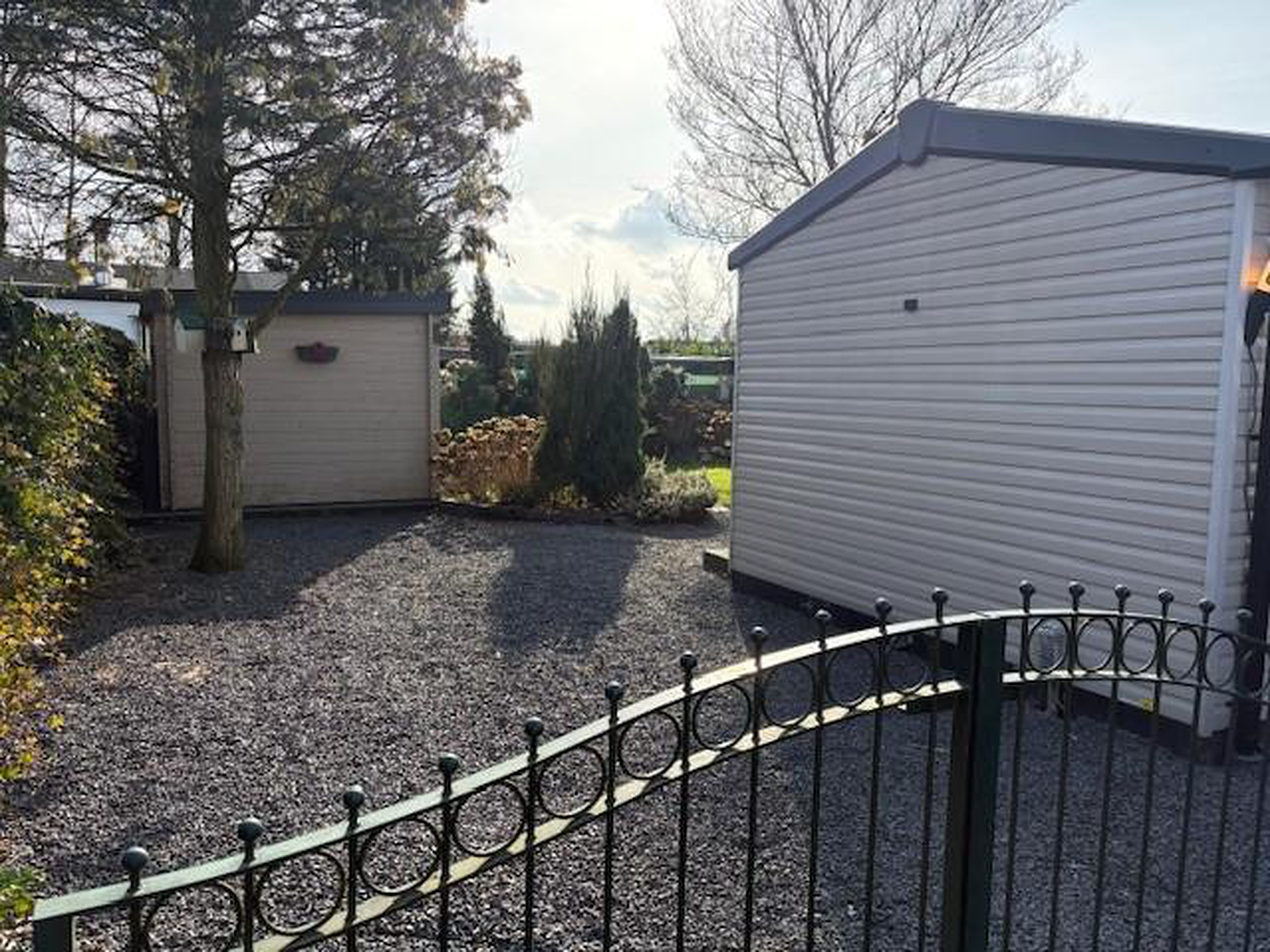 Zeer goed onderhouden recreatiechalet met twee slaapkamers, ruime Serre en schuurtje op een kavel huurgrond.