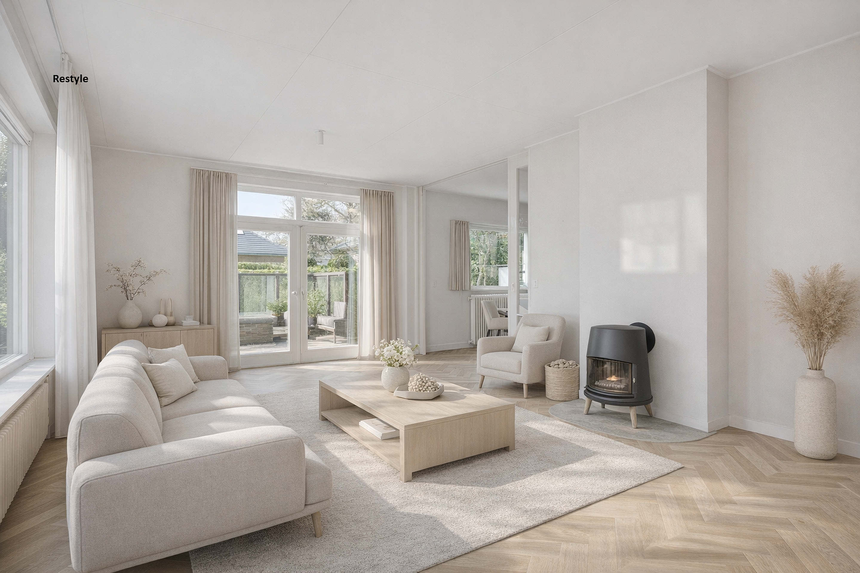 De woonkamer vormt het warme hart van de woning en biedt u een open en uitnodigende leefruimte. Dankzij de royale opzet kunt u hier moeiteloos een comfortabele zithoek en een gezellige eethoek creëren. De grote raampartijen zorgen voor een overvloed aan natuurlijk licht, wat de ruimte een frisse en aangename sfeer geeft. Vanuit de woonkamer heeft u bovendien direct toegang tot de tuin, waardoor binnen en buiten op een natuurlijke manier in elkaar overlopen.