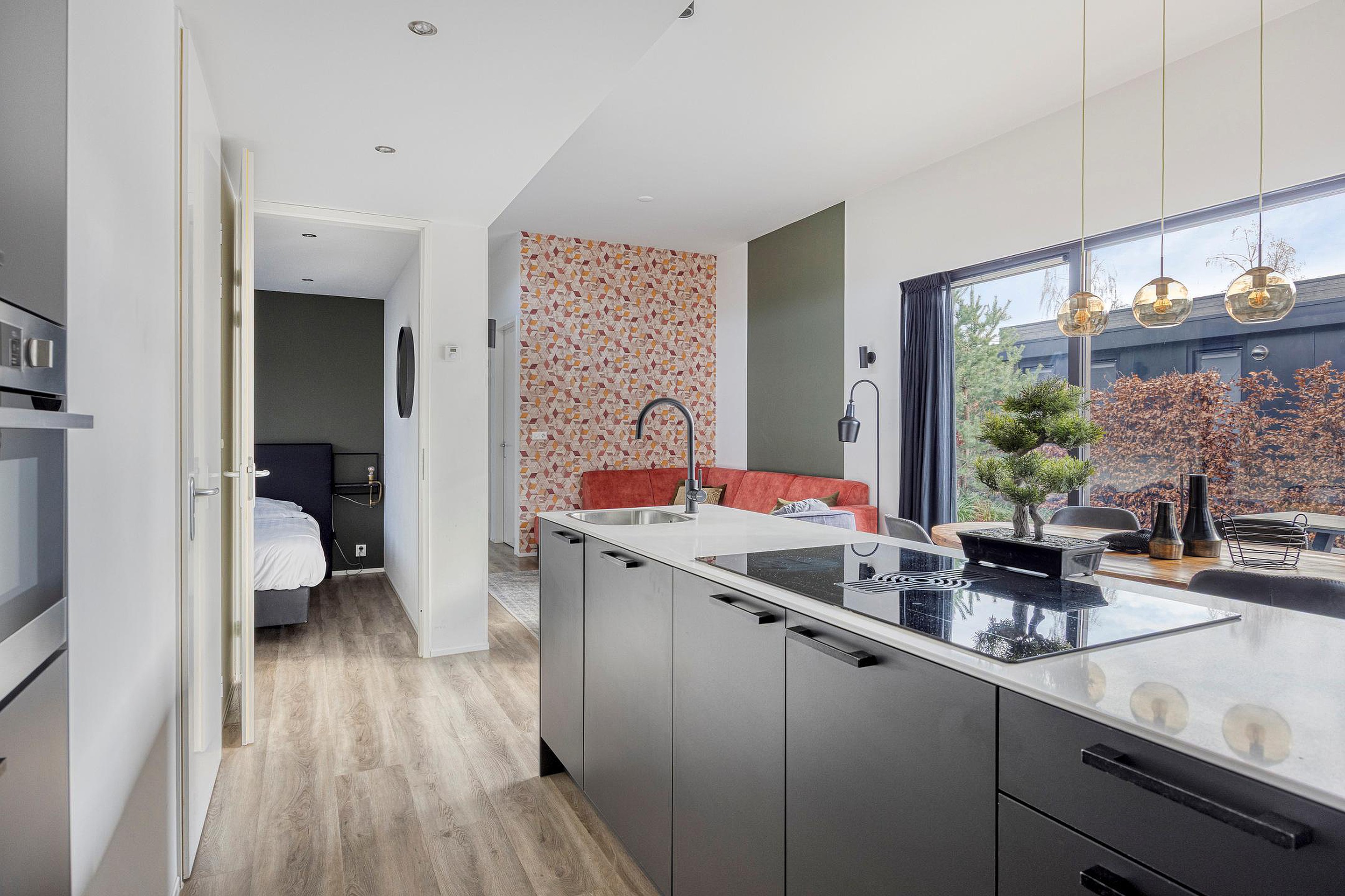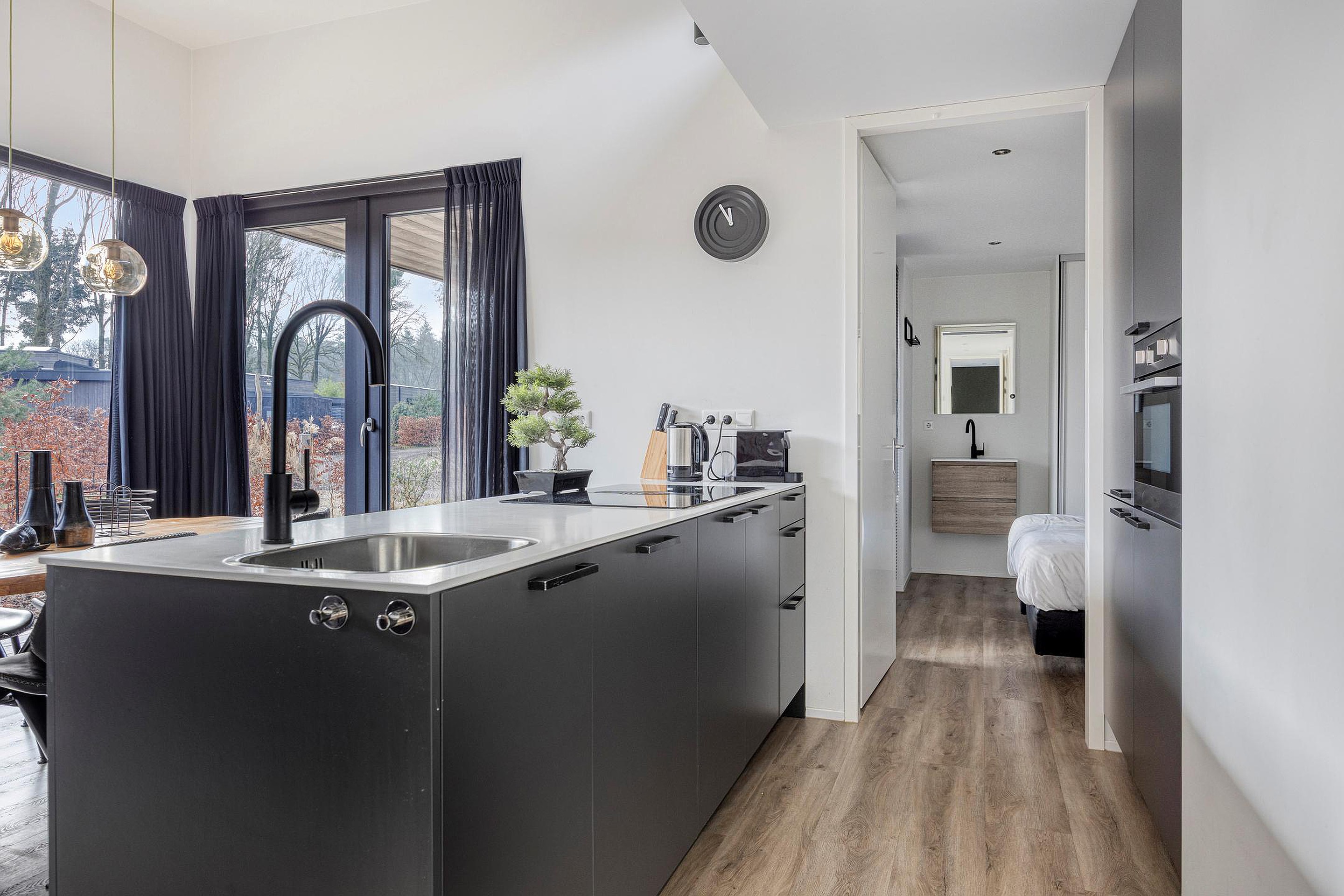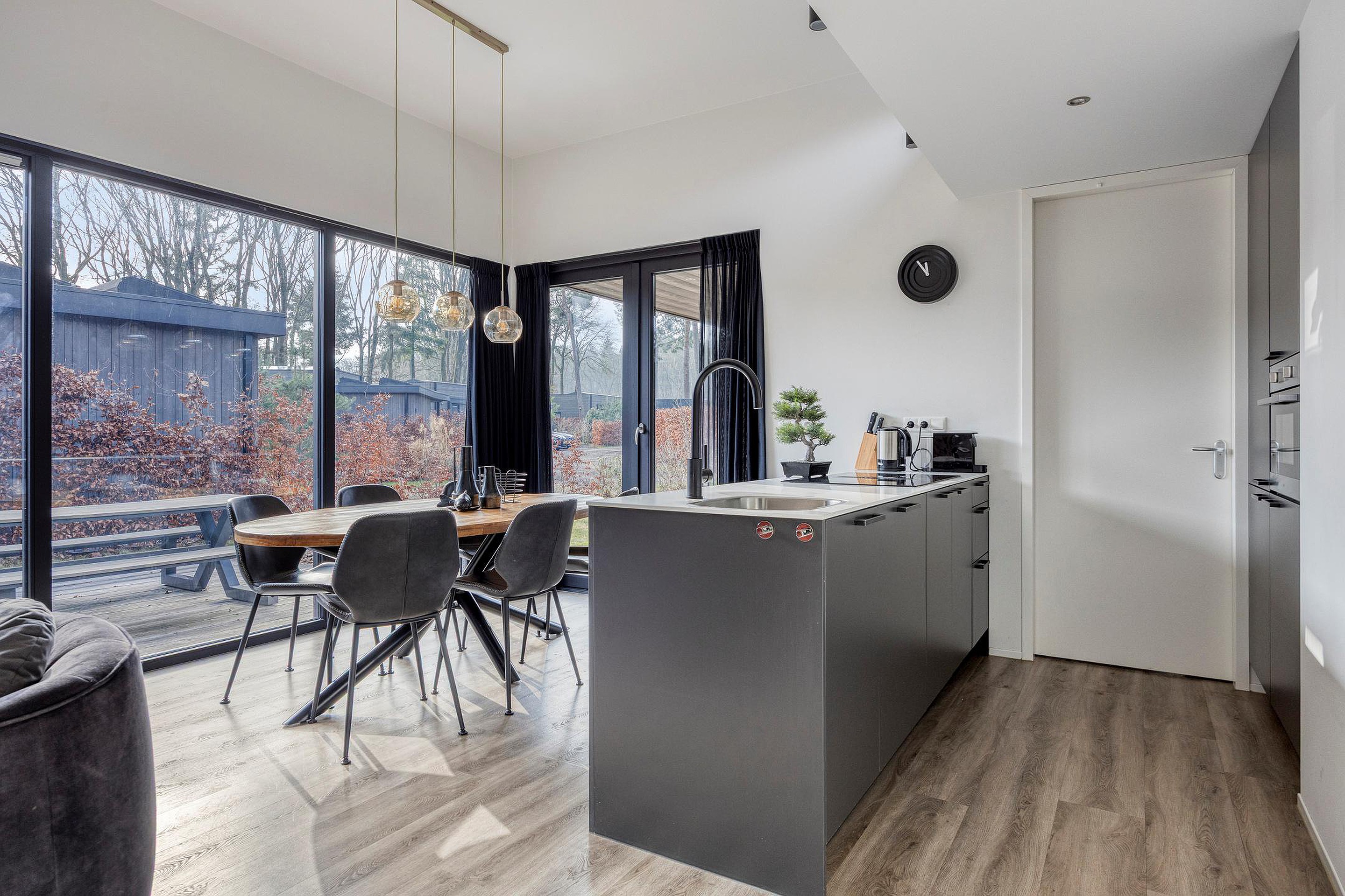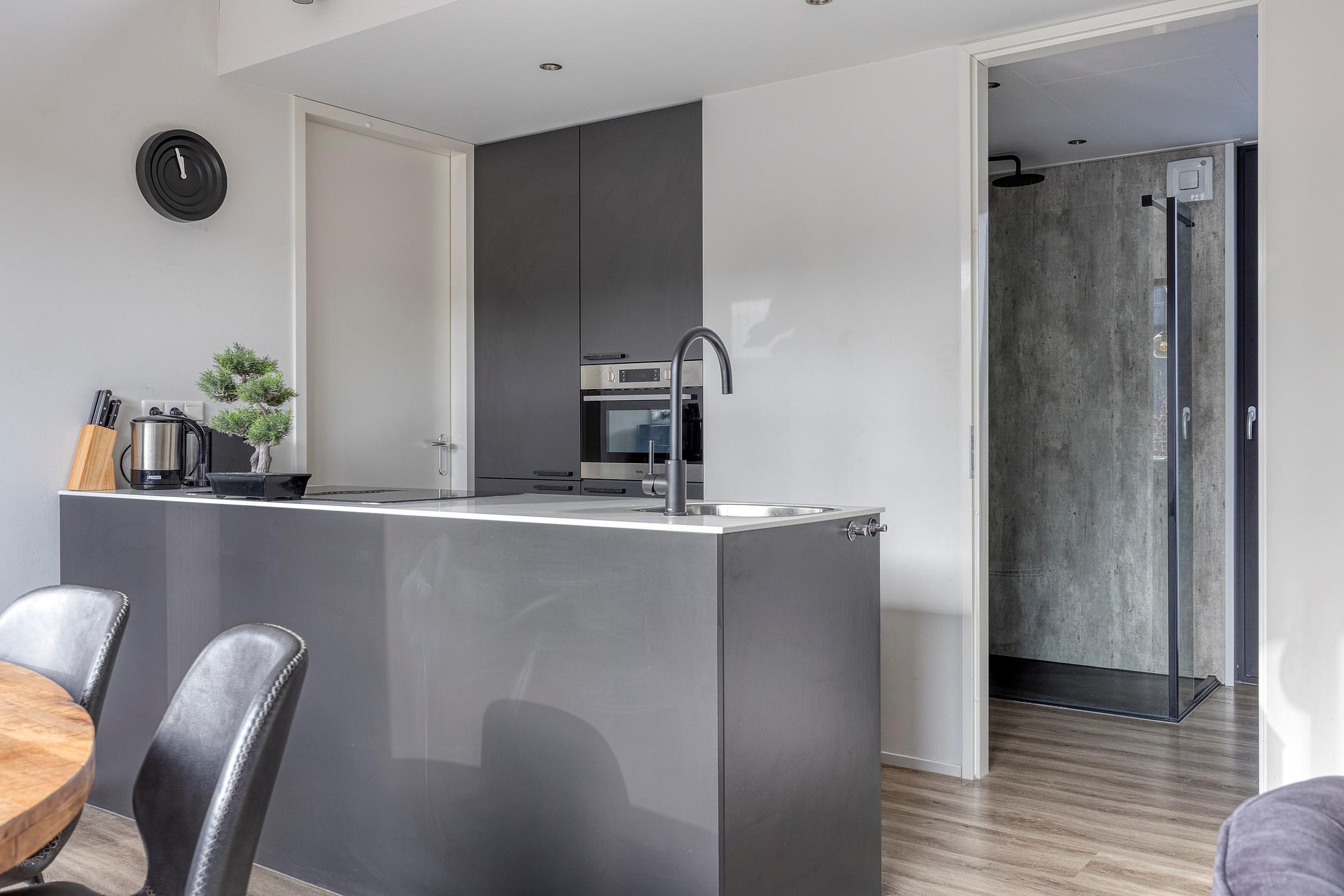 De keuken is strak en modern uitgevoerd, met een kookeiland en voorzien van hoogwaardige apparatuur, waaronder een inductiekookplaat met geïntegreerde afzuiging, combi-oven, vaatwasser en koel-/vriescombinatie. Alles is logisch gepositioneerd en praktisch in gebruik.