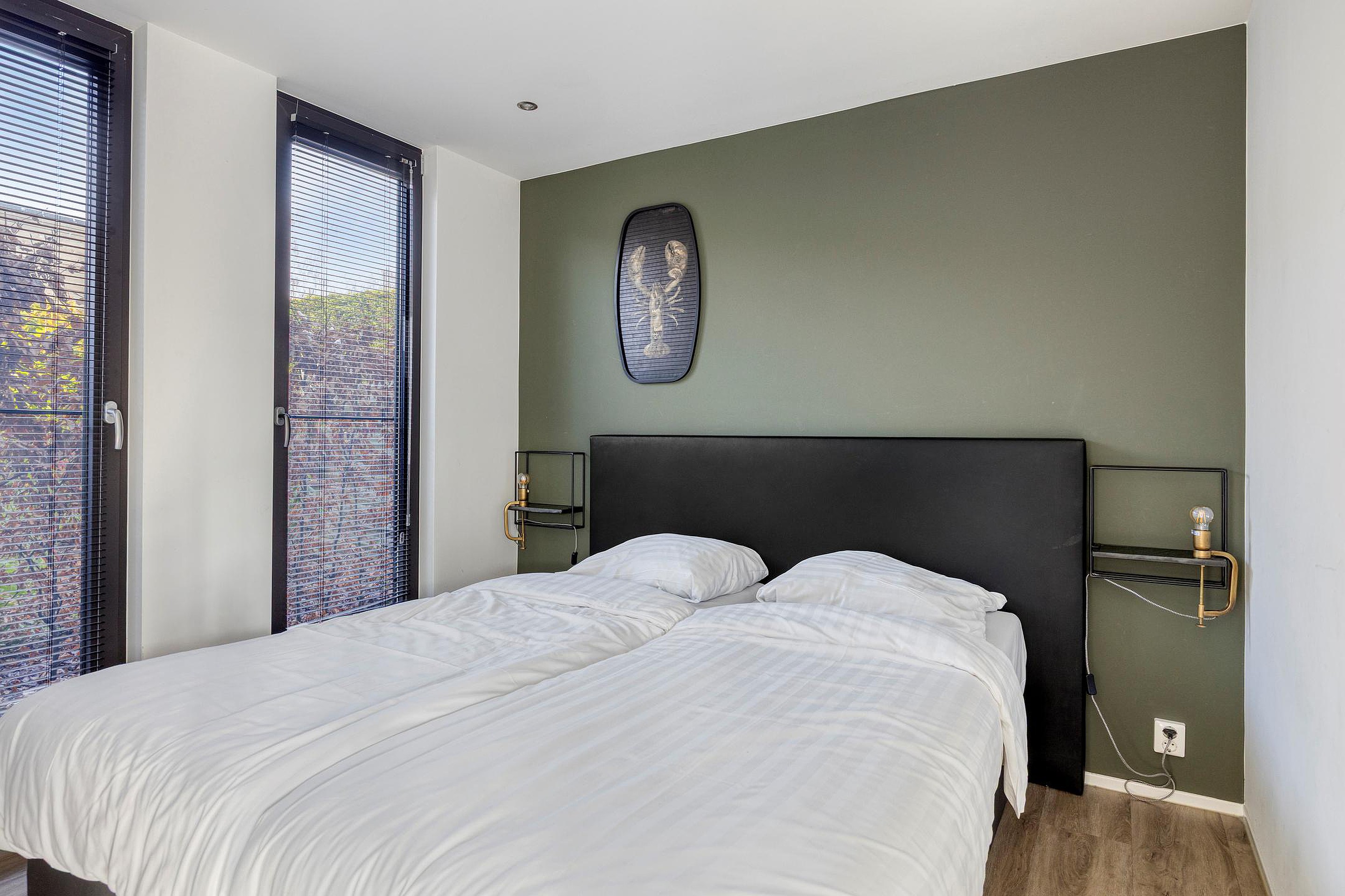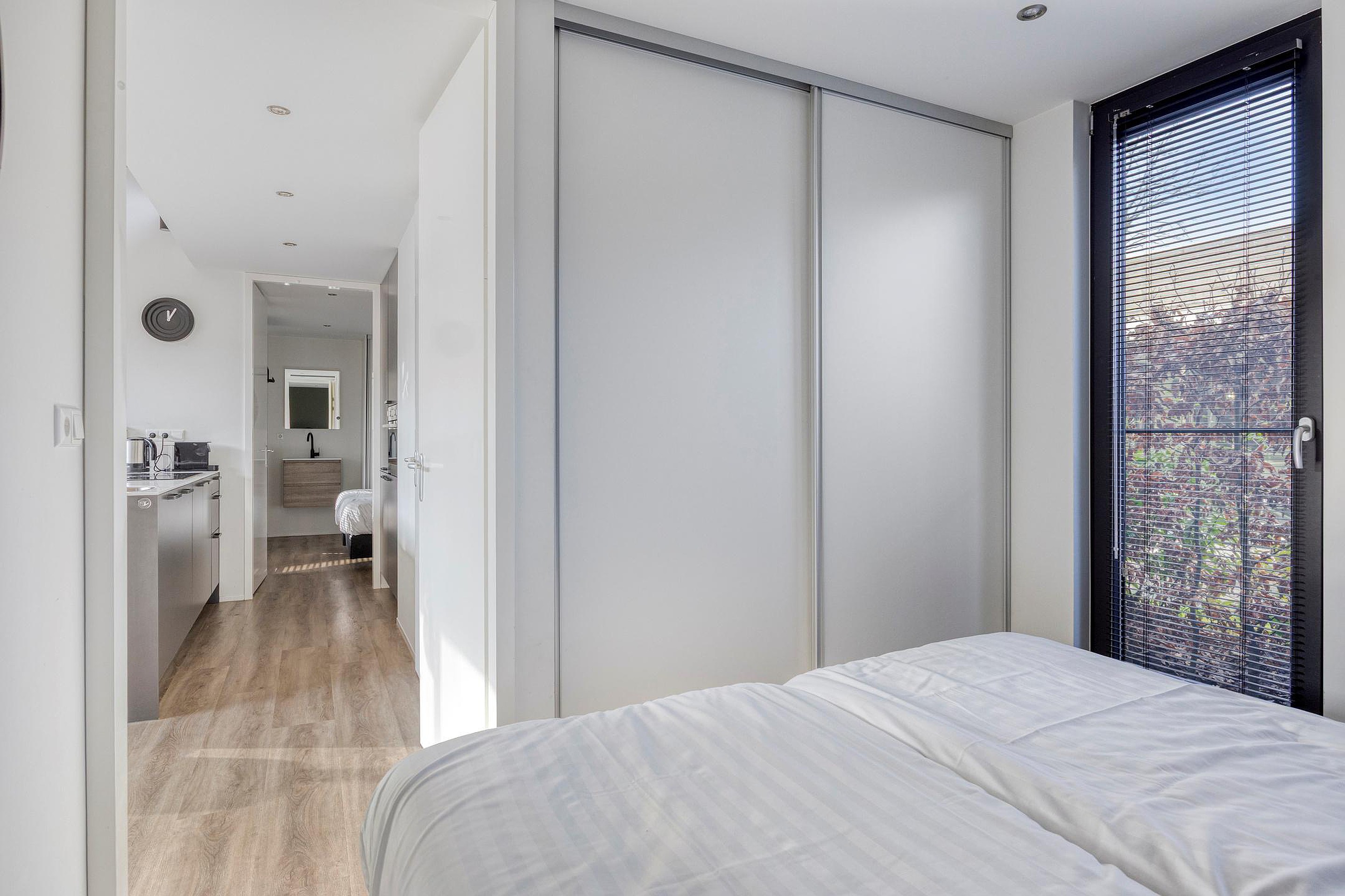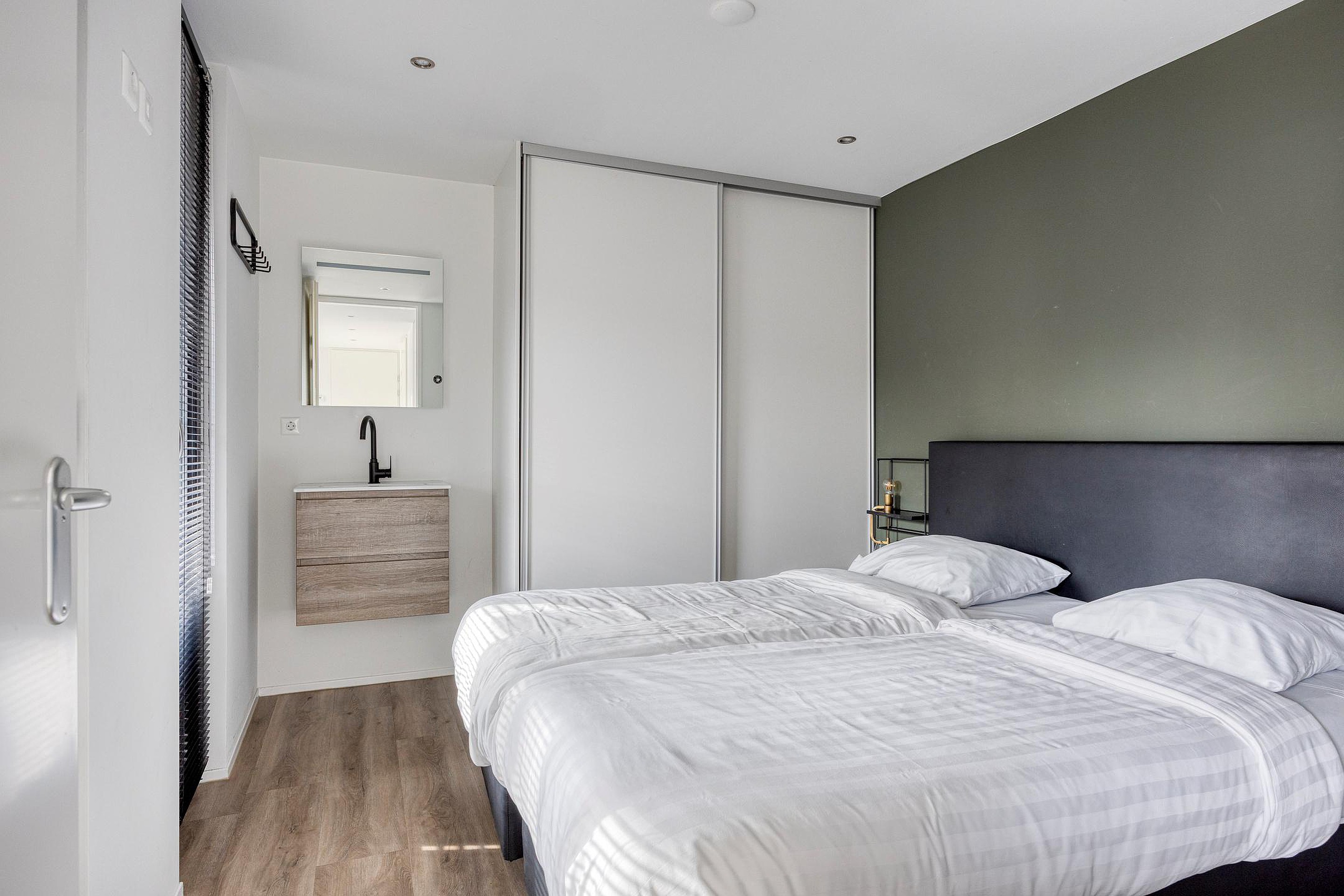 De drie slaapkamers zijn verdeeld over de woning, wat zorgt voor een prettige mate van privacy. Twee slaapkamers zijn voorzien van een ingebouwde wandkast, en alle kamers genieten van een nette afwerking. Centraal aan de rechterzijde ligt de badkamer, uitgevoerd met een inloop regendouche, een wastafelmeubel, wandcloset en een groot draai-kiepraam voor ventilatie en daglicht.