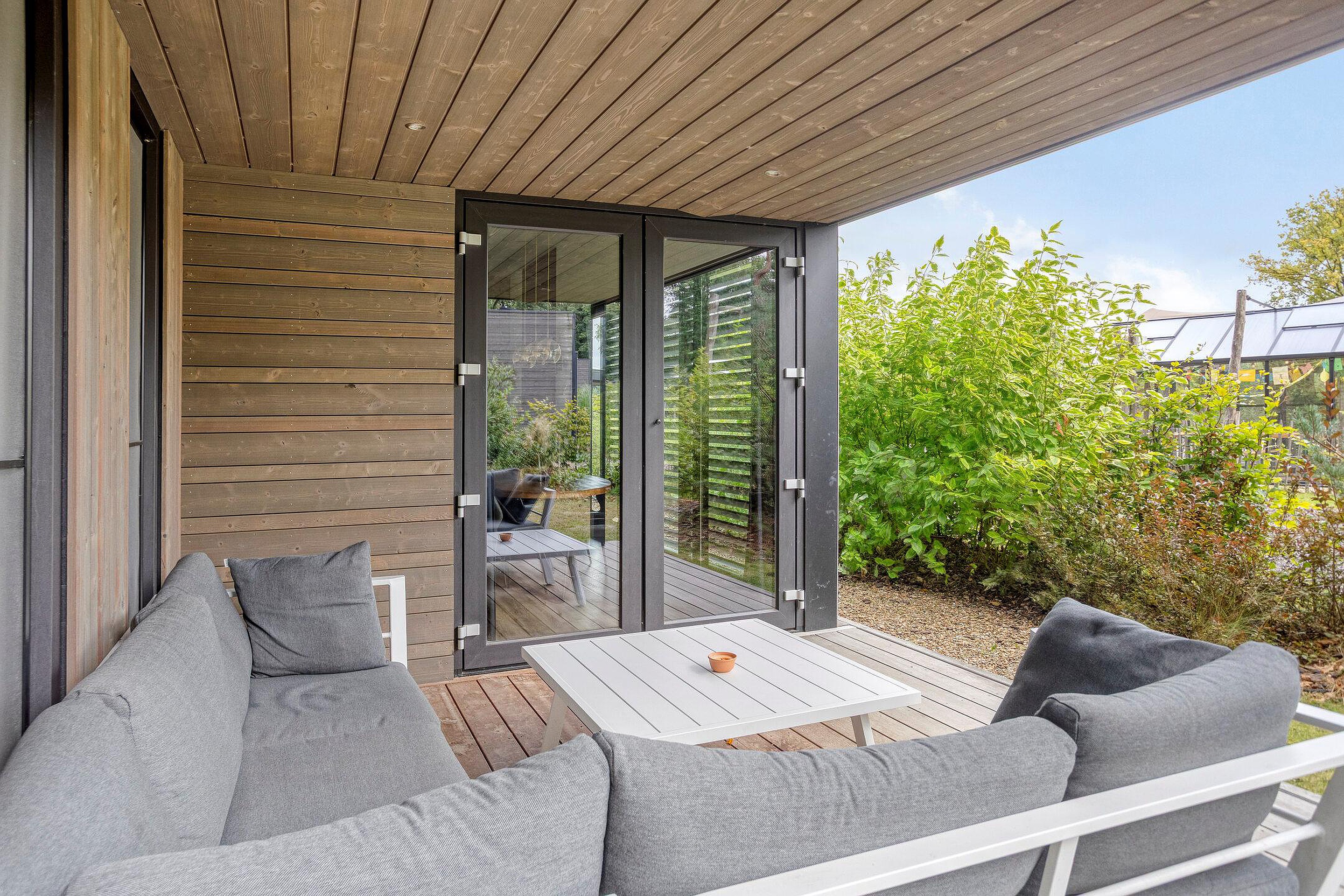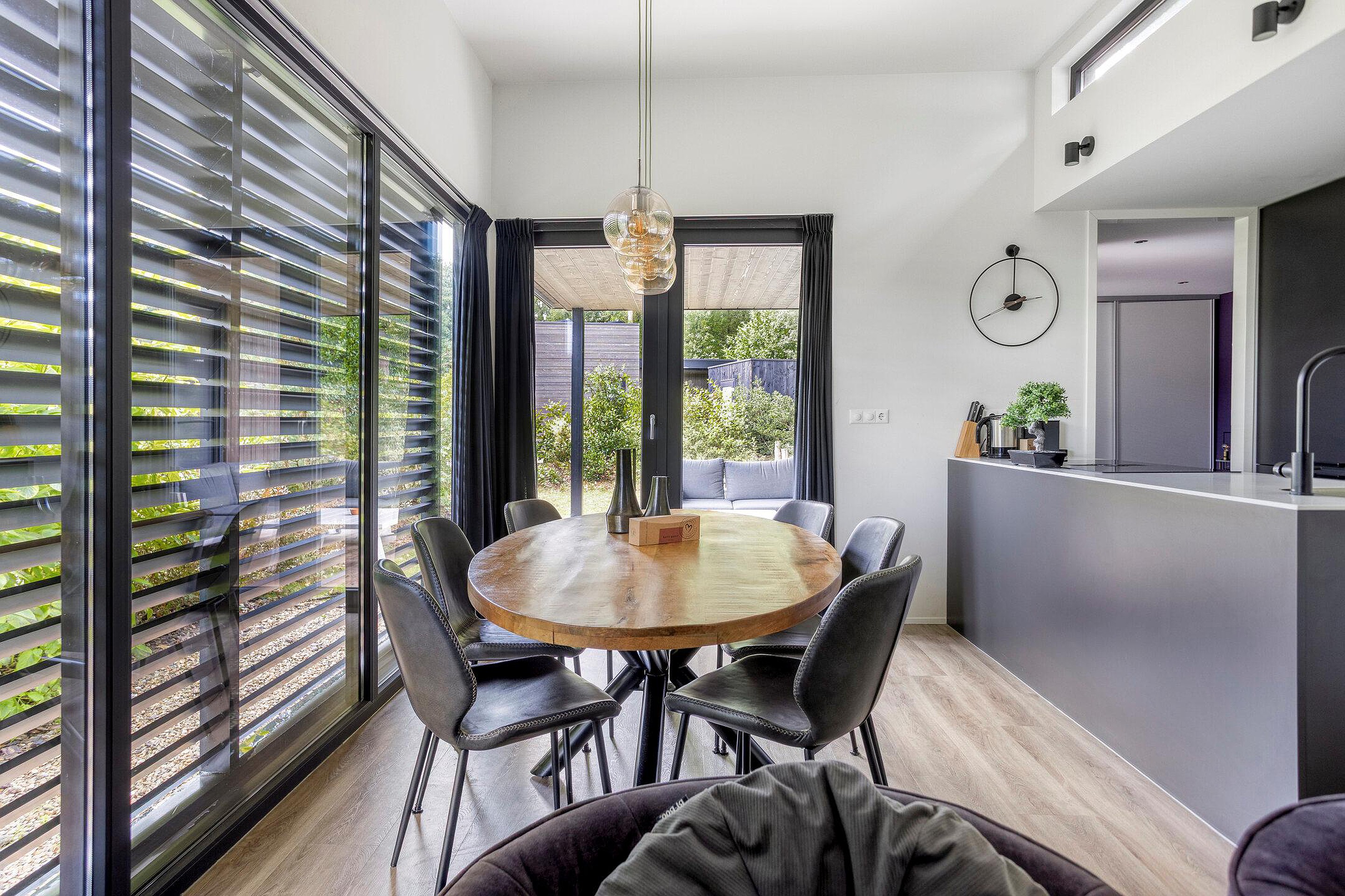 De woonkamer is ruimtelijk en licht, met grote raampartijen die uitzicht bieden op de omringende tuin. De indeling maakt het eenvoudig om een gezellige zithoek en een eetgedeelte te combineren. Via de openslaande deuren loopt u direct door naar buiten, waardoor het binnen- en buitenleven naadloos in elkaar overlopen.