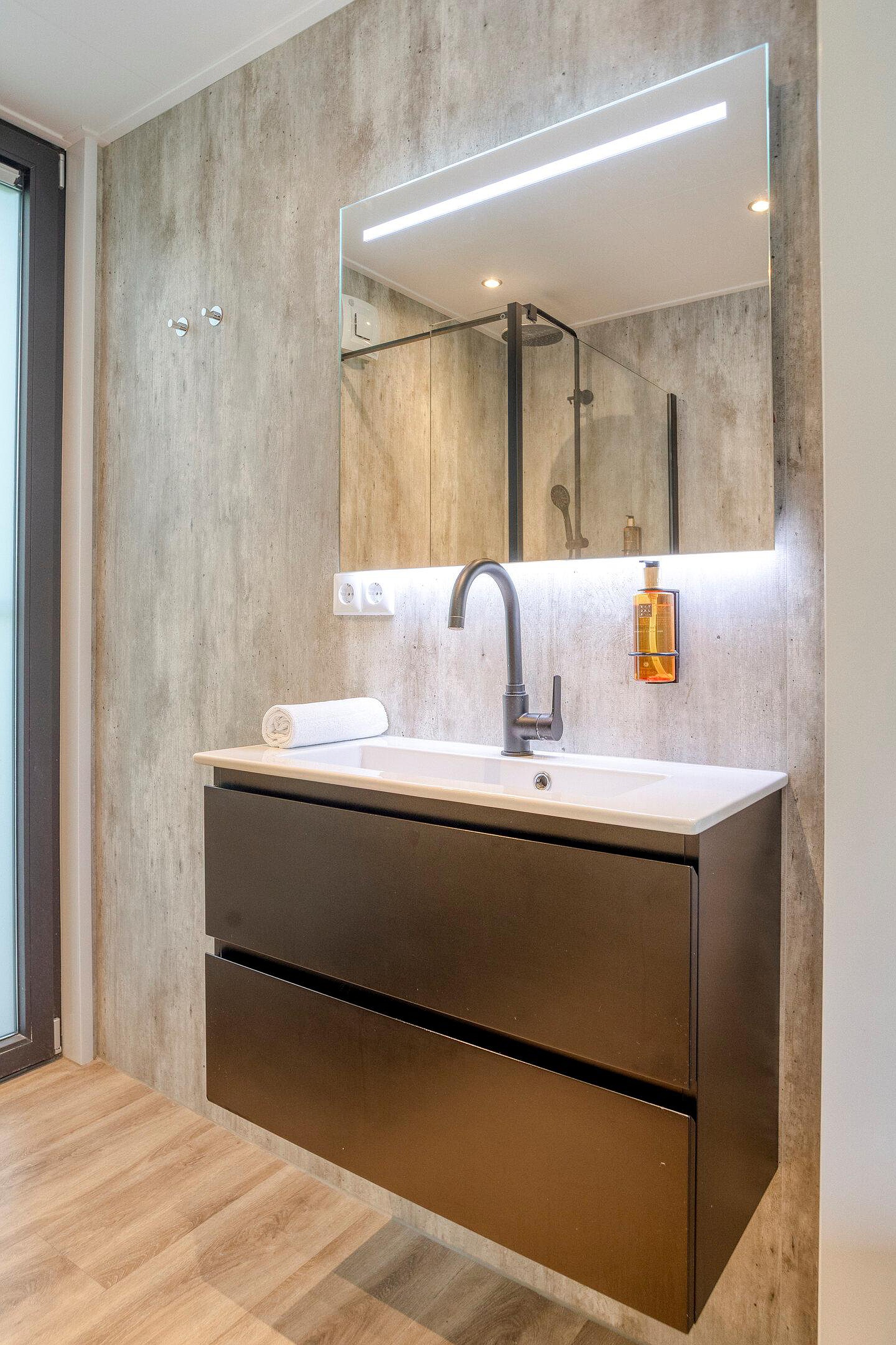 De badkamer is eigentijds ingericht met een ruime douche met glazen scheidingswand, zwevend toilet en een wastafelmeubel met opbergruimte. De moderne faciliteiten en strakke afwerking creëert een prettige, ontspannen sfeer. Daarnaast is er een apart toilet aanwezig.