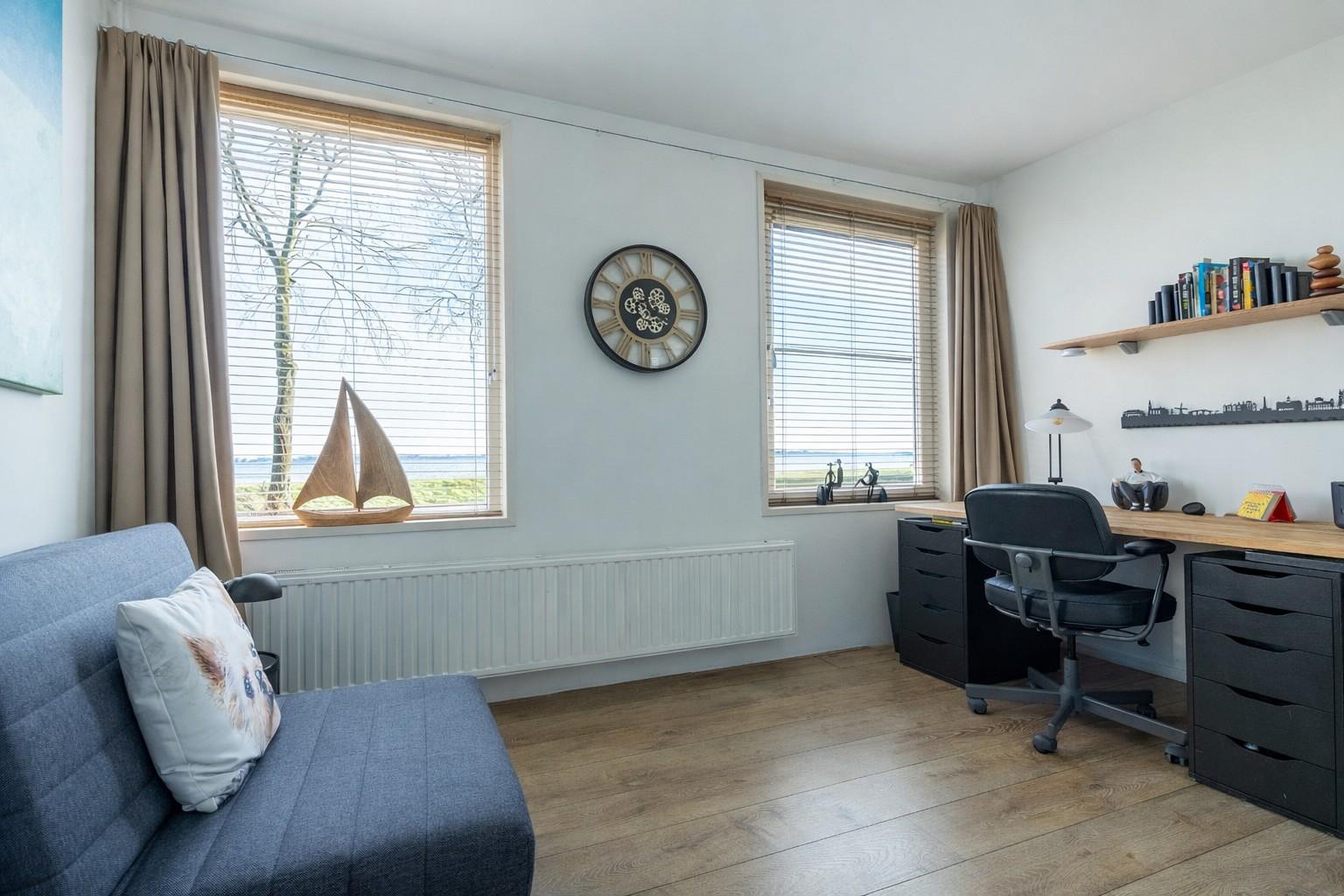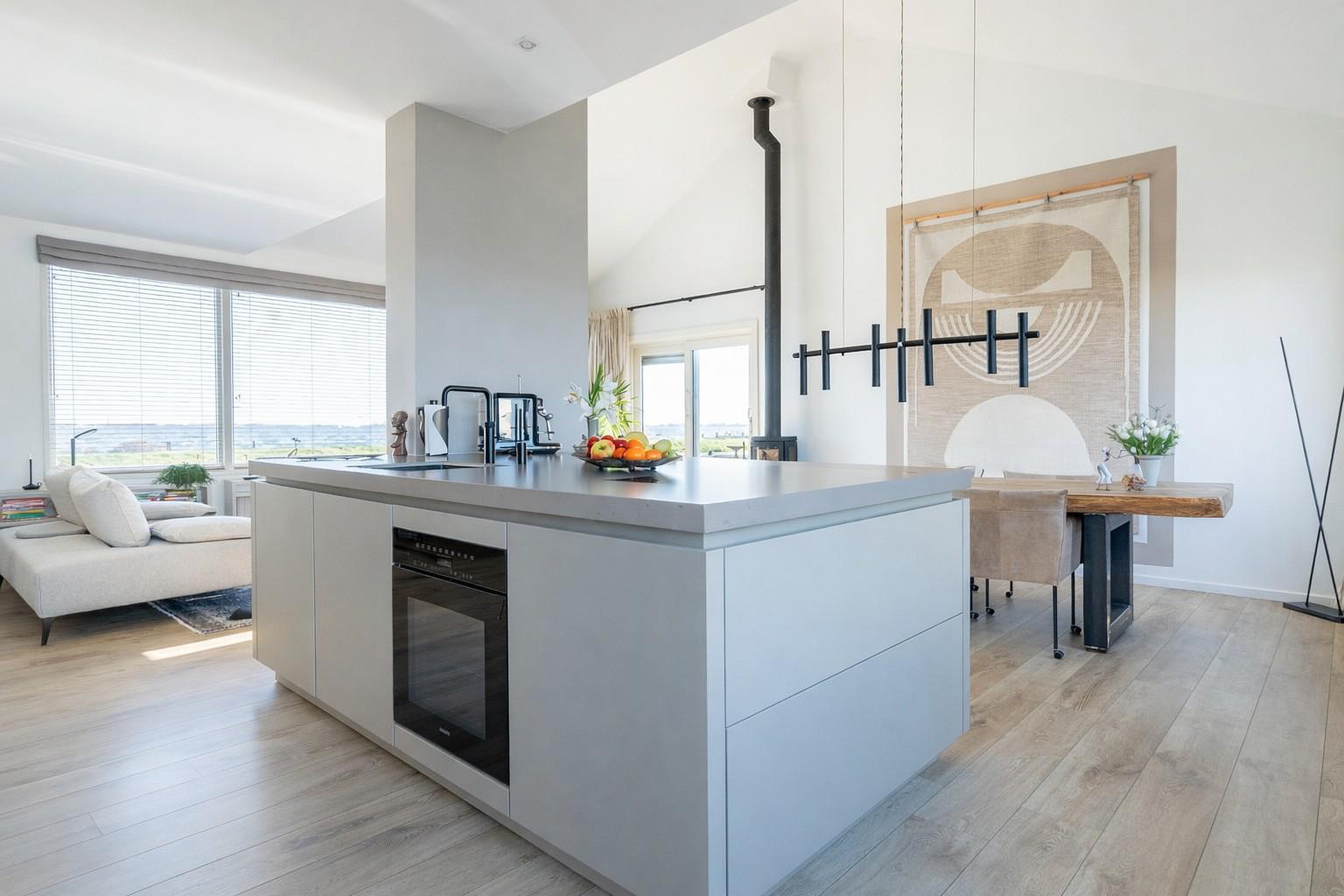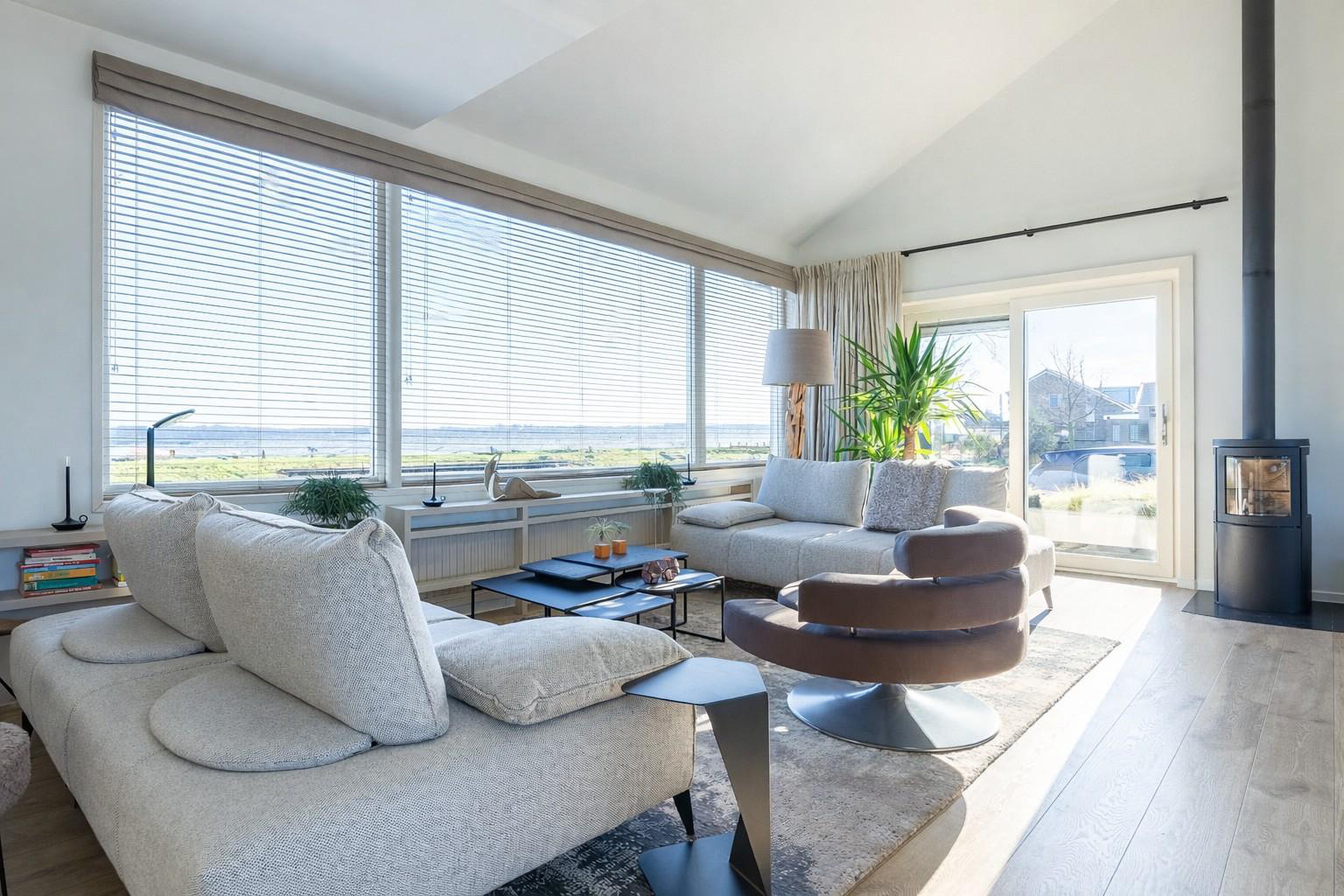 Vanuit de woonkamer, keuken én vanaf het hardhouten terras aan de voorzijde kijk je prachtig weg over het water. Het steeds wisselende licht, de wolkenluchten en de boten die langs varen maken het uitzicht iedere dag opnieuw bijzonder.