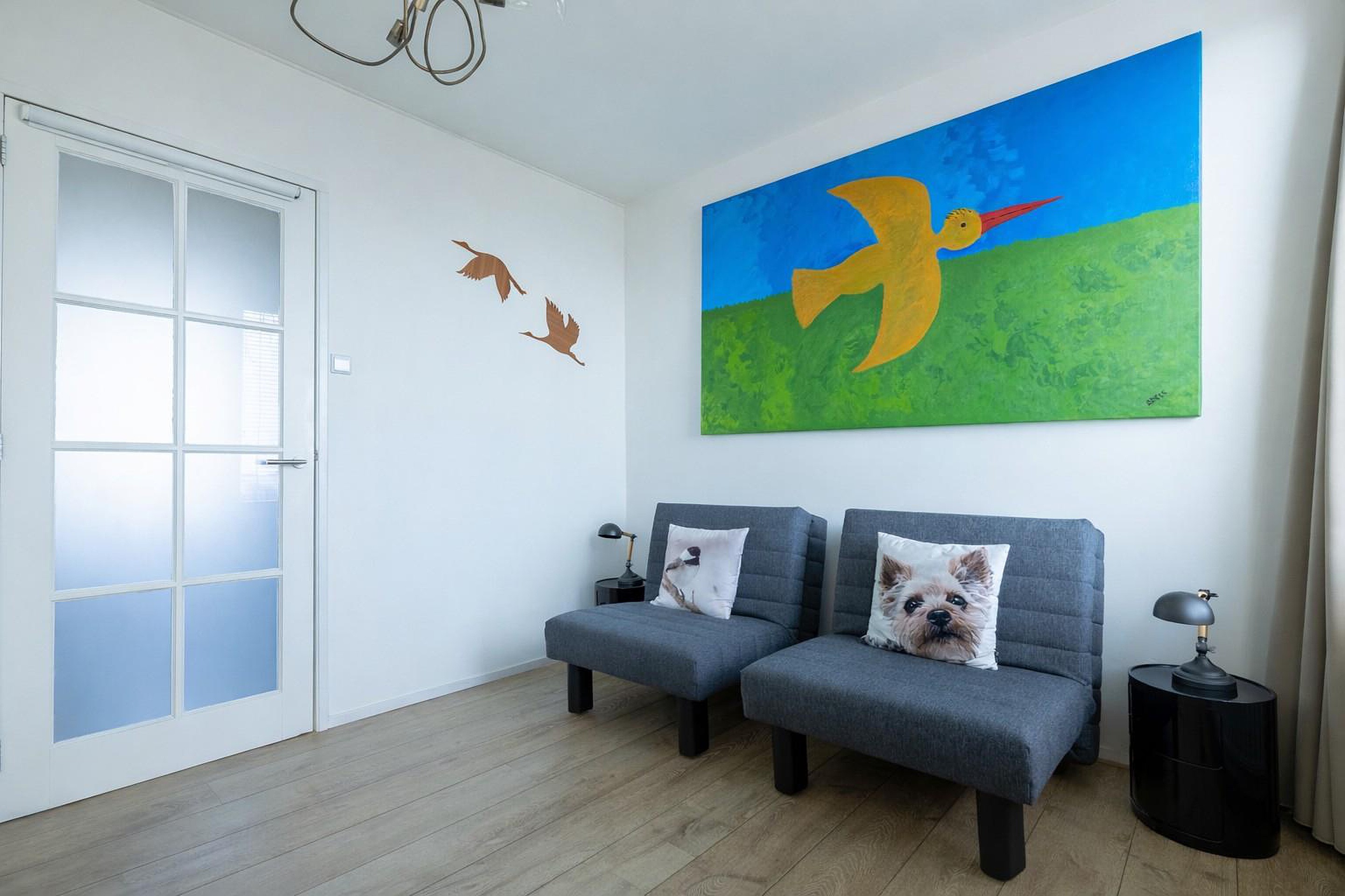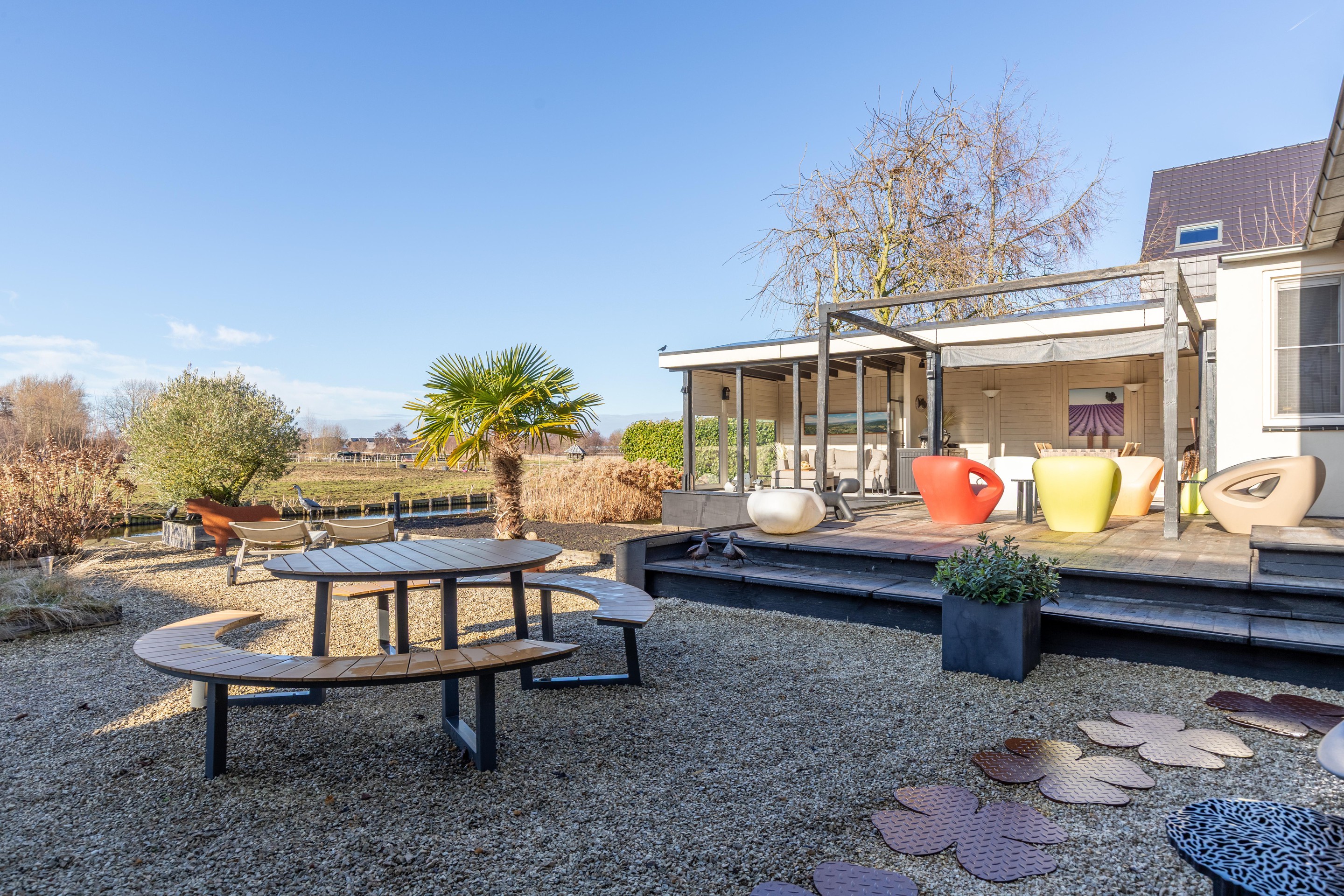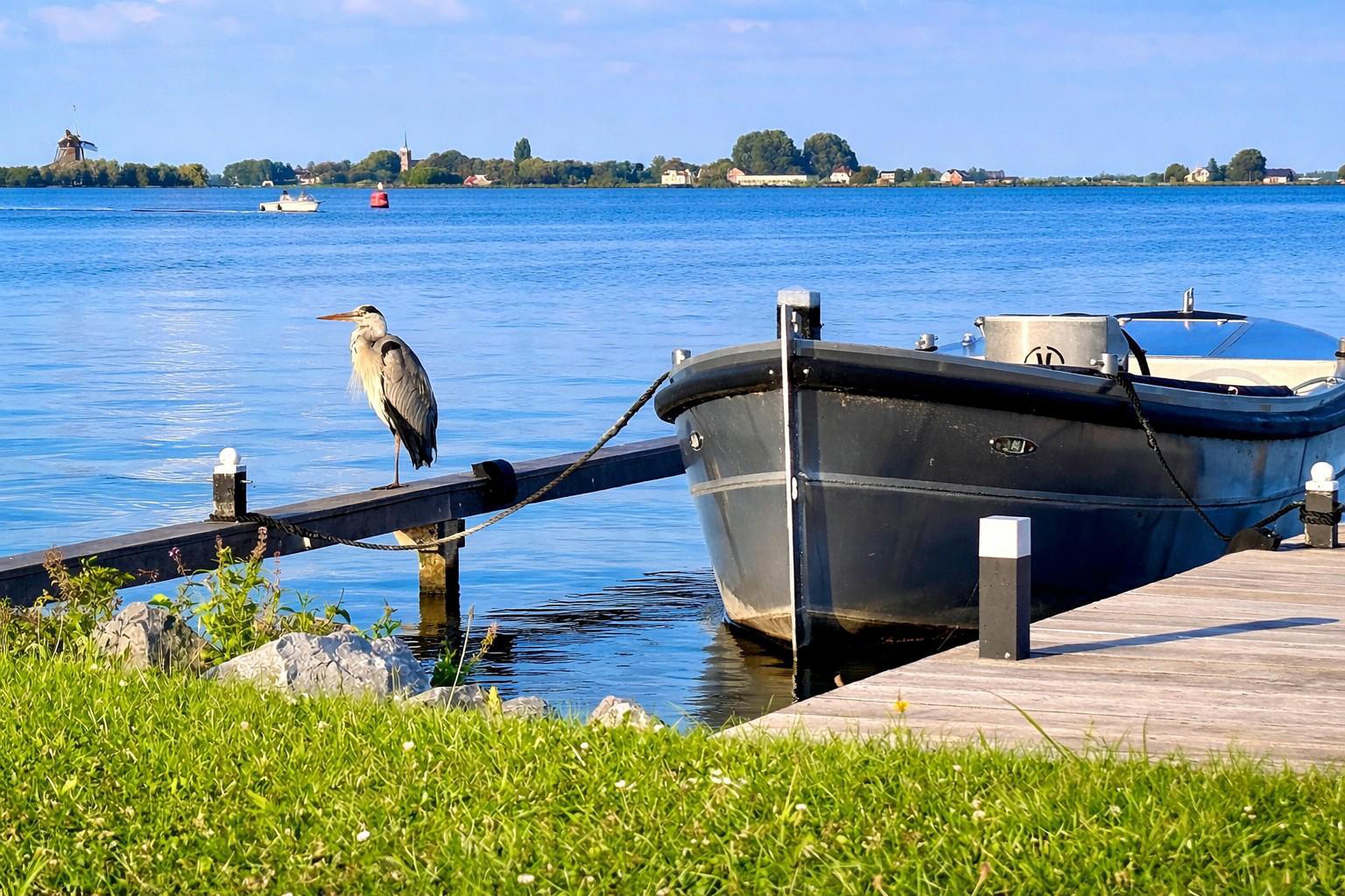 Vanuit de woonkamer, keuken én vanaf het hardhouten terras aan de voorzijde kijk je prachtig weg over het water. Het steeds wisselende licht, de wolkenluchten en de boten die langs varen maken het uitzicht iedere dag opnieuw bijzonder.