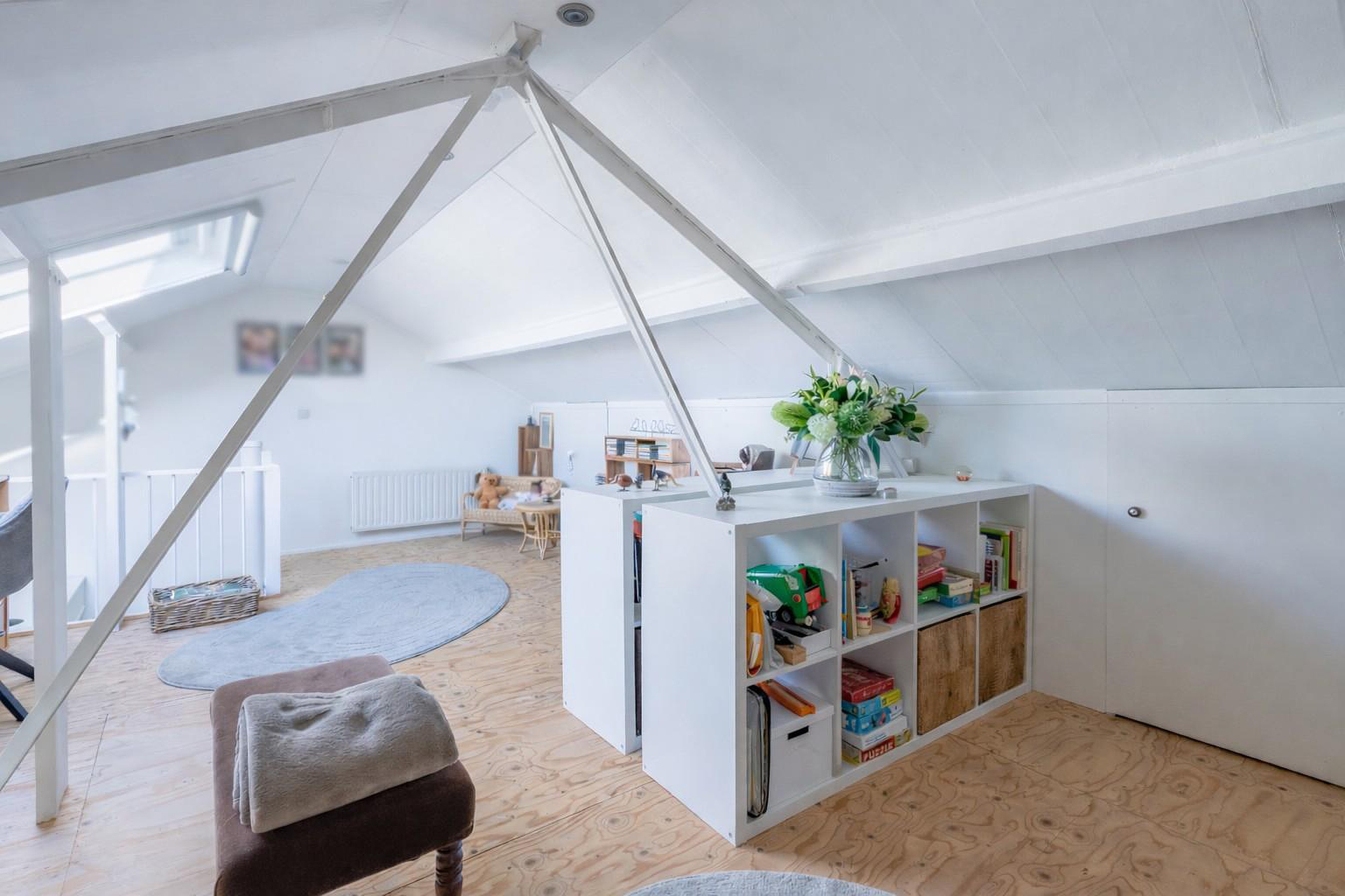 De verdieping biedt volop mogelijkheden: Een royale slaapkamer, thuiskantoor, atelier of speel-/hobbyruimte behoren hier moeiteloos tot de opties. Daarnaast is er veel praktische bergruimte aanwezig achter de knieschotten, waardoor de ruimte niet alleen comfortabel maar ook functioneel is ingericht.