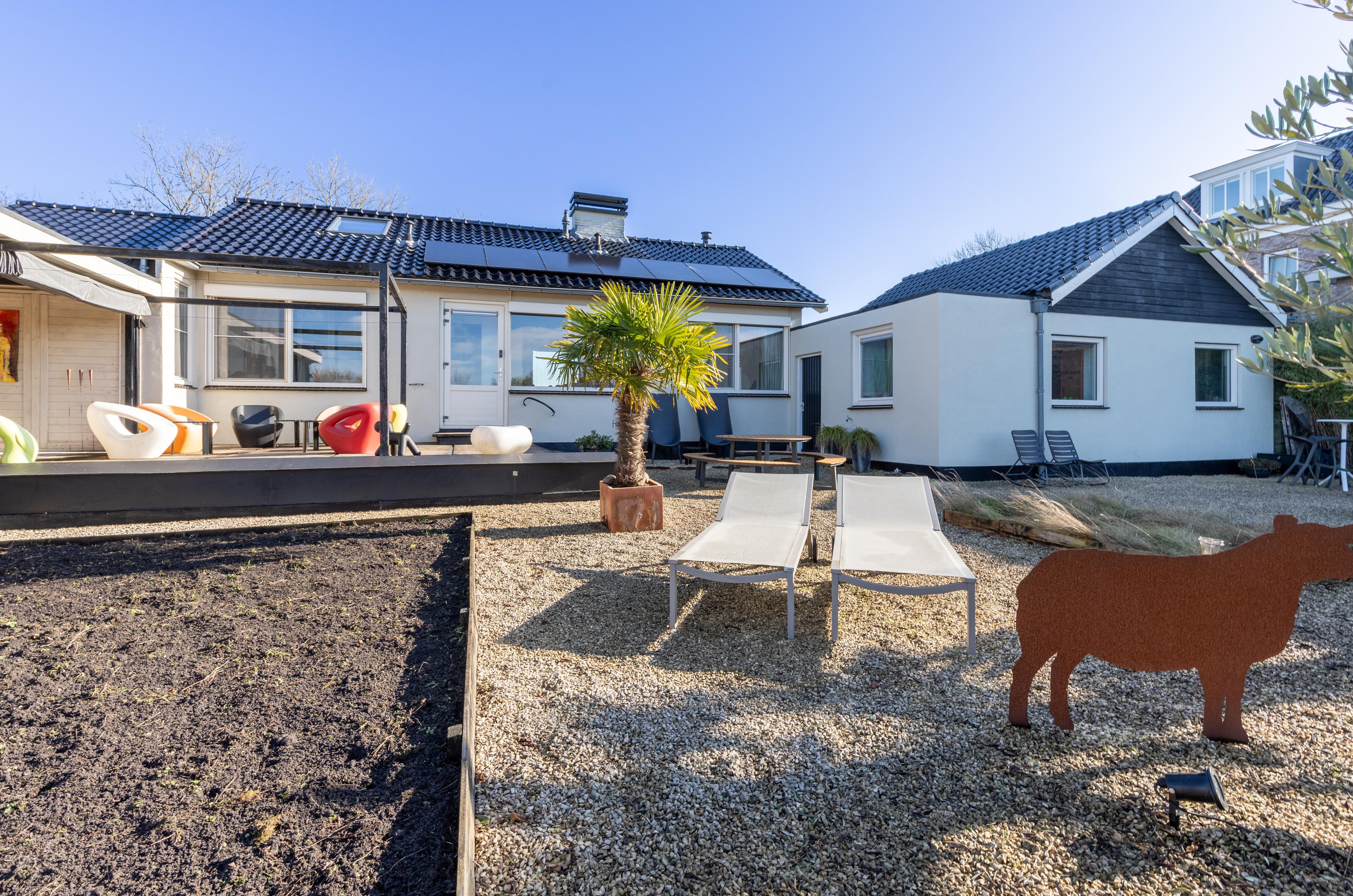 De tuin is onderhoudsvriendelijk ingericht en biedt meerdere terrassen, zodat er op elk moment van de dag een prettige plek te vinden is. De royale veranda (2015) vormt een beschut en sfeervol verlengstuk van het buitenleven en maakt het mogelijk om het hele jaar door comfortabel buiten te zitten.