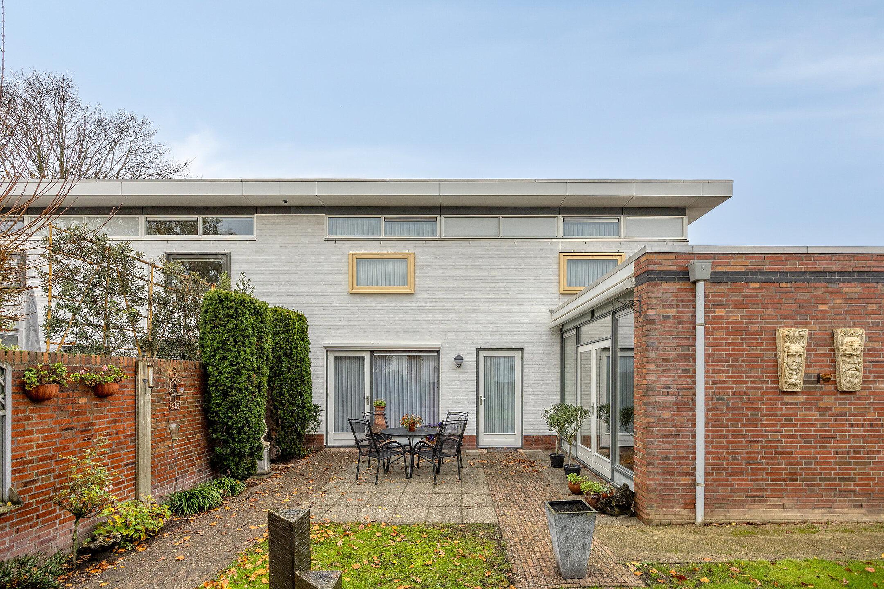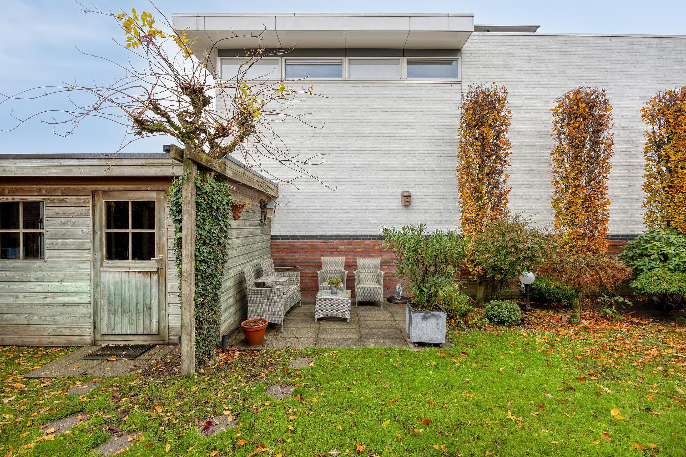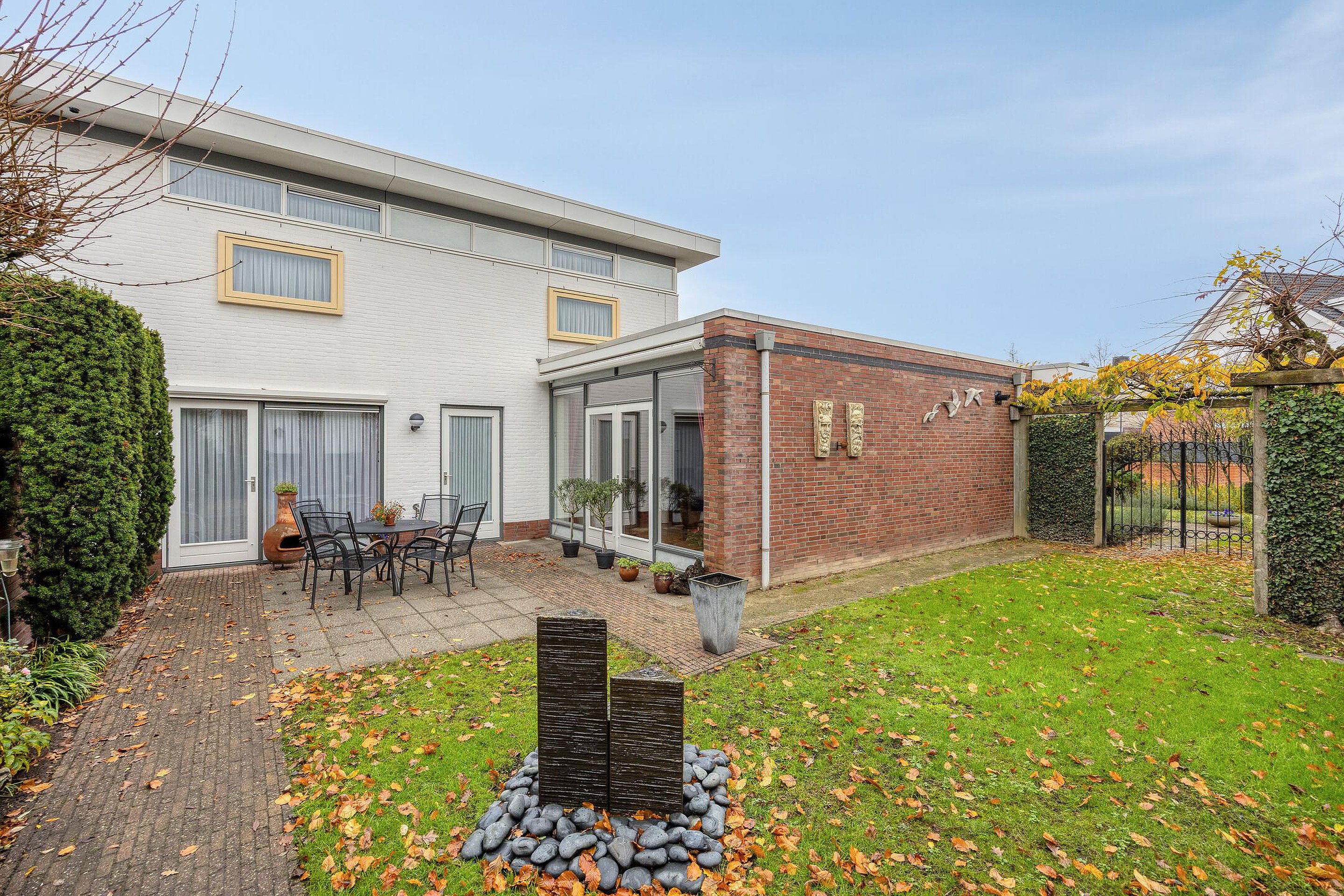Begane grond Via de overdekte entree bereikt u de hal met meterkast, die toegang geeft tot de L-vormige woonkamer. Deze royale leefruimte is voorzien van een gashaard en airconditioning, en biedt volop ruimte voor zowel een zit- als eetgedeelte. De gestucte wanden en plafonds, gecombineerd met een prachtige massief eikenhouten vloer en grote raampartijen, zorgen voor een warme en lichte sfeer. Via de openslaande deuren bereikt u het terras en de fraai aangelegde achtertuin. De halfopen keuken is licht van kleur en beschikt over een hoekopstelling met veel opbergruimte en diverse inbouwapparatuur, waaronder een 4-pits gaskookplaat, afzuigkap, koelkast en vaatwasser. Aansluitend vindt u de praktische bijkeuken met de cv-combiketel en de aansluitingen voor wasapparatuur. Vanuit de bijkeuken is er directe toegang tot de inpandige garage. Een tussenportaal vanuit de woonkamer leidt naar het toilet, de begane grond slaapkamer en de trap naar de eerste verdieping. De slaapkamer is netjes afgewerkt gestucte wanden en zonwerende screens, en heeft via een loopdeur direct toegang tot de achtertuin. De moderne badkamer (2023) beschikt over een toilet, douchecabine en wastafel en is en suite verbonden met de slaapkamer.