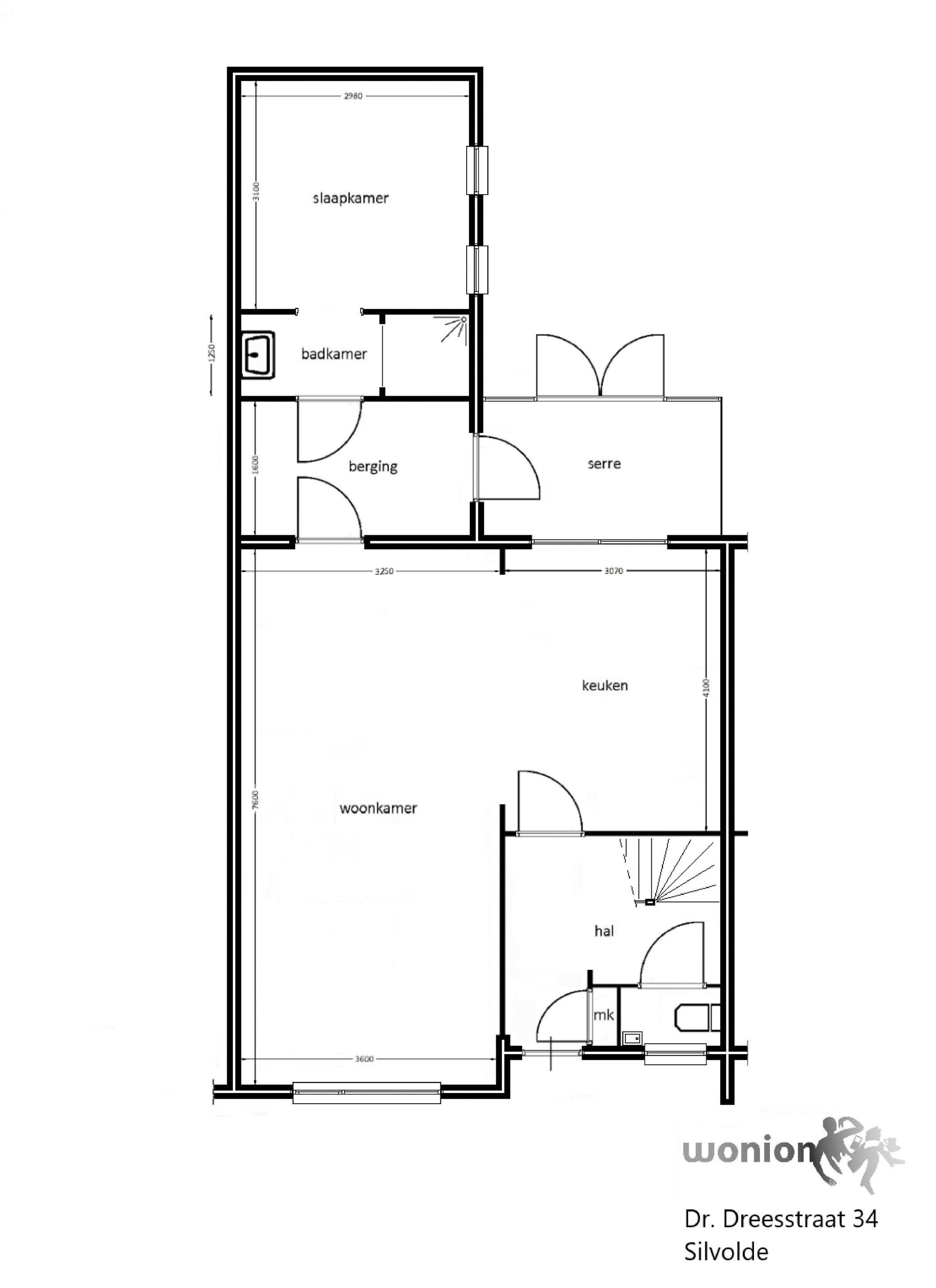 Entree, hal, toilet, trapopgang, doorzon-woonkamer, bijkeuken, een doucheruime en een slaapkamer, keuken, serre en een terras.