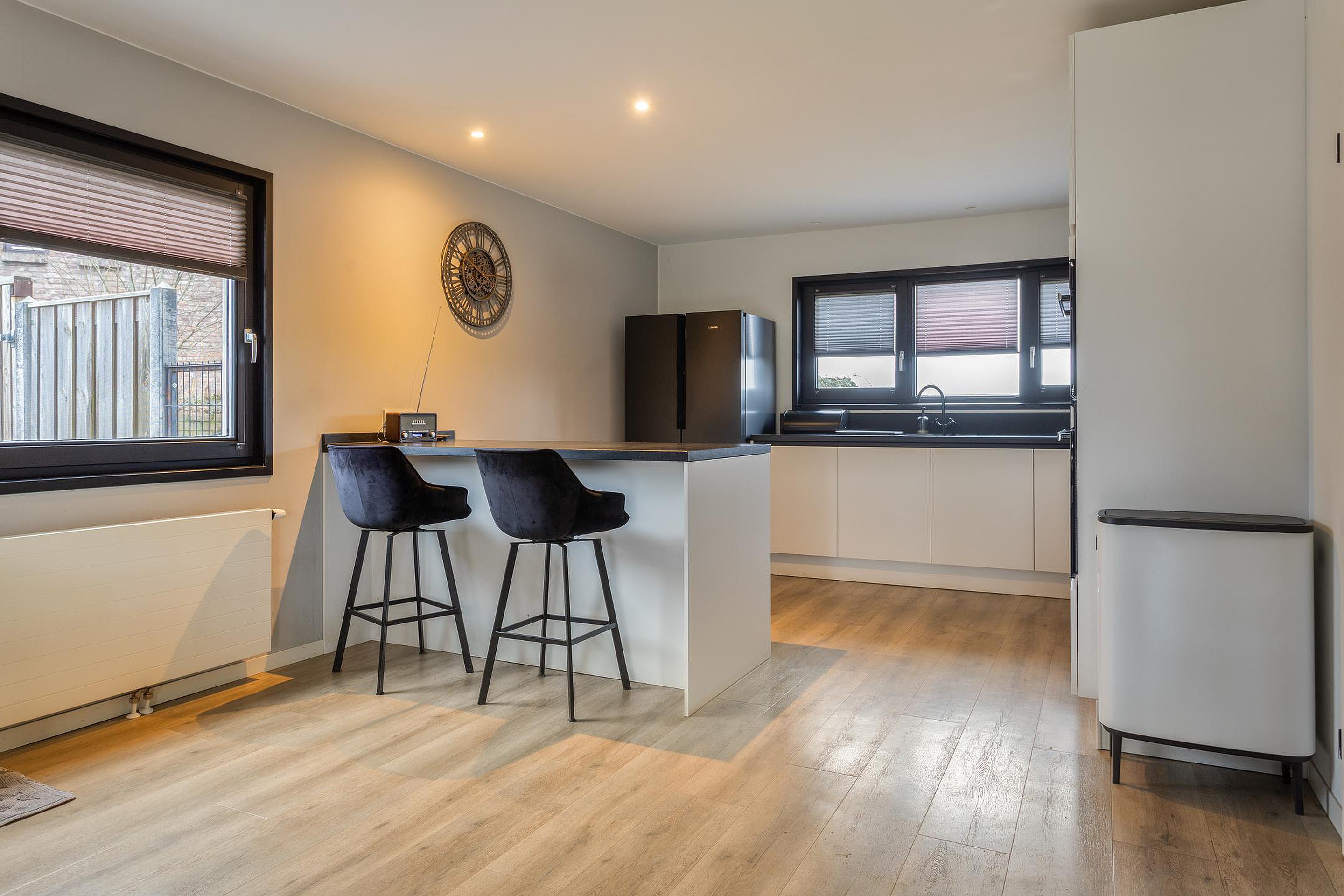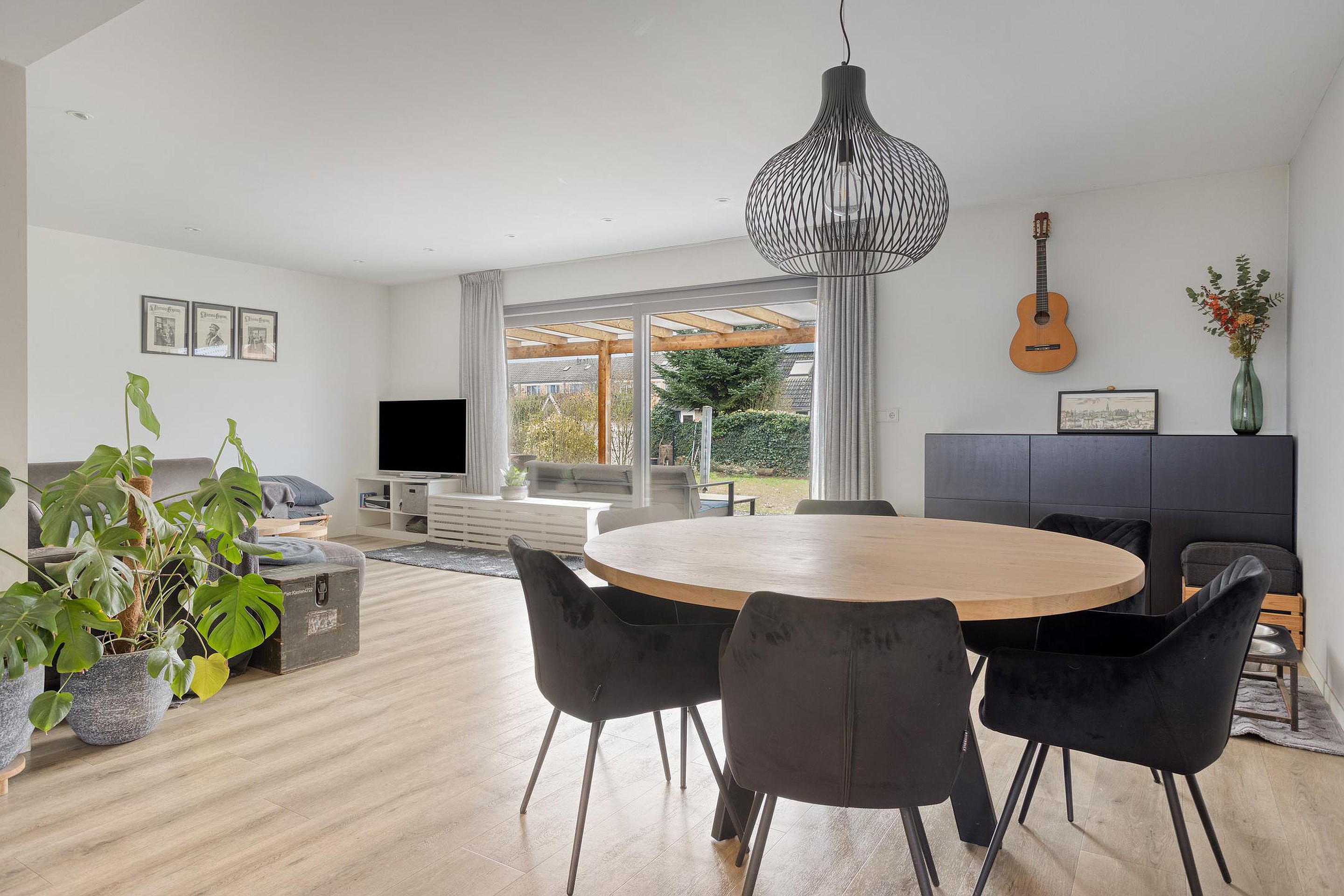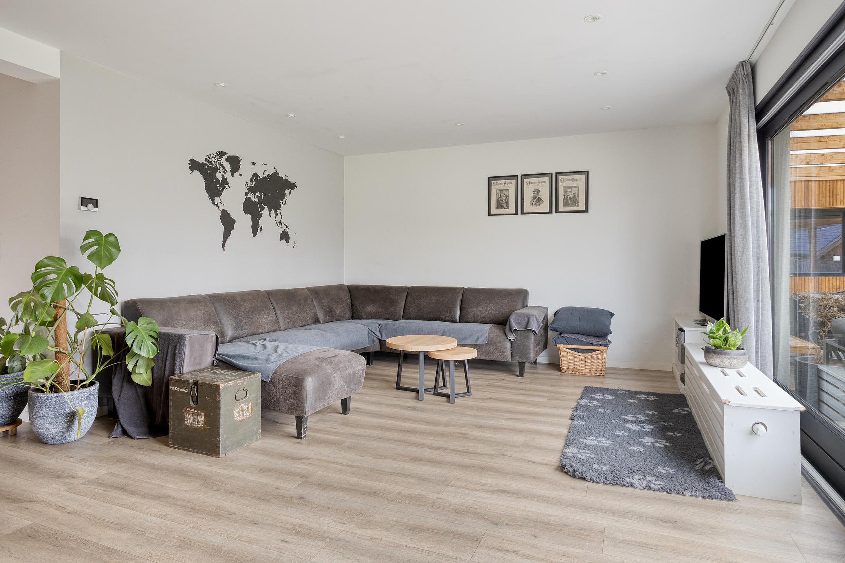 - De living: Een lichte, royale woonkamer met een directe verbinding naar de open keuken. Dankzij de schuifpui aan de achterzijde loopt binnen naadloos over in het buitenleven op het overdekte terras.