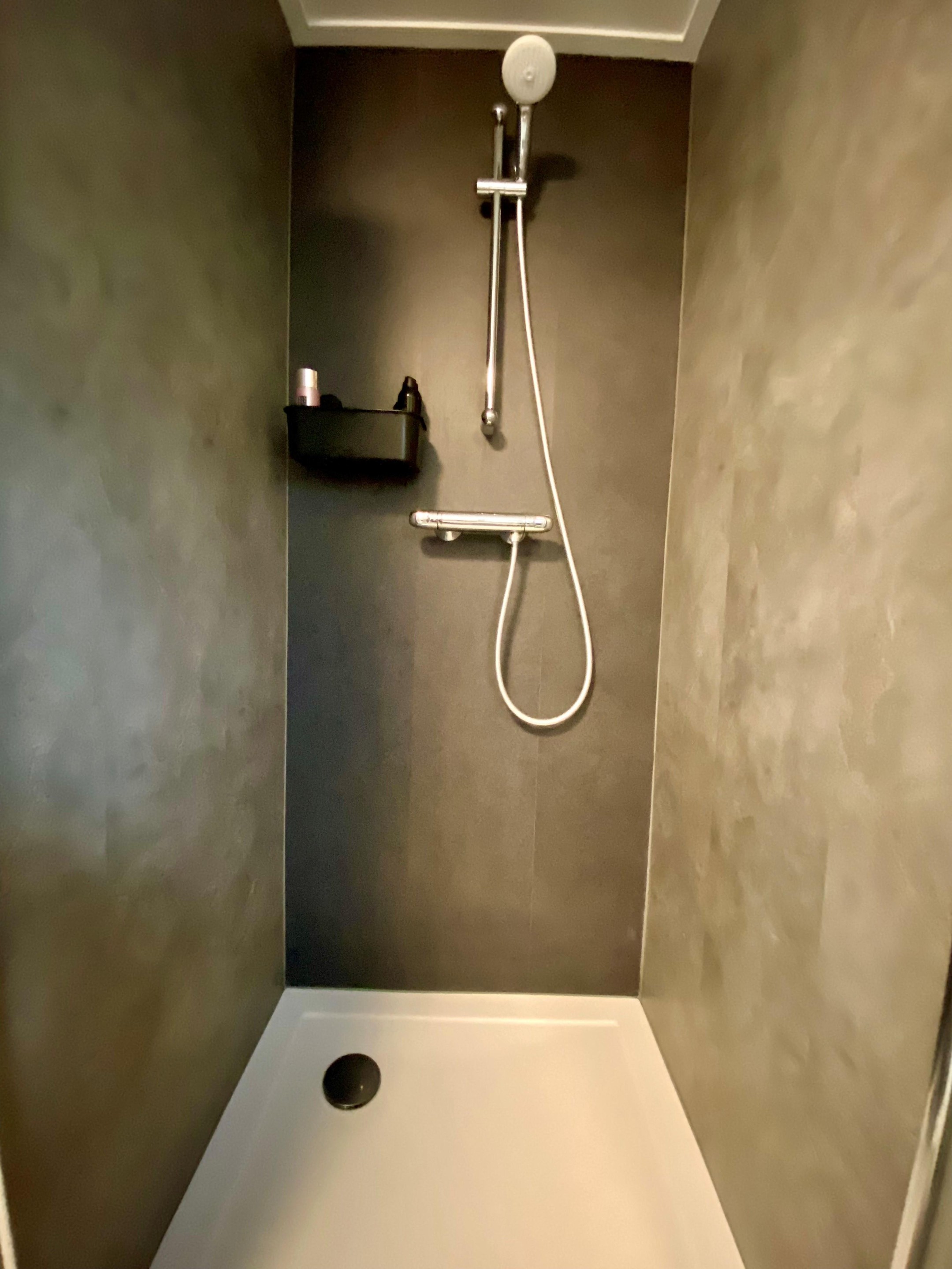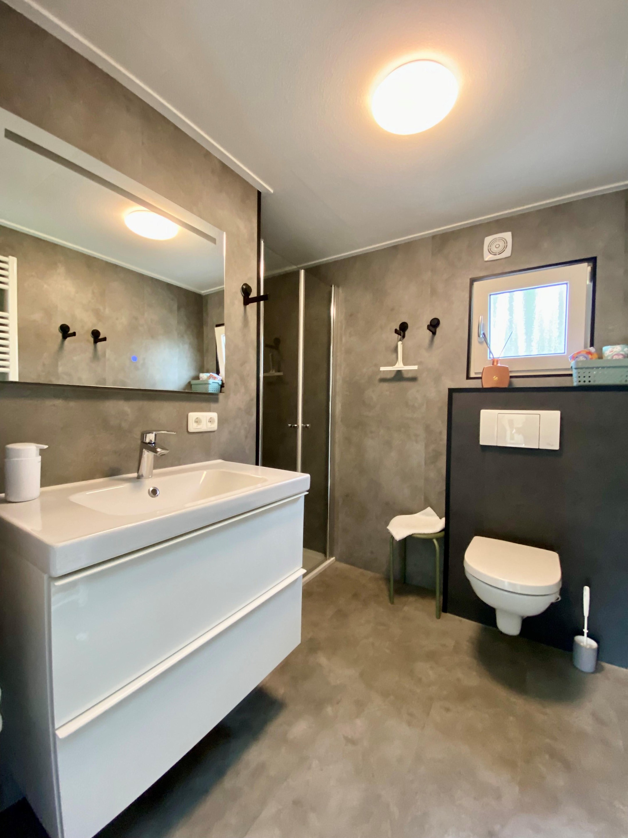 - Stijlvolle badkamer met ruime douche, toilet, wastafelmeubel en verlichte spiegel