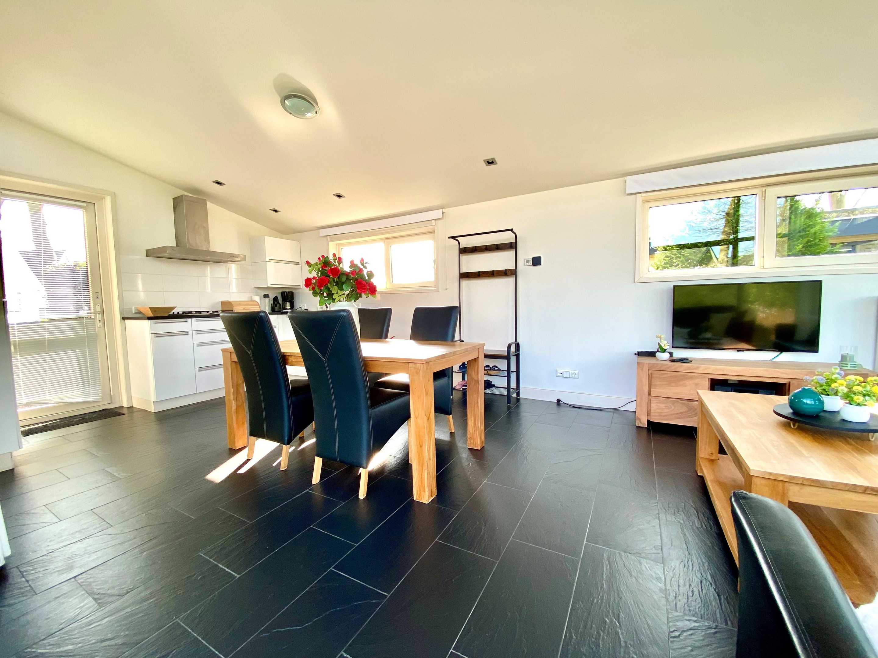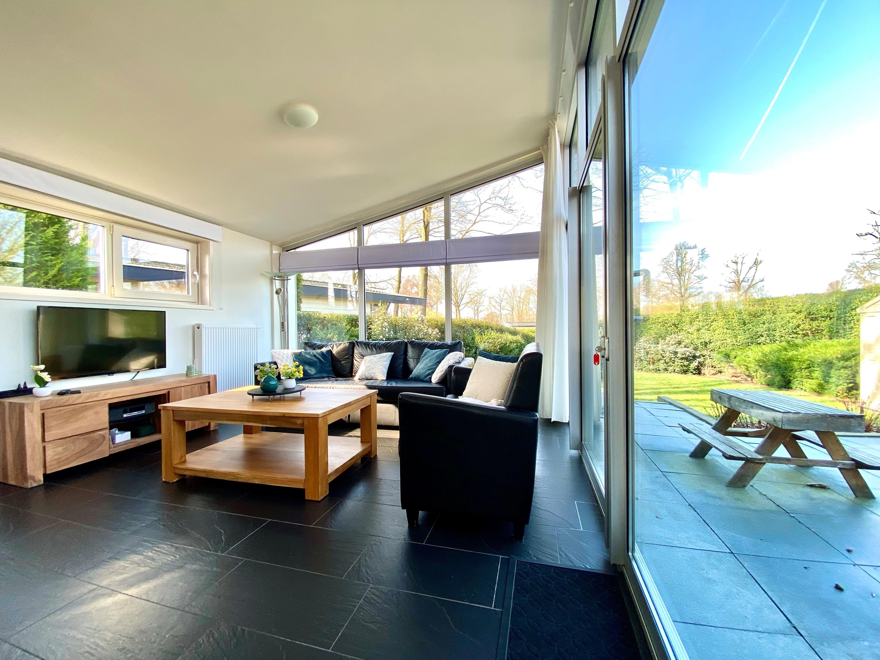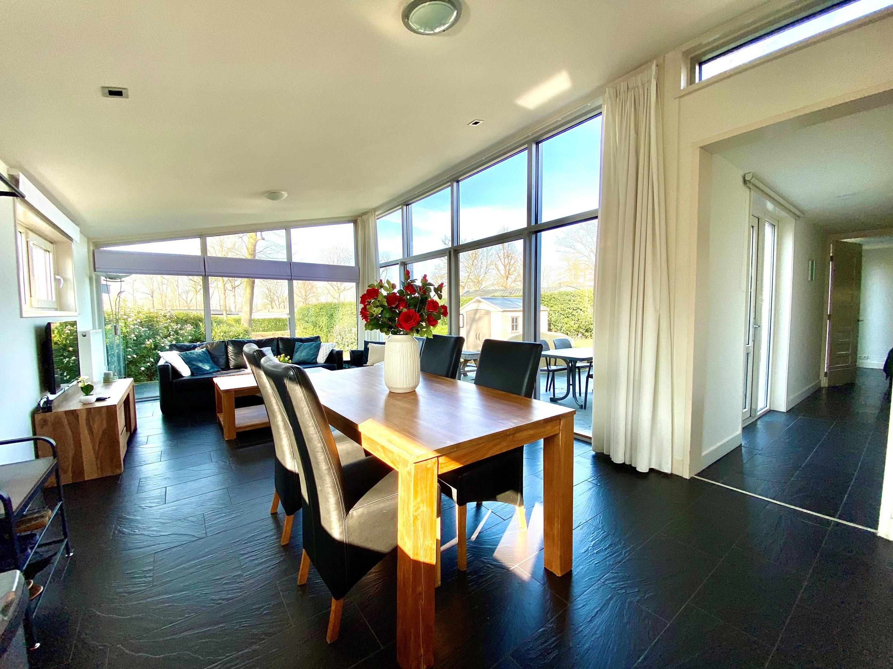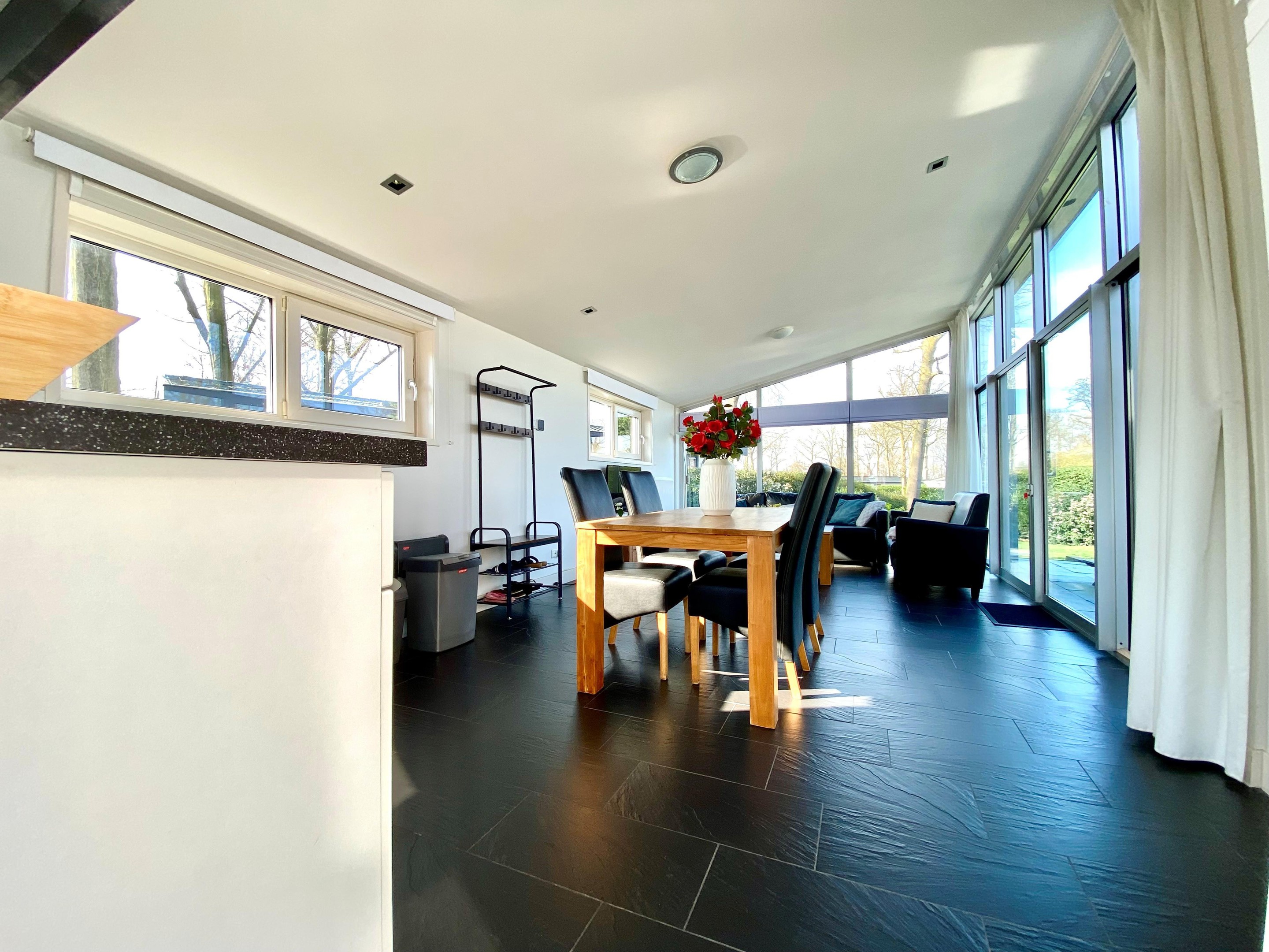 De ruime en lichte woonkamer beschikt over grote raampartijen die zorgen voor veel natuurlijk licht en een prettige sfeer. Via de grote schuifpui heeft u direct toegang tot het terras en de tuin.