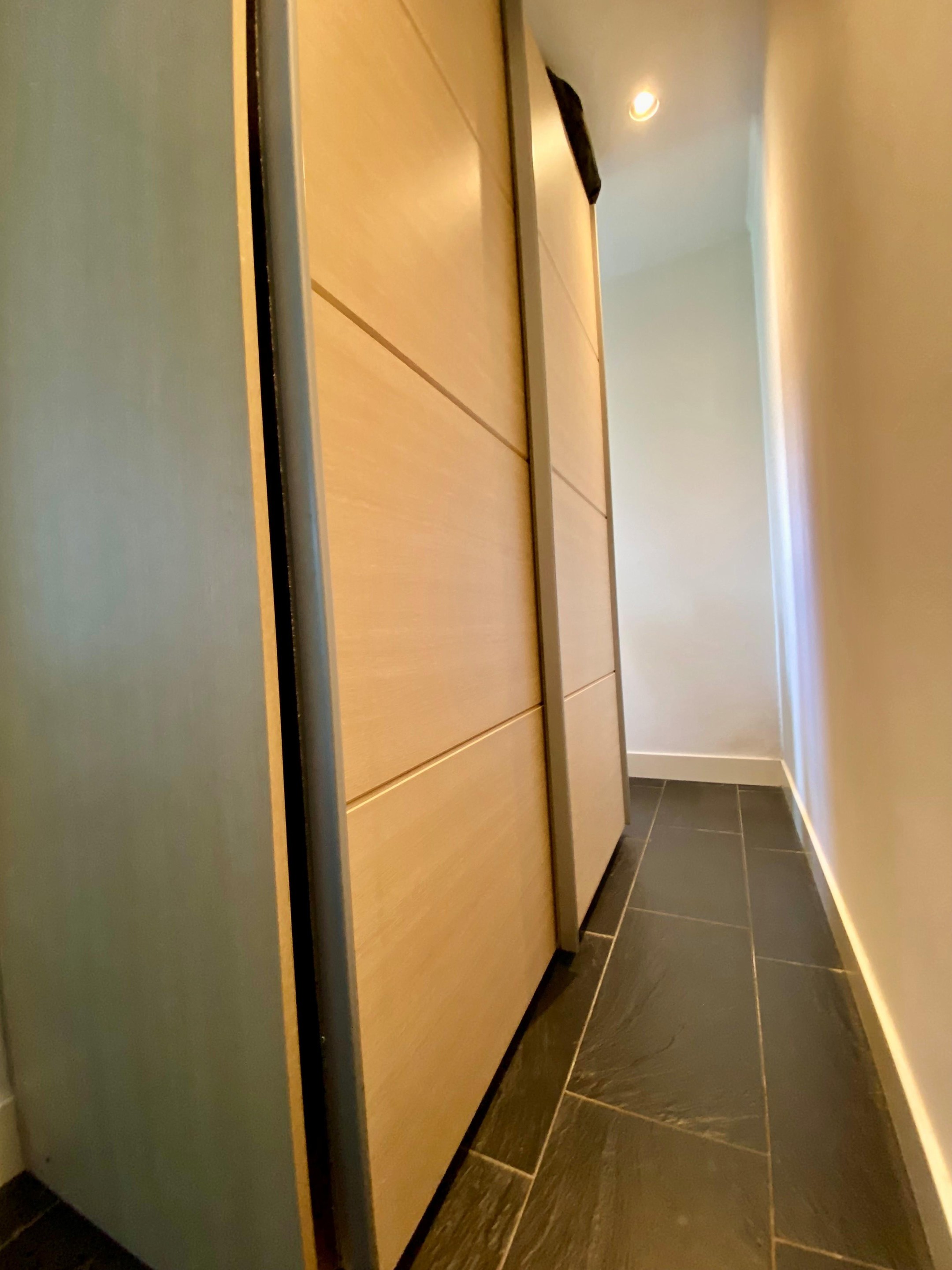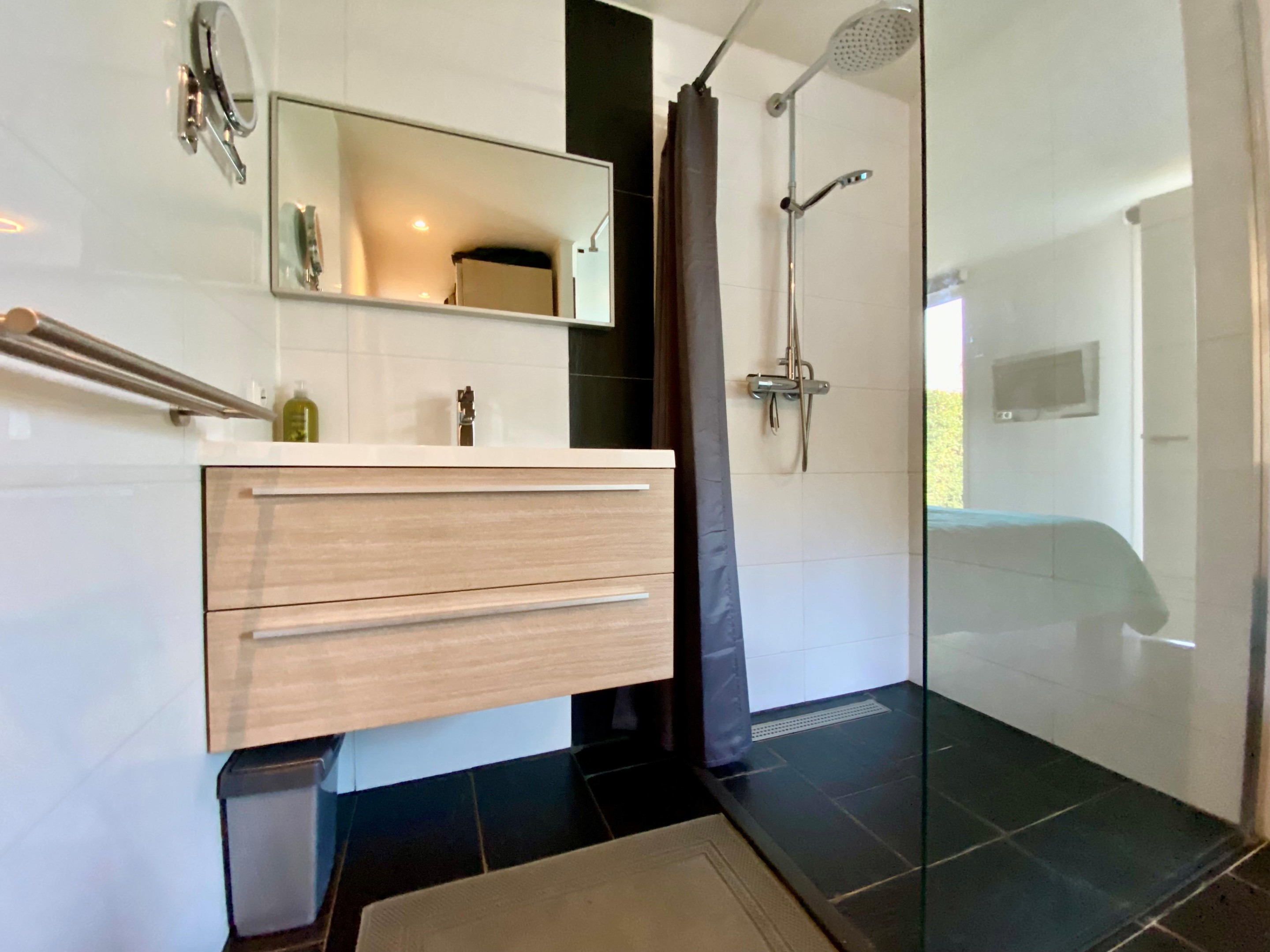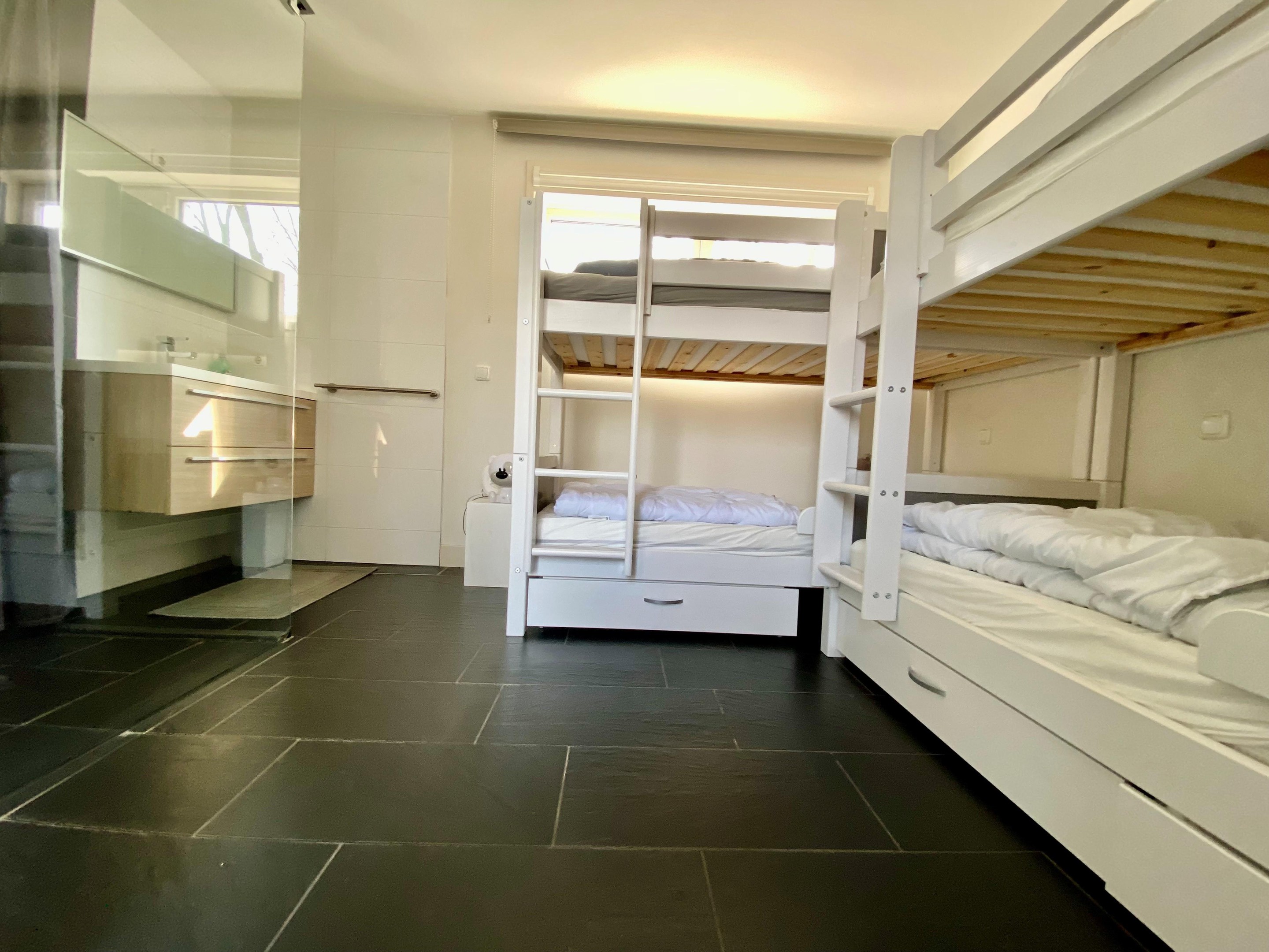 Via de hal bereikt u het slaapgedeelte van de woning. De woning beschikt over twee comfortabele slaapkamers, beide voorzien van een een TV en eigen badkamer met inloopdouche en wastafelmeubel. Daarnaast is er een comfortabele bank aanwezig die eenvoudig kan worden omgevormd tot een gezellig tweepersoonsbed – ideaal voor extra gasten