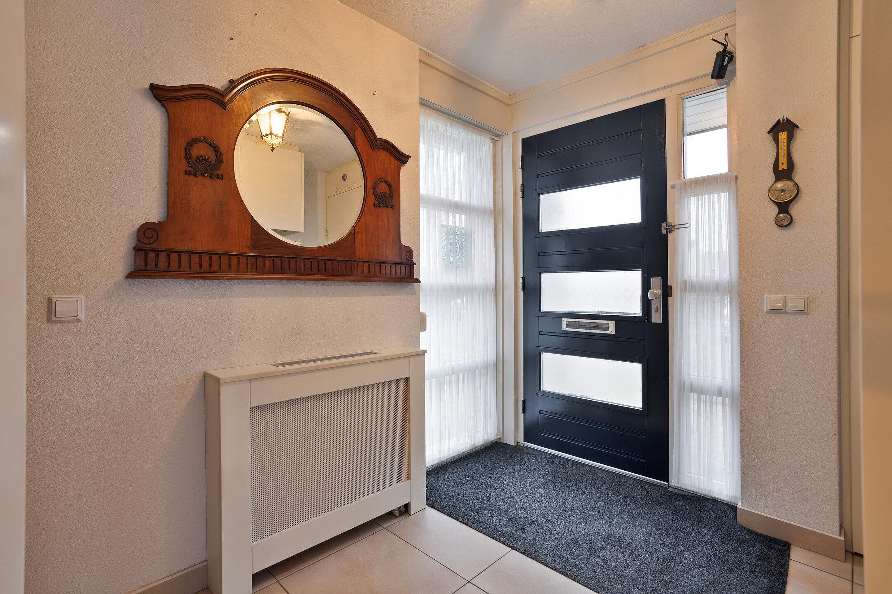 Vanuit de overdekte hal/entree met meterkast is er toegang tot de ruime woonkamer met open keuken en de trapopgang naar de eerste verdieping. De keuken, in L-vorm, is aan de voorzijde van de woning gelegen en is v.v. diverse kasten en lades, een kunststof werkblad met spoelbak en kraan, een 4-pits gaskookplaat, afzuigkap, koelkast (2022) en vaatwasser (2024). In de woonkamer is een trapkast aanwezig wat zorgt voor extra bergruimte. Door de grote raampartijen is er veel lichtinval in de woonkamer. De woonkamer biedt toegang tot de serre/achtertuin. Vanuit de woonkamer is ook een lange gang bereikbaar van waaruit er toegang is tot twee slaapkamers (beide v.v. een kastenwand), het separaat toilet, de badkamer, een berging met wasmachineaansluiting en een bergkast. Vanuit deze gang is ook de aangebouwde garage bereikbaar. Het separaat toilet is deels betegeld en v.v. een hangend toilet met fonteintje. De badkamer is geheel betegeld en v.v. een hangend toilet, ligbad, wastafel en een douche. De vloer van de gehele begane grond is v.v. tegels met grotendeels vloerverwarming (m.u.v. de slaapkamers). De wanden zijn afgewerkt met stucwerk. De plafonds zijn v.v. spuitwerk. De kozijnen zijn van hout met dubbel glas en grotendeels v.v. rolluiken.