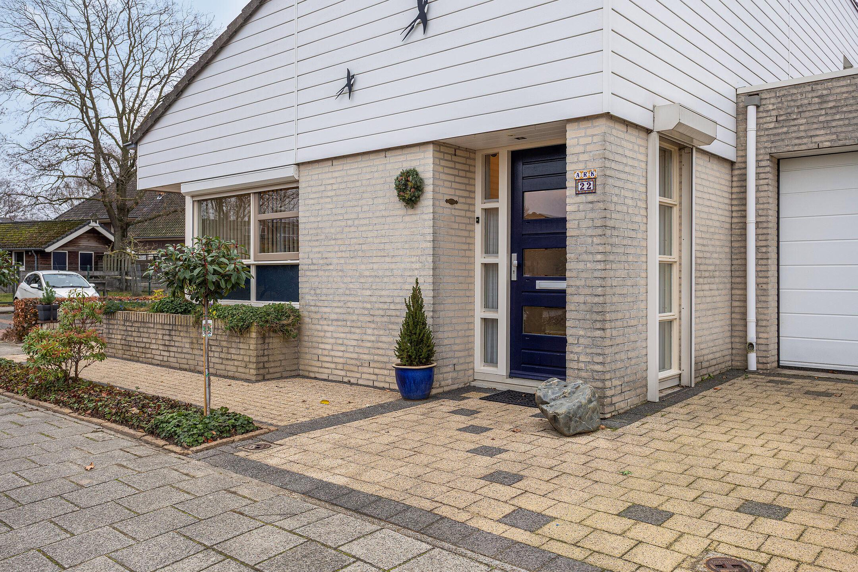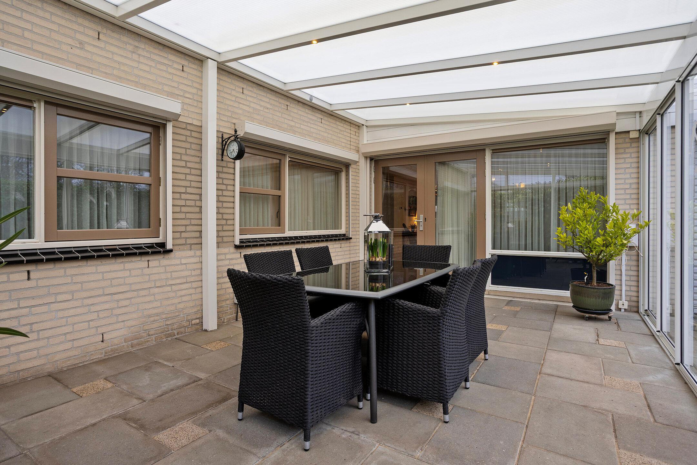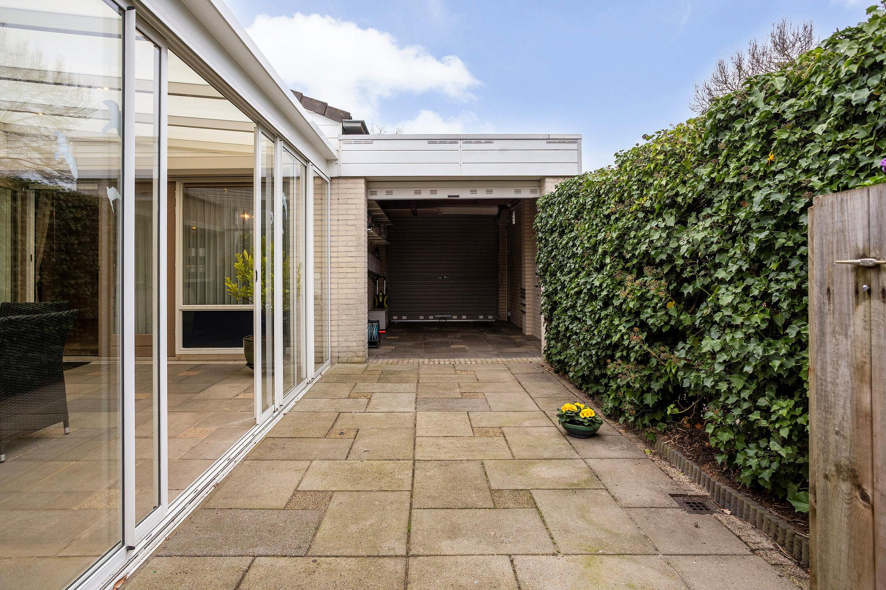 Deze woning beschikt over 2 garages en een voor-en achtertuin. Beide garages zijn middels een inrit aan de voorzijde van de woning bereikbaar. De achtertuin is gelegen op het noordoosten en beschikt tevens over een royale serre. De tuin is aangelegd met sierbestrating en omringd door een groene schutting. De voortuin is gelegen op het westen en is aangelegd met sierbestrating, een stenen bloembak en een border met vaste beplanting.
