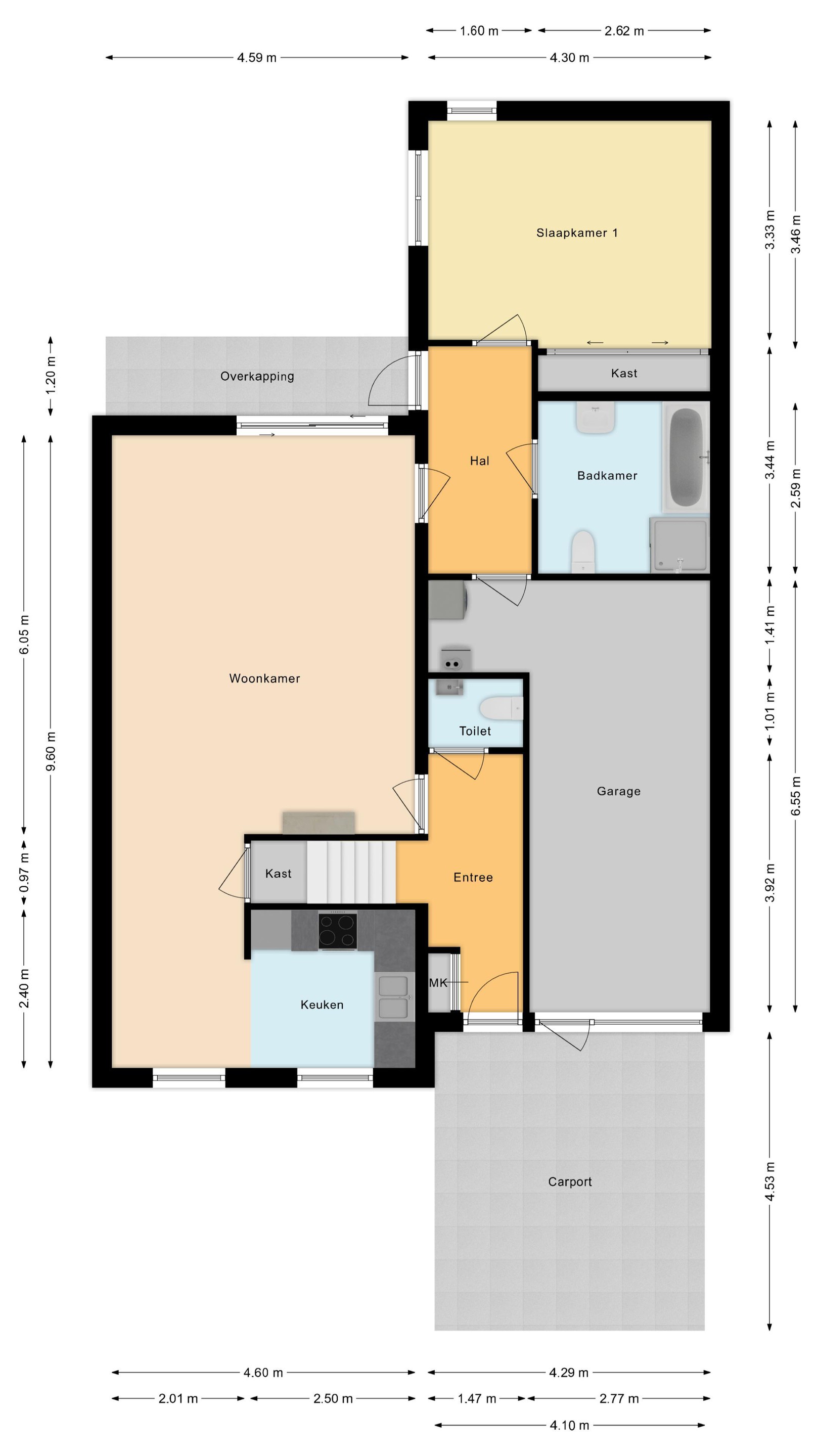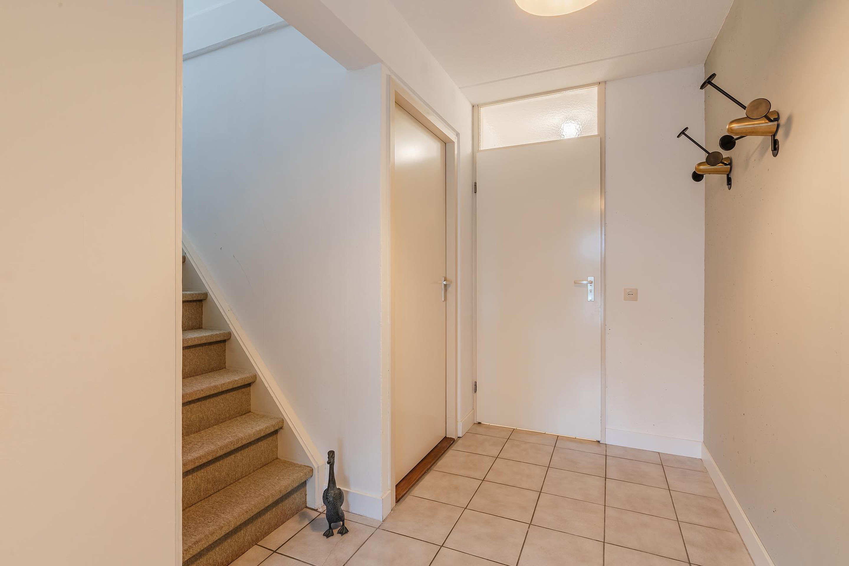 Vanuit de woonkamer is er toegang tot een portaal (ca. 5,5m2)met toegang tot de garage, de badkamer, de slaapkamer op de begane grond en de deur naar de tuin.