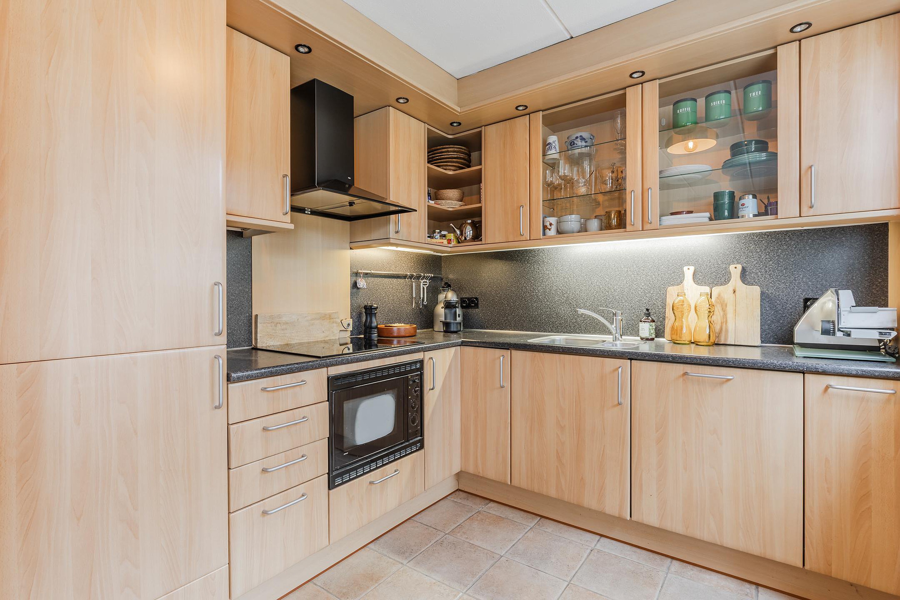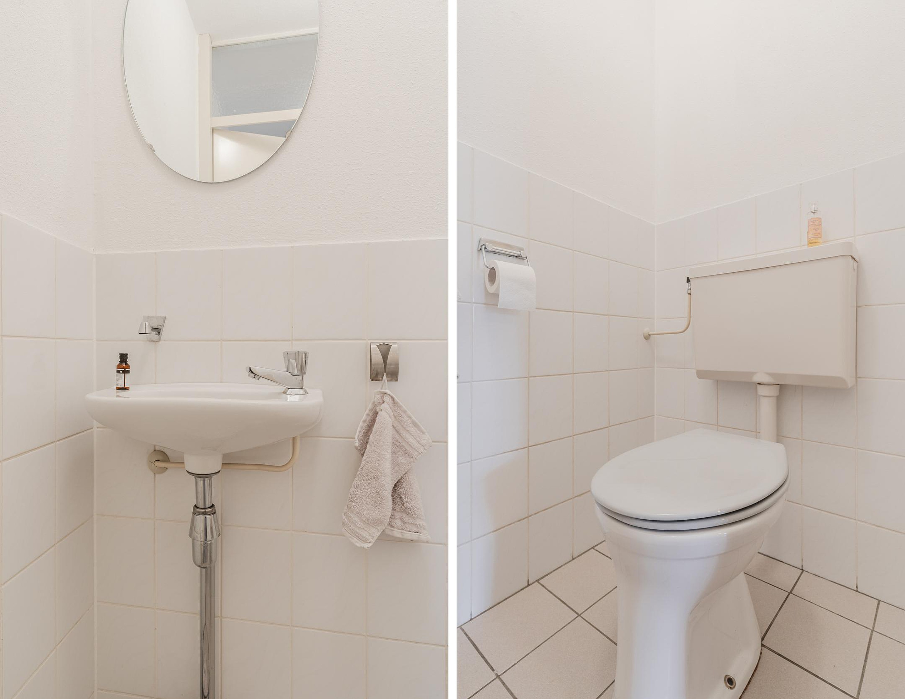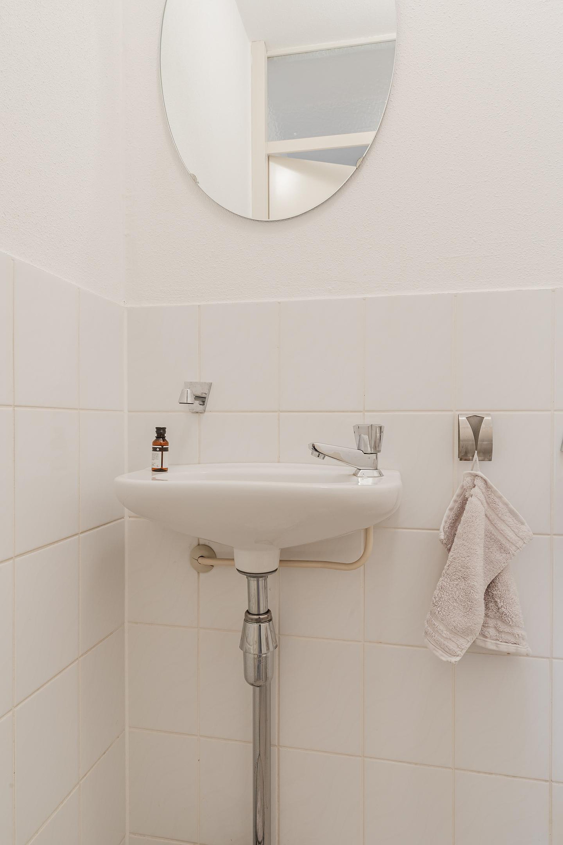 De hal met garderobe geeft toegang tot de meterkast, trapopgang naar de 1e verdieping, toiletruimte en woonkamer. De deels betegelde toiletruimte is ingericht met een staand closet, fontein en mechanische afzuiging. De woonkamer (ca. 44m2) voelt ruimtelijk aan door zijn vierkante vorm en heeft een sfeervolle elektrische haard met een marmeren mantel. Vanuit de woonkamer is er optimaal tuincontact. Een dubbele schuifpui geeft toegang tot de privacy rijke en zonnige tuin. De deels door een trapkast afgescheiden keuken (ca. 6m2) heeft een keurig keukenblok in hoekopstelling voorzien van veel opbergruimte. Qua apparatuur heeft de keuken een 4-zone inductie kookplaat met afzuigkap, oven, grote koelkast en dito diepvries en vaatwasser. Vanuit de keuken is er zicht op de weg aan de voorzijde en de oprit.