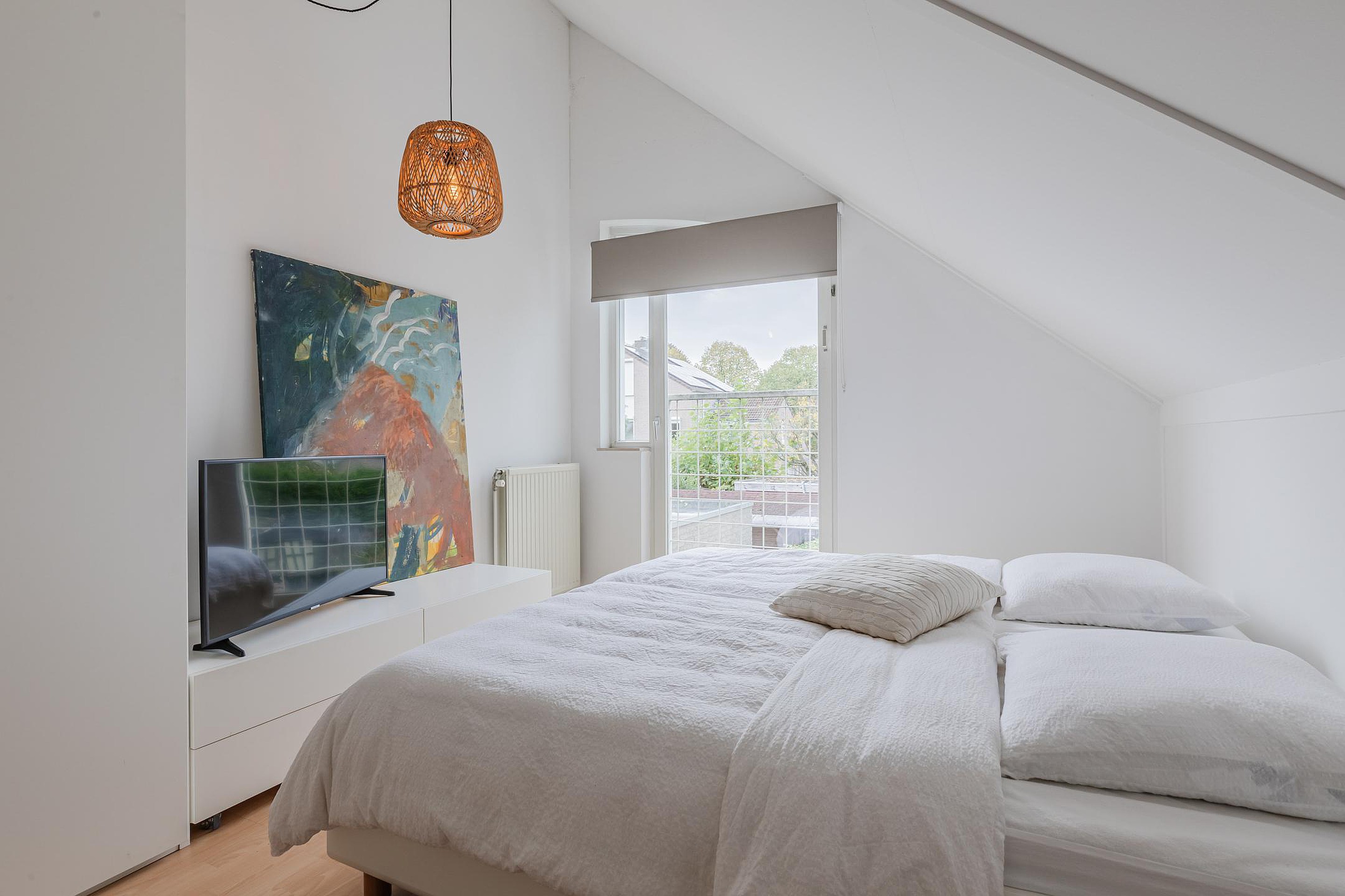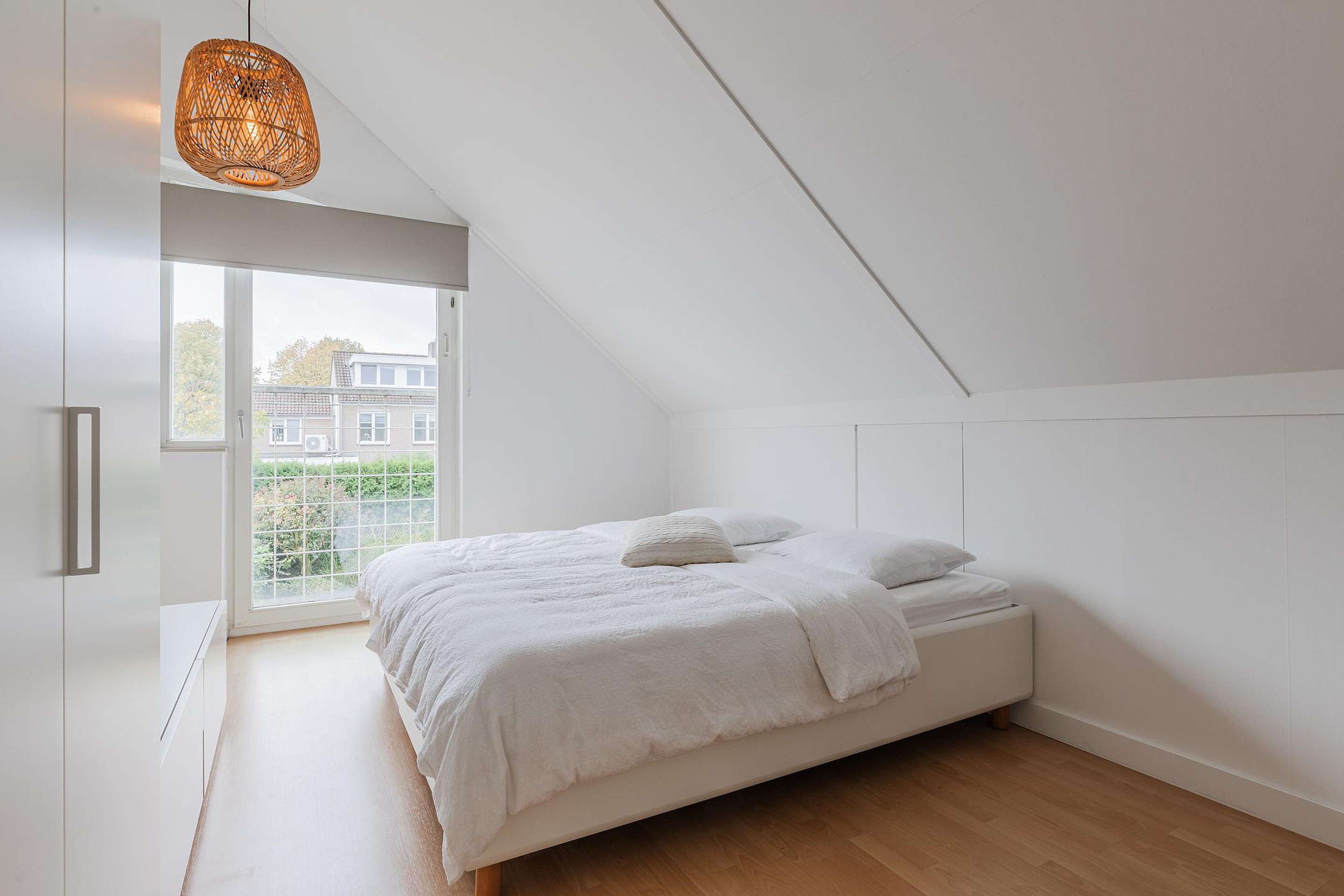 De ruime lichte slaapkamer (ca. 17m2) grenst aan de tuin en heeft een grote vaste schuifkastenwand met inrichting. De slaapkamer is voorzien van rolluiken aan de buitenzijde. De grote geheel betegelde