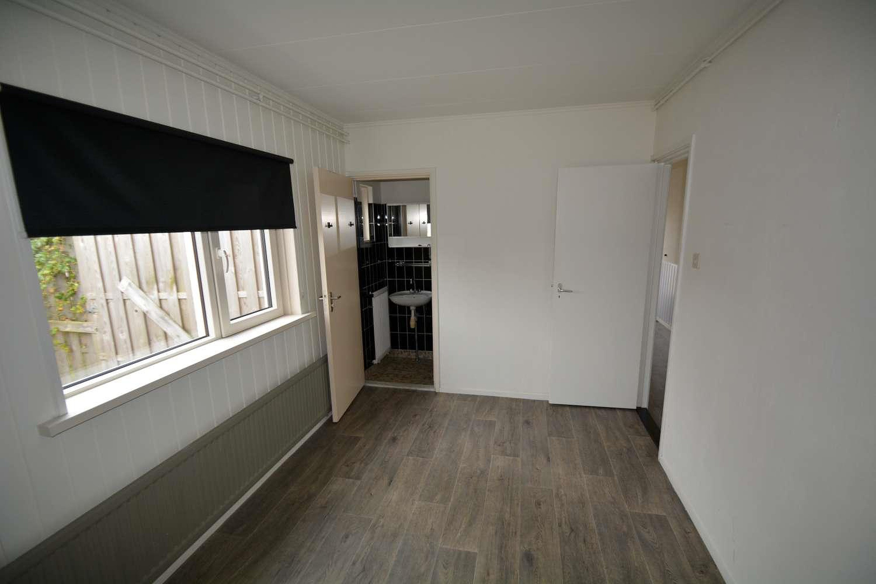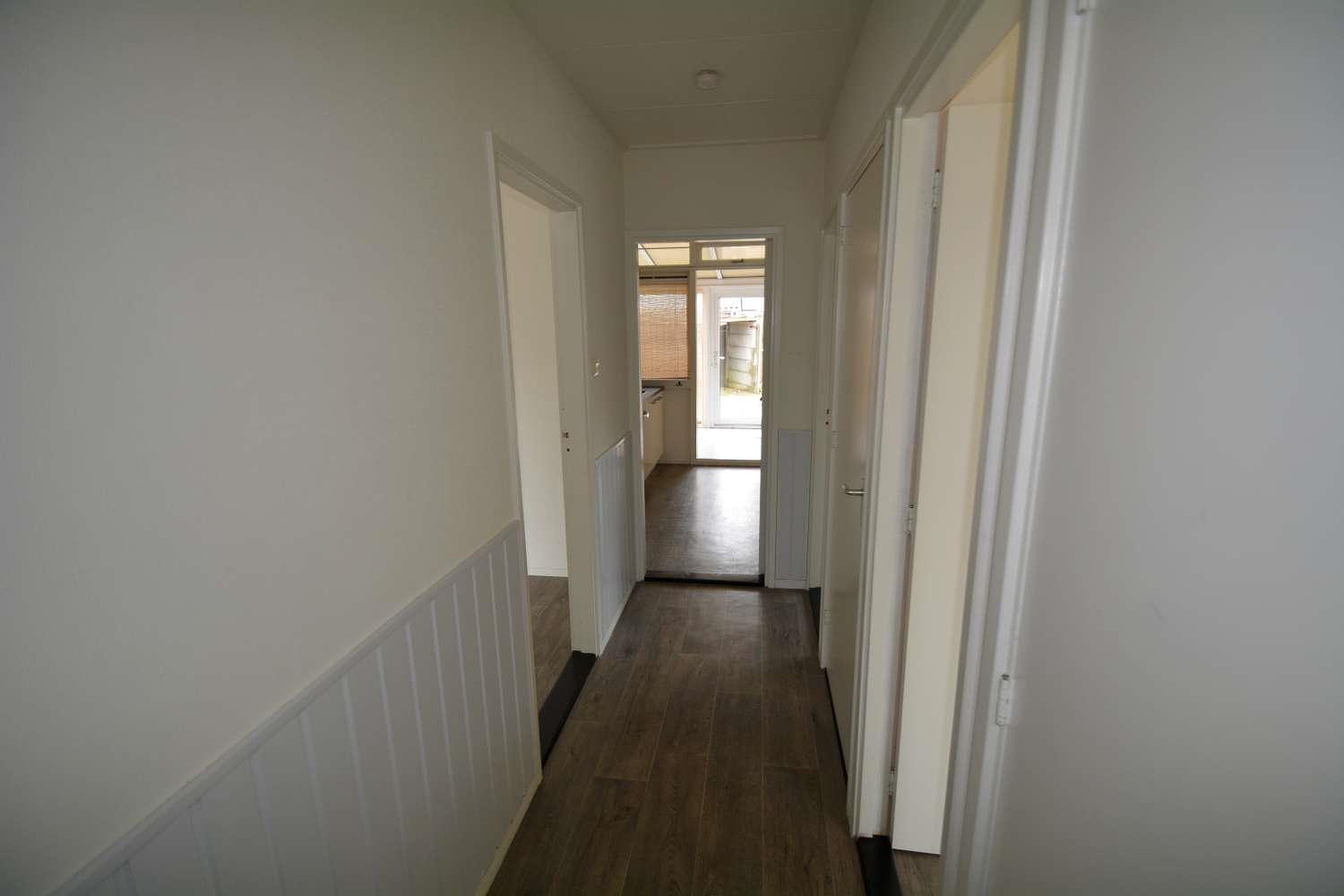 Begane grond, hal met rechts van de hal een slaapkamer, apart toilet en een tweede slaapkamer met aangrenzend de douche met wastafel. Links van de hal, over de volledige diepte de woonkamer, achter de hal en gedeeltelijk achter de woonkamer de keuken. Vanuit de keuken kom je in de serre, naast de serre de berging met wasmachine aansluiting en plaats voor combiketel.