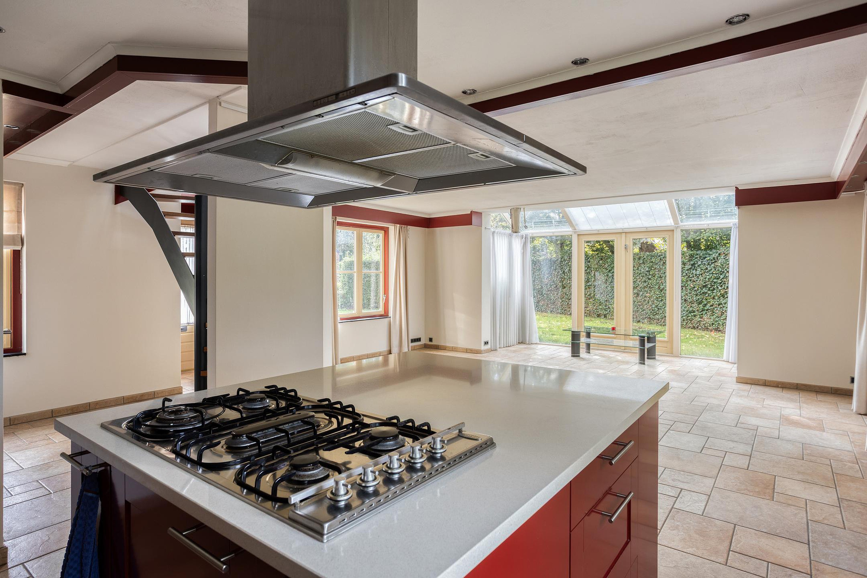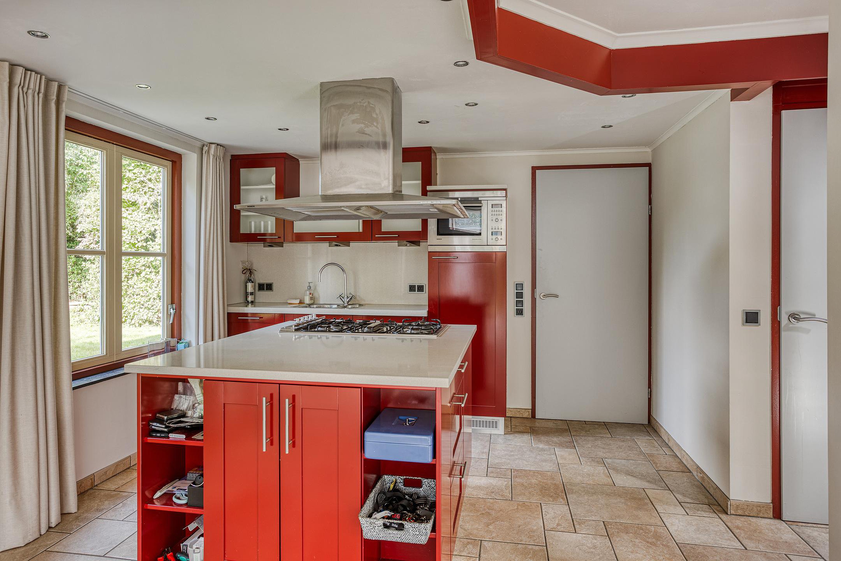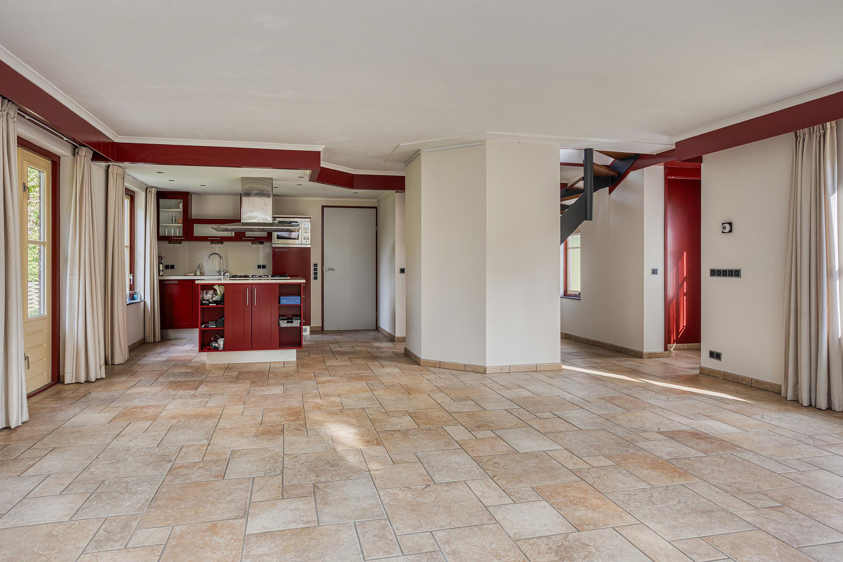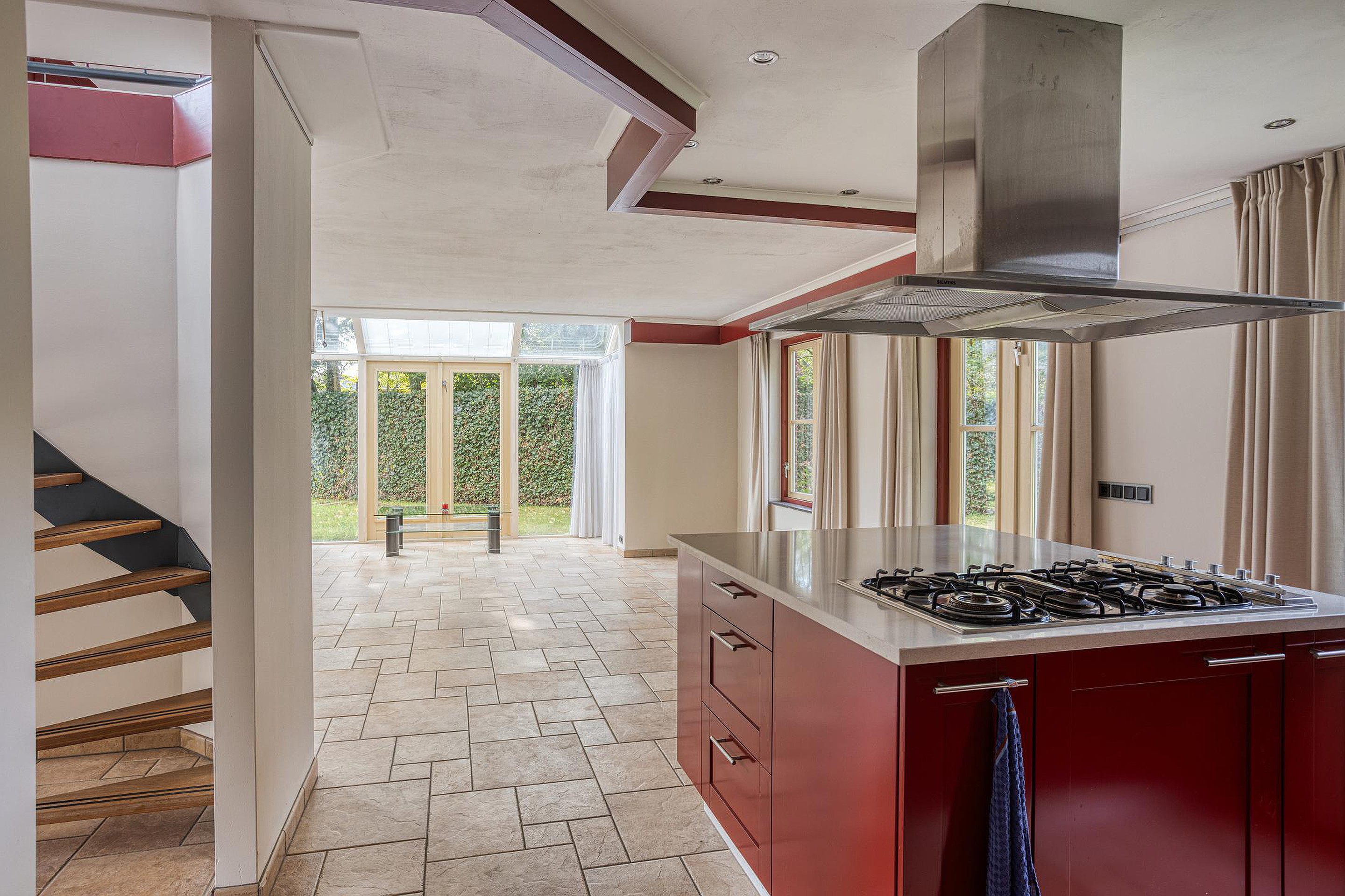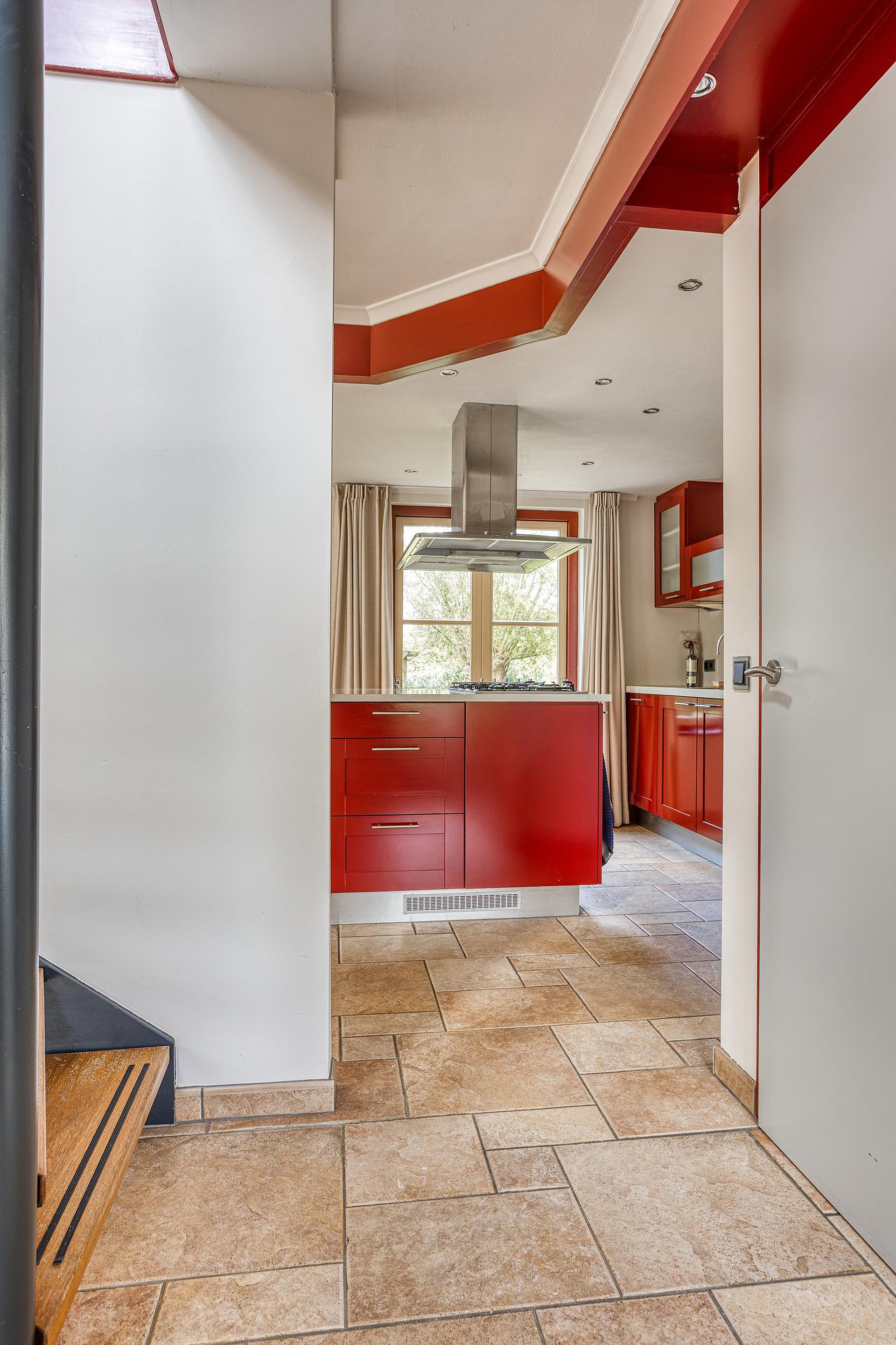 Ruime entree met garderobe, meterkast, trapopgang met vaste wenteltrap. Zeer royale woonkamer met plavuizen met openslaande tuindeuren naar de tuin, aansluiting voor een houtkachel en eetgedeelte met openslaande tuindeuren naar het terras en de achtertuin, open woonkeuken met kookeiland, voorzien van gaskookstel, oven, koelkast, vriezer, vaatwasser en afzuigkap en voldoende ruimte voor eettafel. De gehele begane grond is drempelloos en betegeld. Vanuit de keuken is er toegang tot de bijkeuken met wasmachine aansluiting en genoeg ruimte voor een droger en wasmachine.