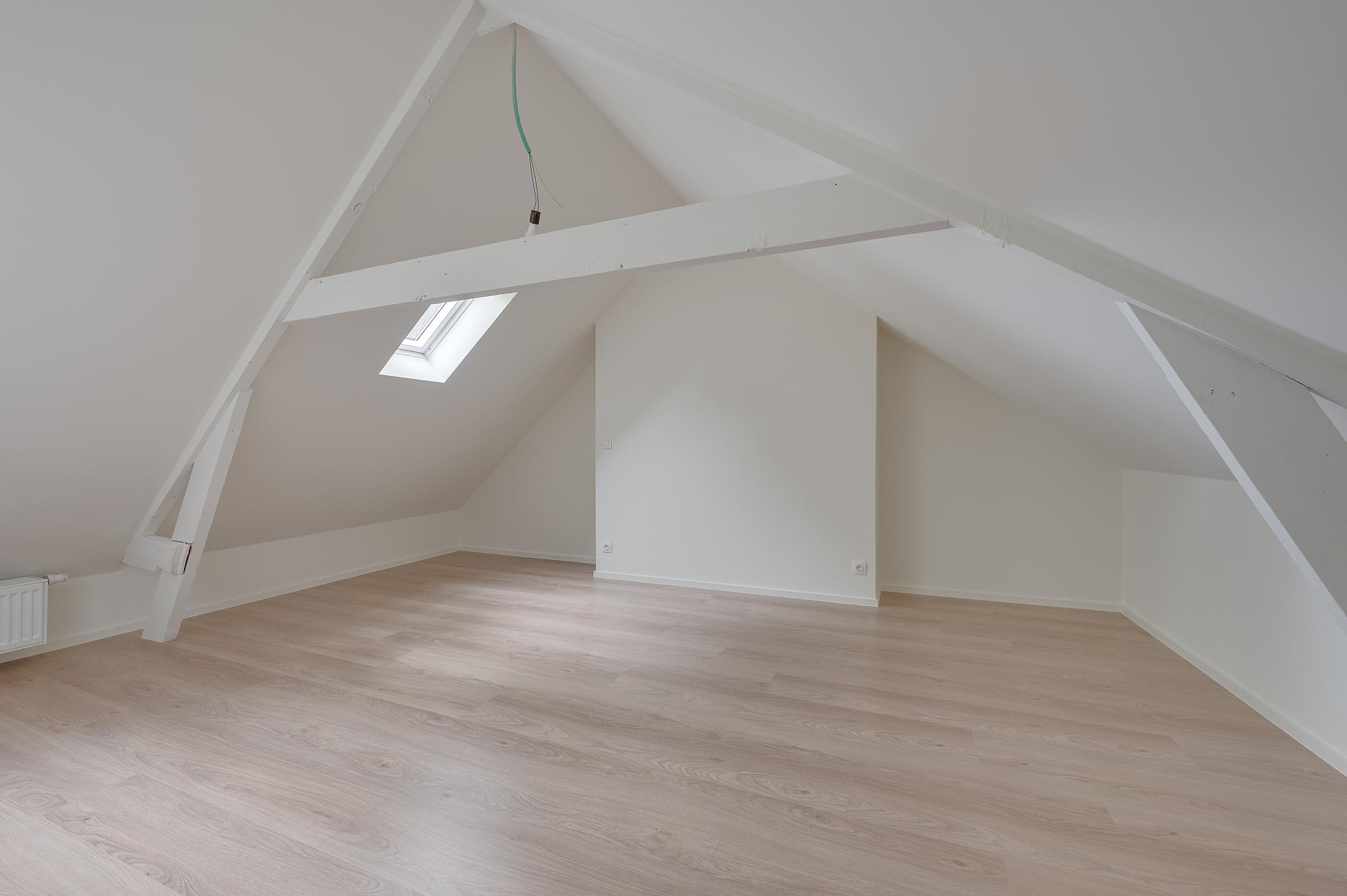De eerste verdieping is ingericht als een ruime slaapkamer met dakramen. Dankzij de slimme renovatie is dit een comfortabele en lichte ruimte, waar voldoende plek is voor een tweepersoonsbed en kastruimte.