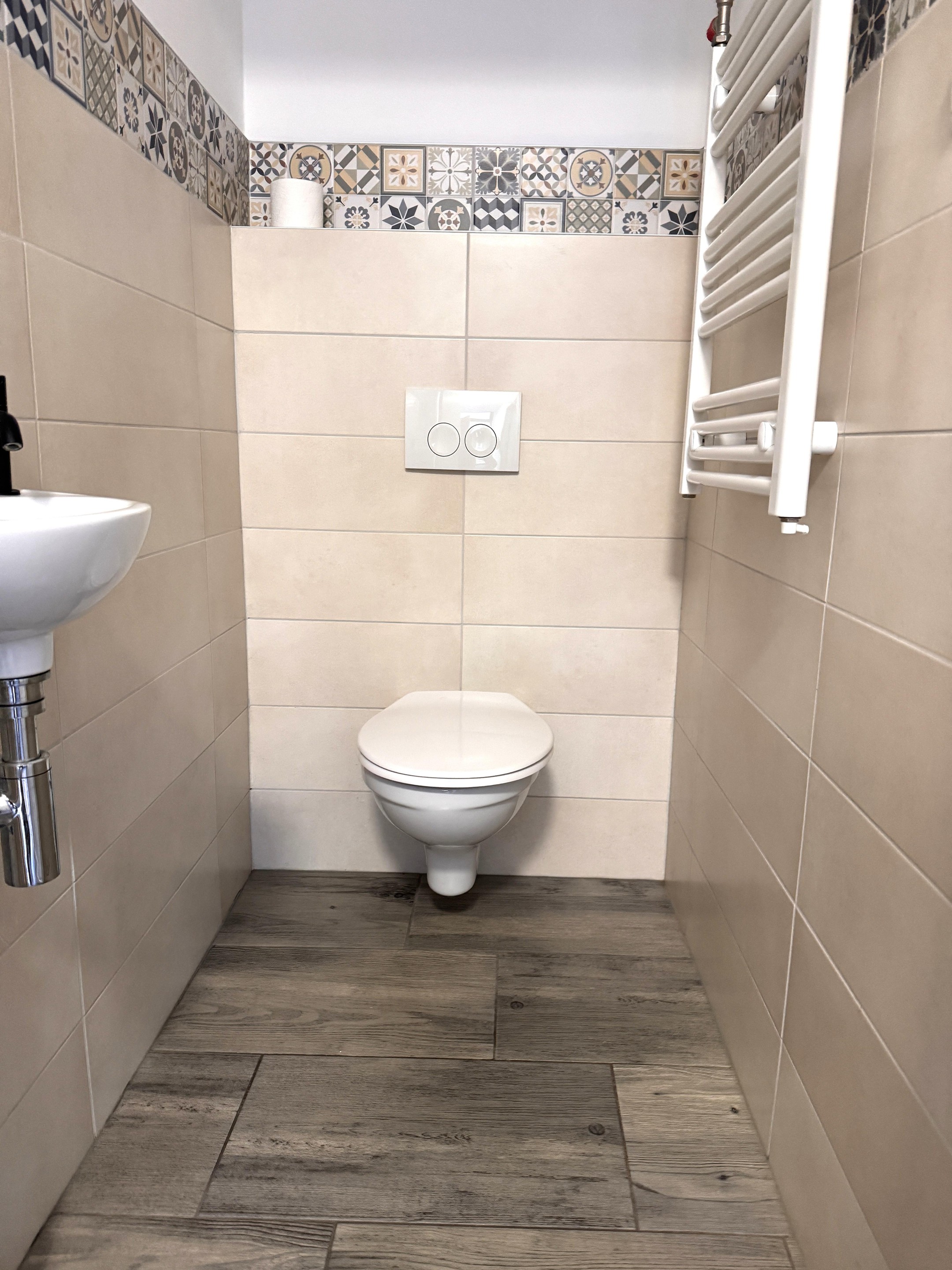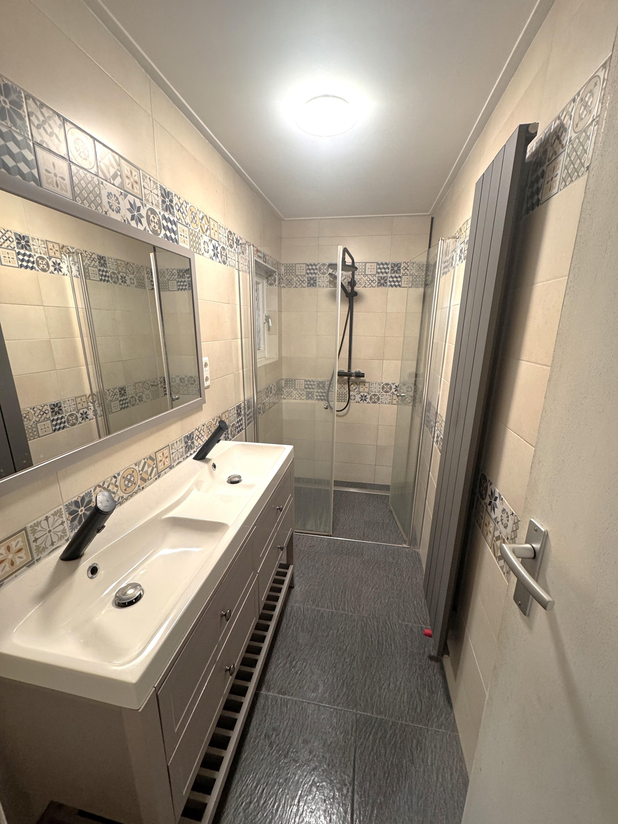 De badkamer (2022) is fris en modern met een inloopdouche, wastafelmeubel en handdoekradiator. Daarnaast is er een praktische wasruimte met wasmachineaansluiting en een separaat vernieuwd toilet (2022).