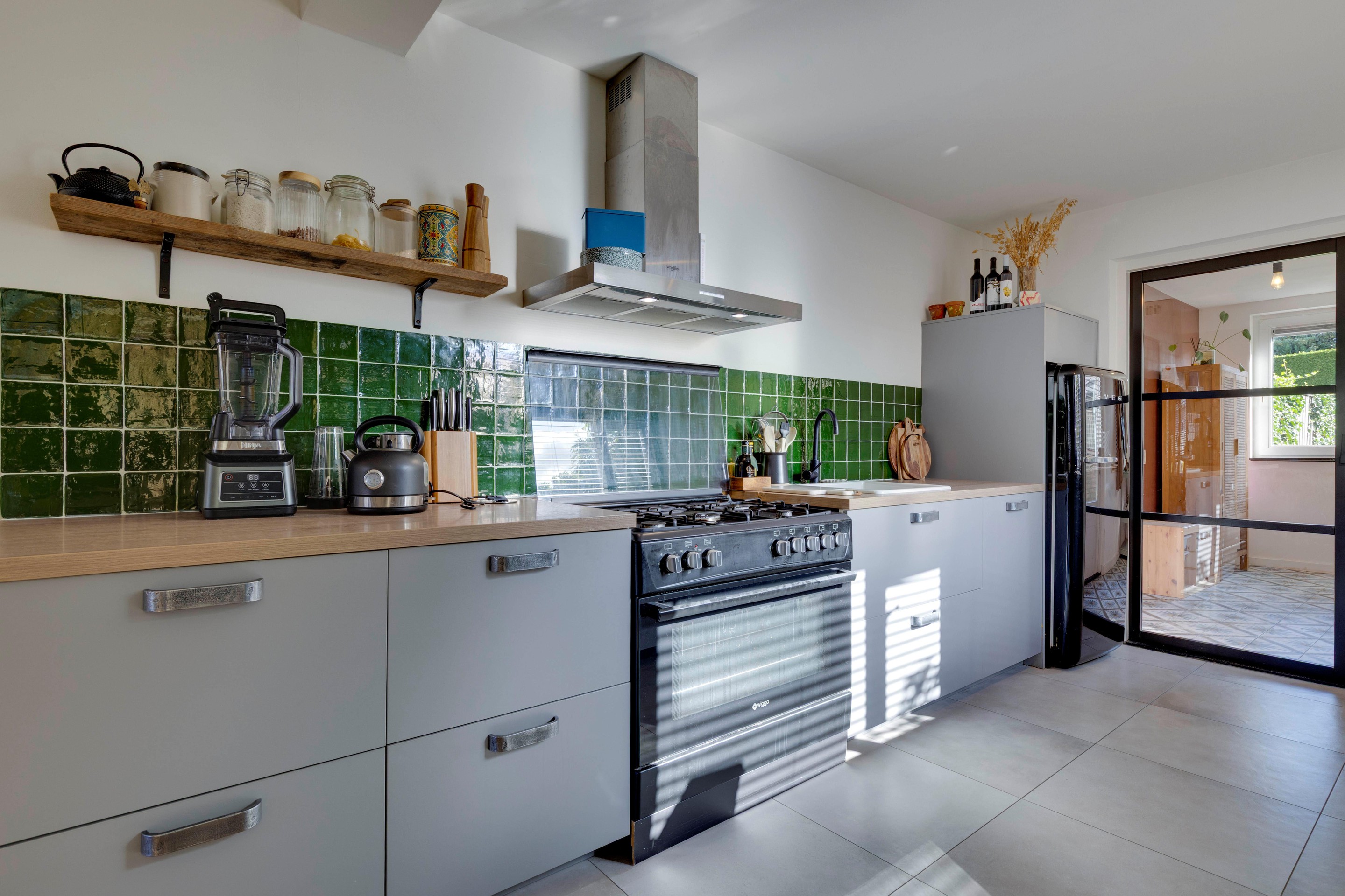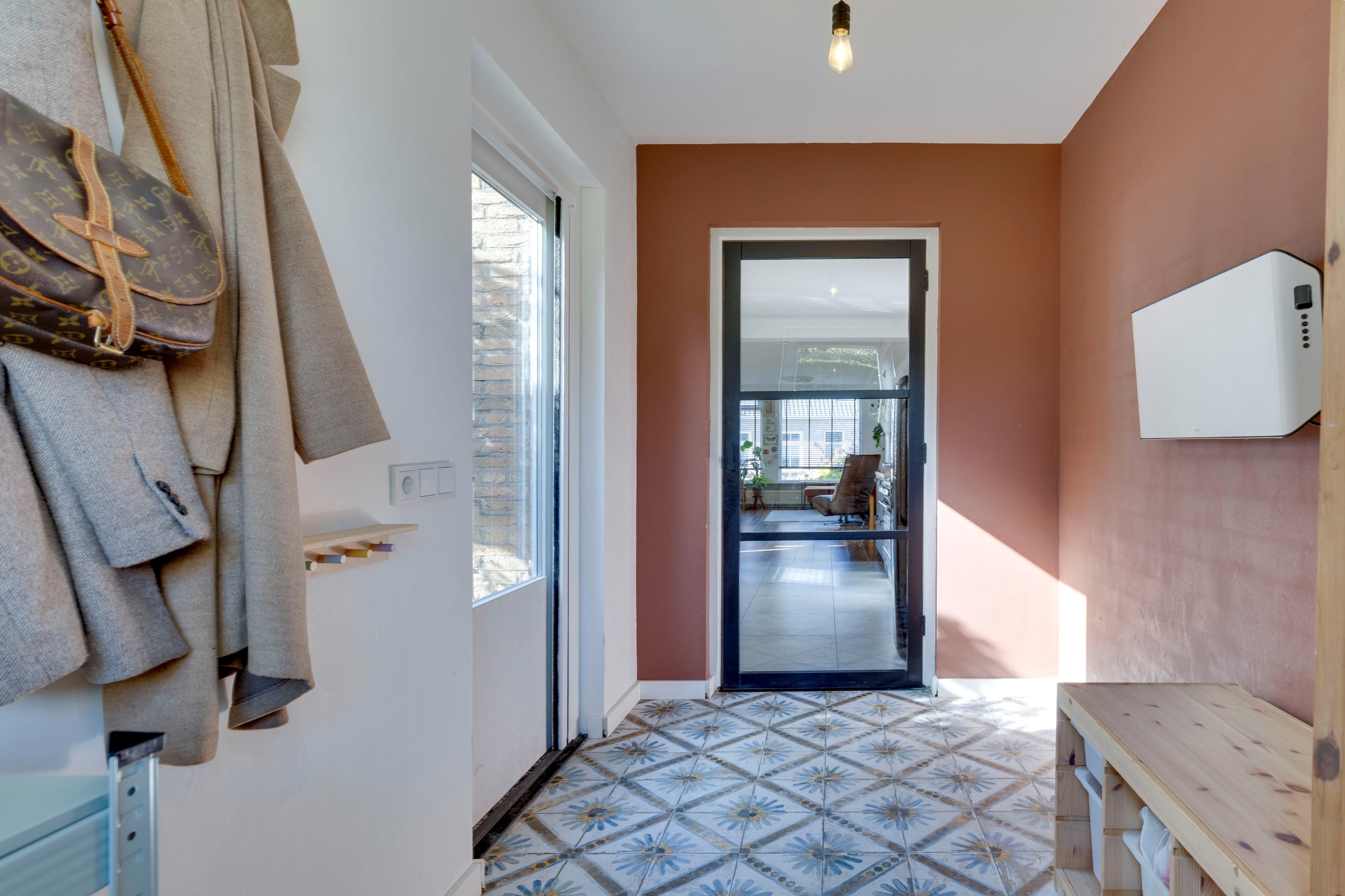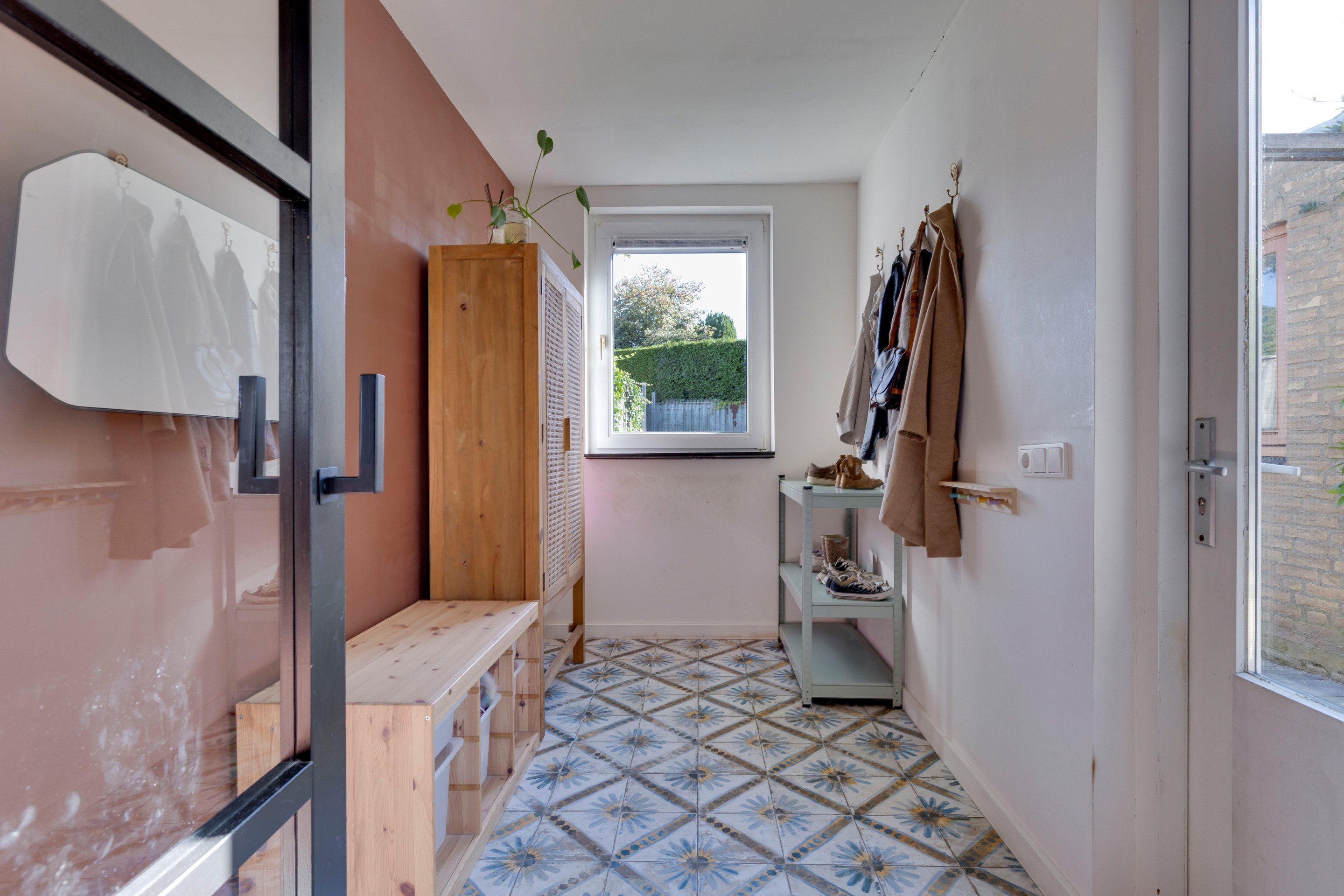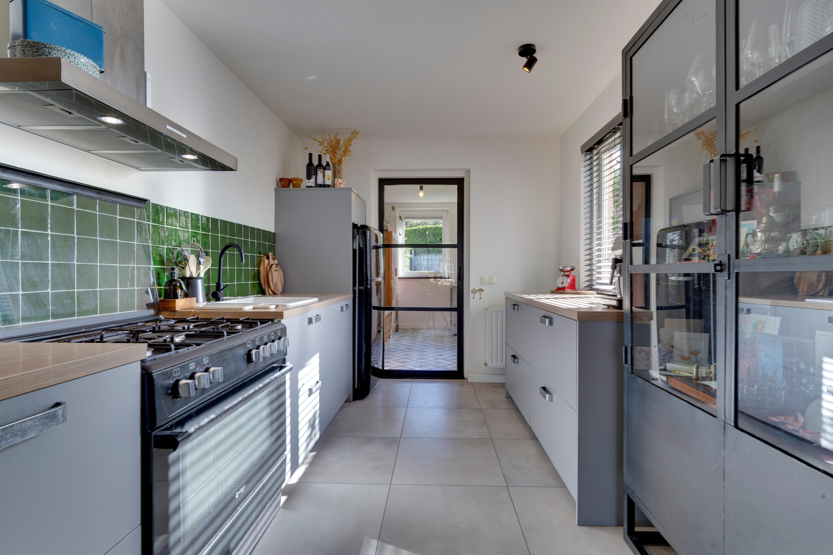 Aansluitend bevindt zich de praktische bijkeuken met kunststof kozijn, mediterrane tegelvloer, wandradiator en directe toegang tot de achtertuin.