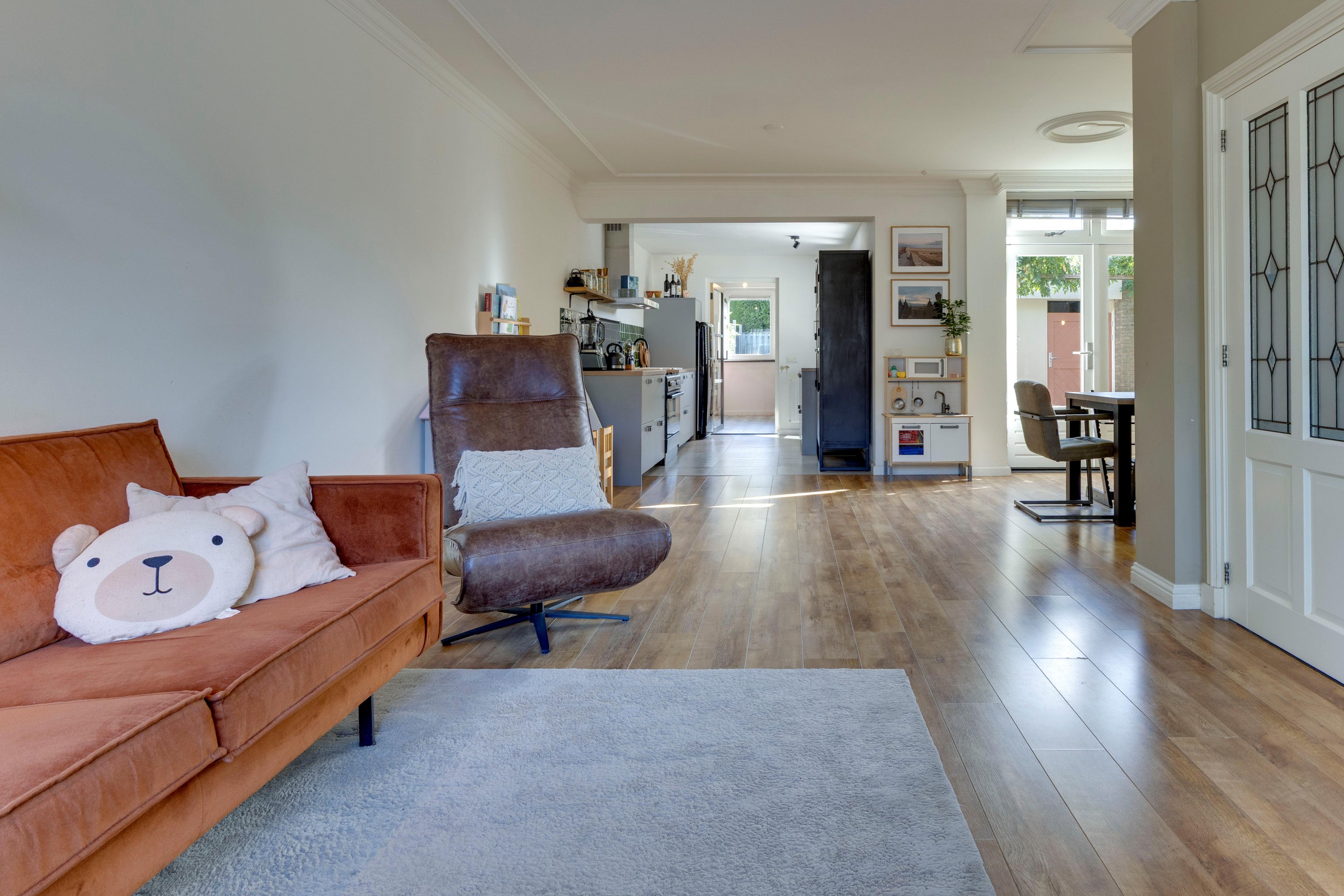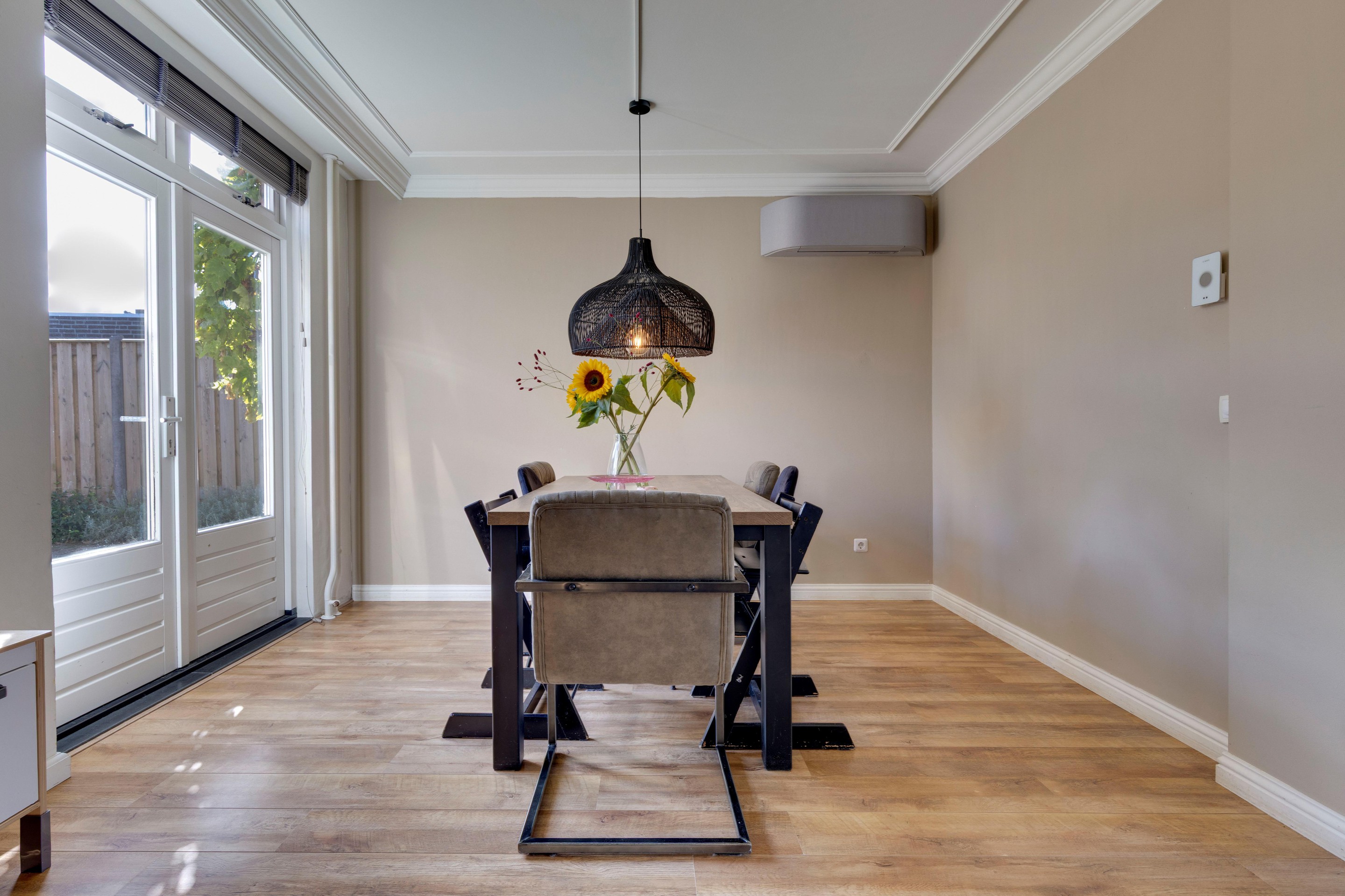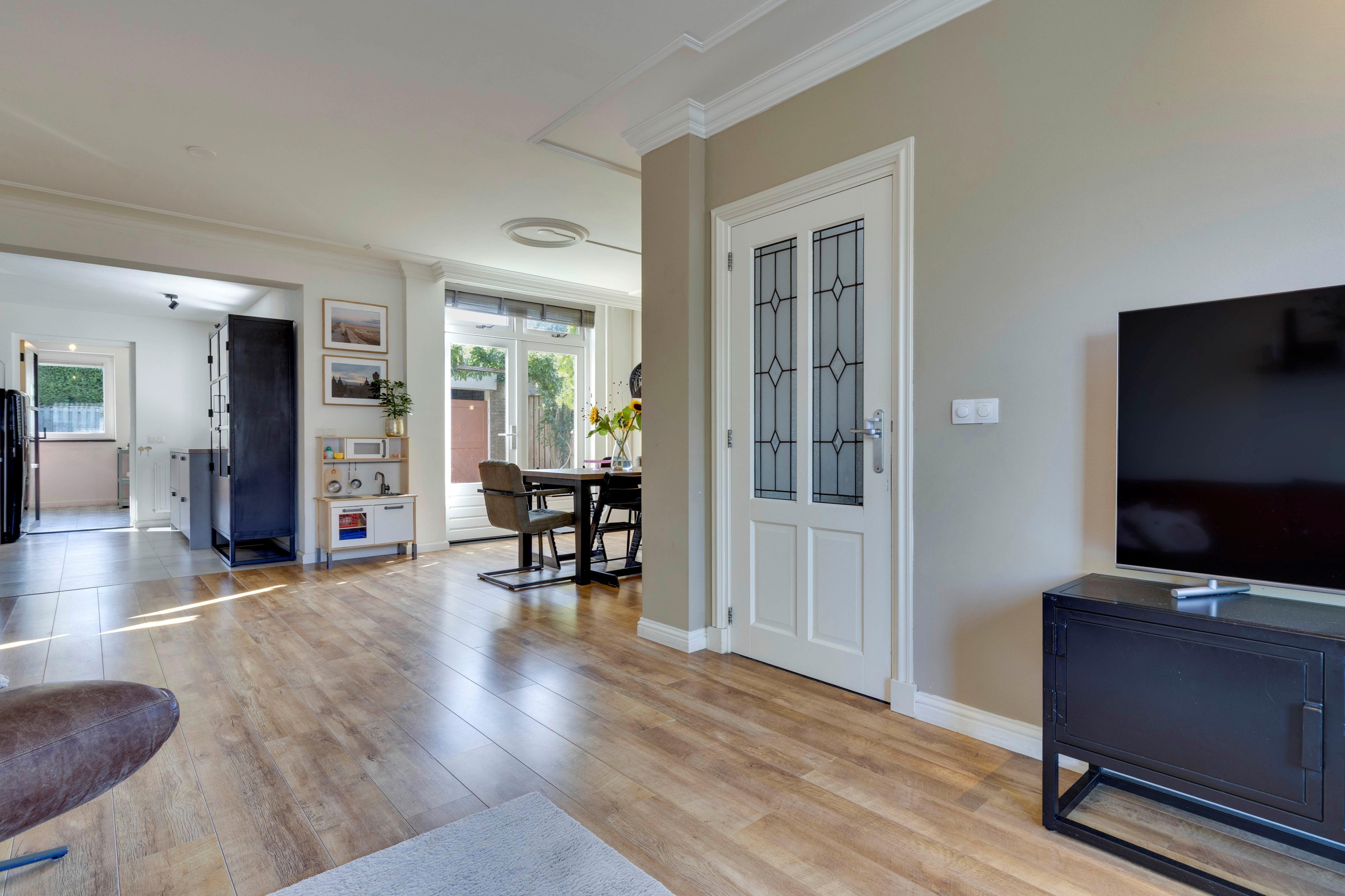 De lichte, ruime woonkamer voelt meteen prettig aan. Dankzij het vernieuwde grote raam aan de voorzijde, de openslaande tuindeuren en het strakke stucwerk is dit een heerlijke leefruimte. De airco zorgt het hele jaar door voor een aangenaam klimaat. De laminaatvloer en sierlijst langs het stucplafond met inbouwspots maken het geheel stijlvol en warm. Vanuit de woonkamer is er een open verbinding met de keuken.
