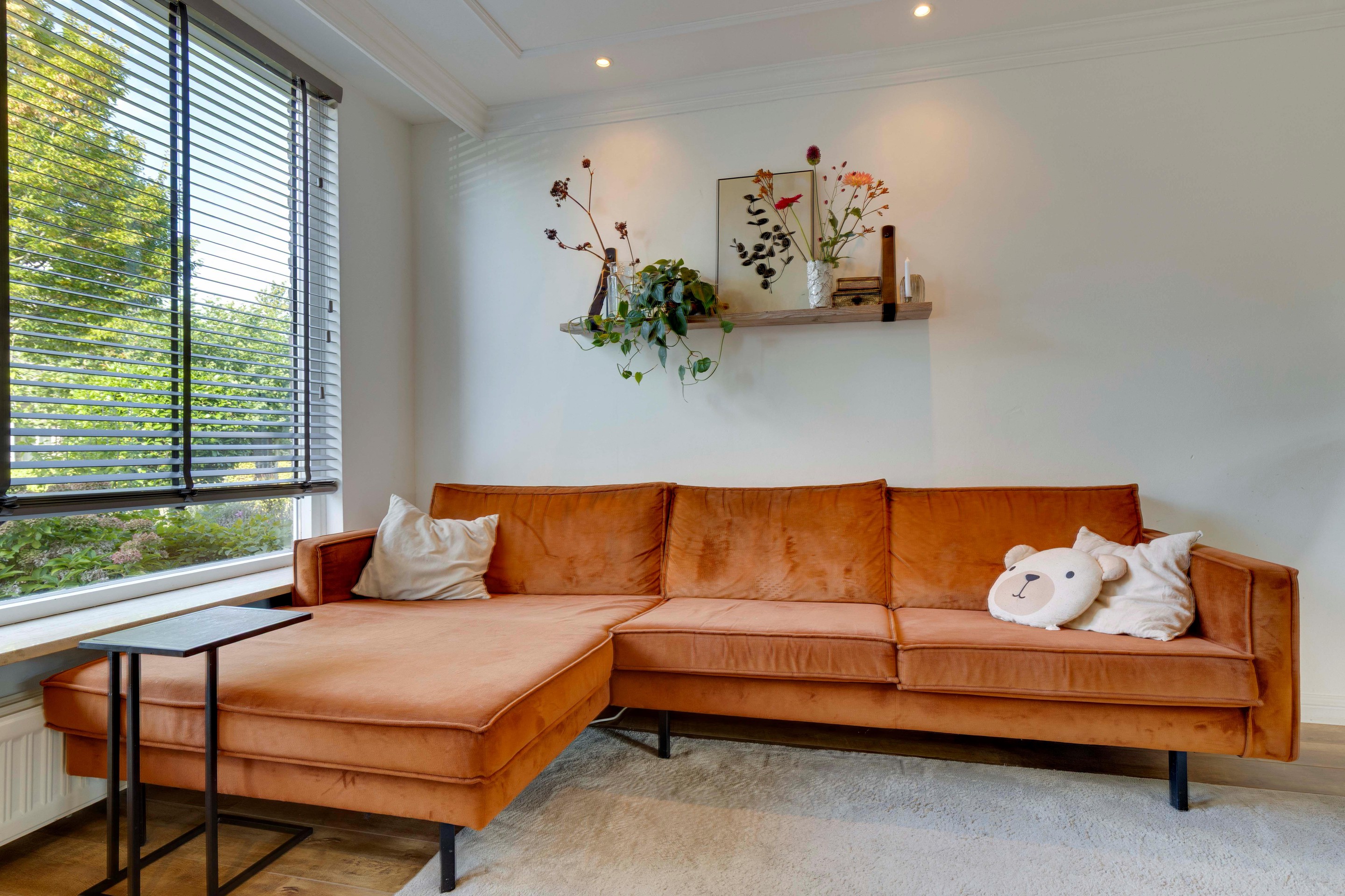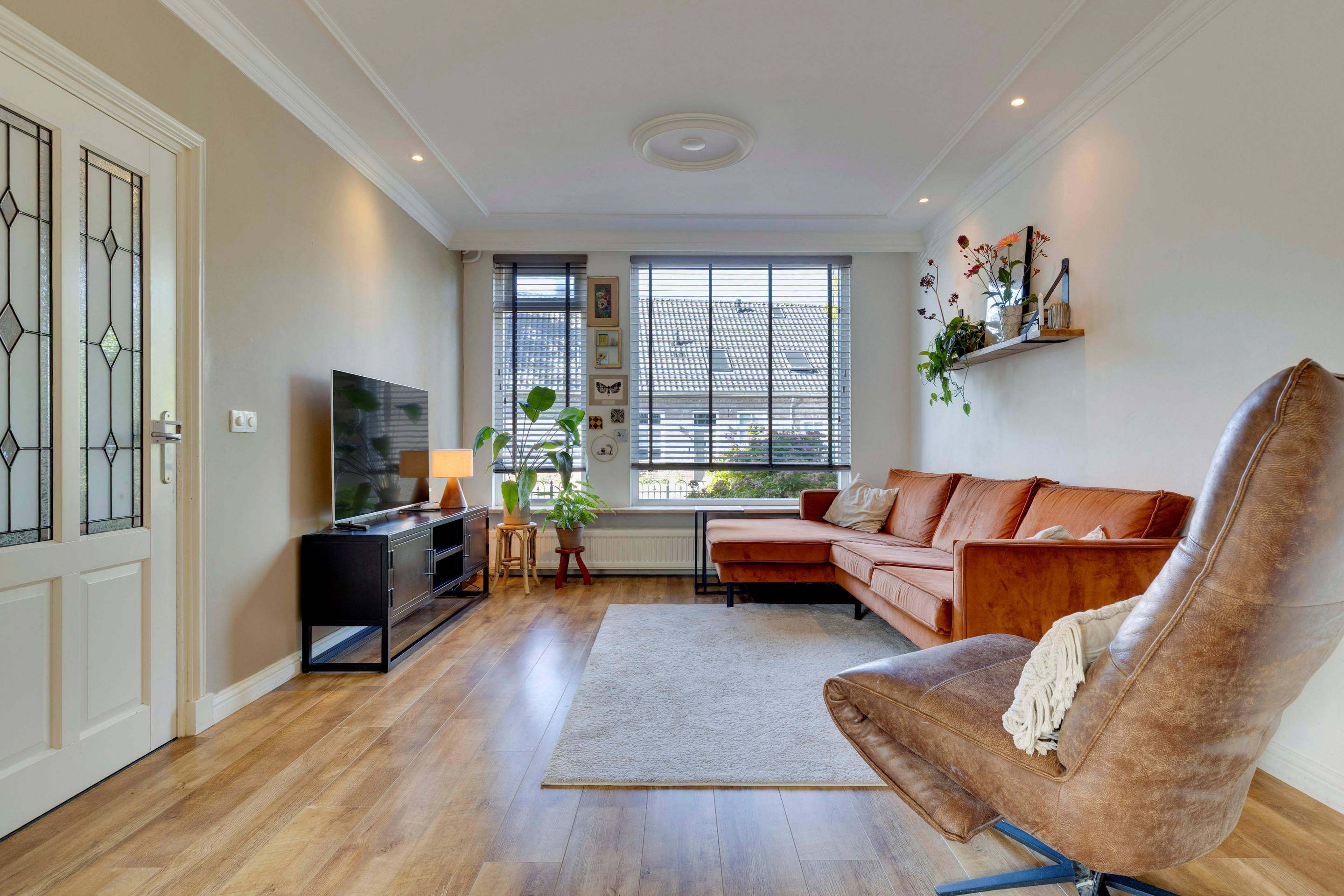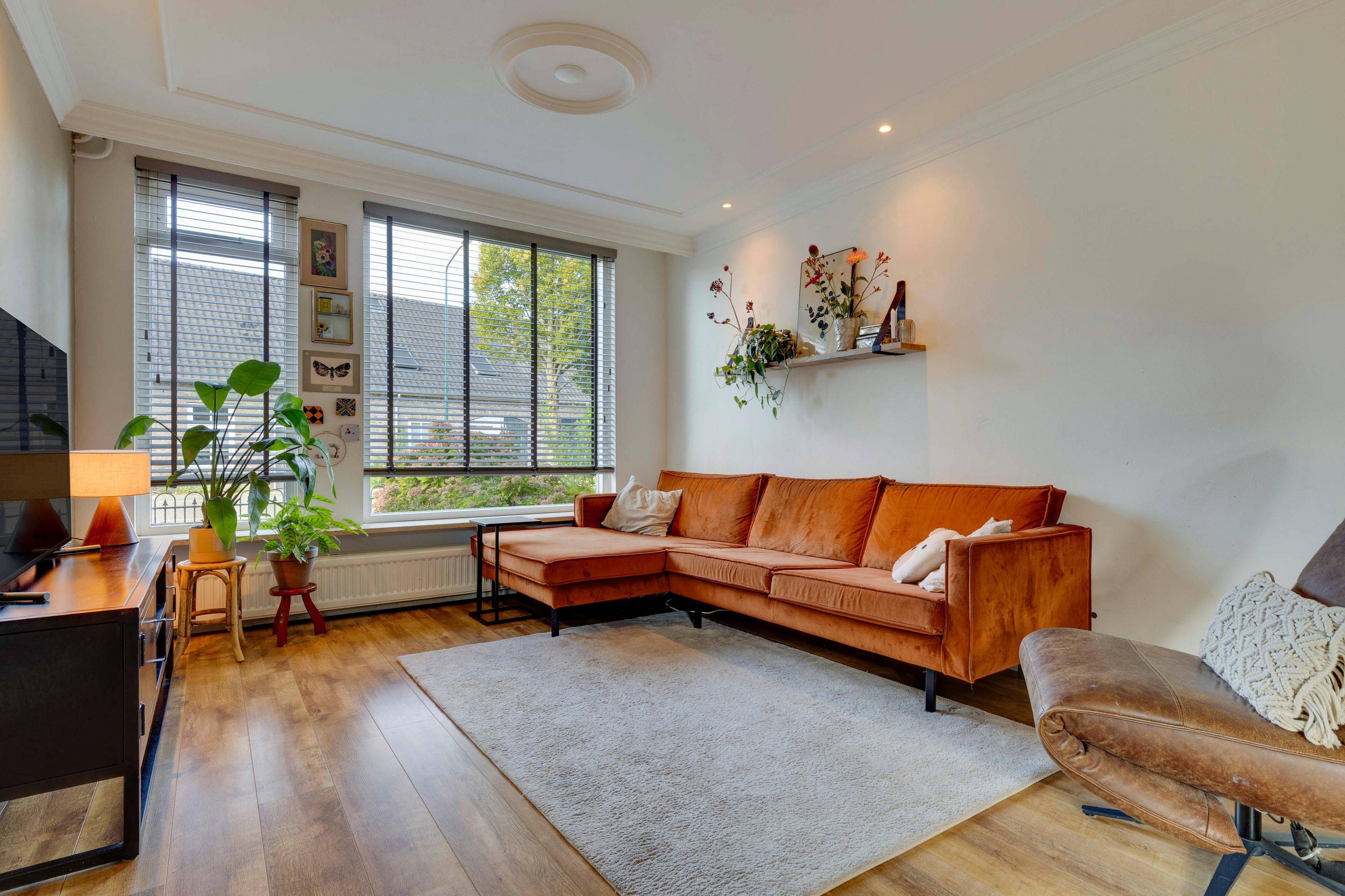De lichte, ruime woonkamer voelt meteen prettig aan. Dankzij het vernieuwde grote raam aan de voorzijde, de openslaande tuindeuren en het strakke stucwerk is dit een heerlijke leefruimte. De airco zorgt het hele jaar door voor een aangenaam klimaat. De laminaatvloer en sierlijst langs het stucplafond met inbouwspots maken het geheel stijlvol en warm. Vanuit de woonkamer is er een open verbinding met de keuken.