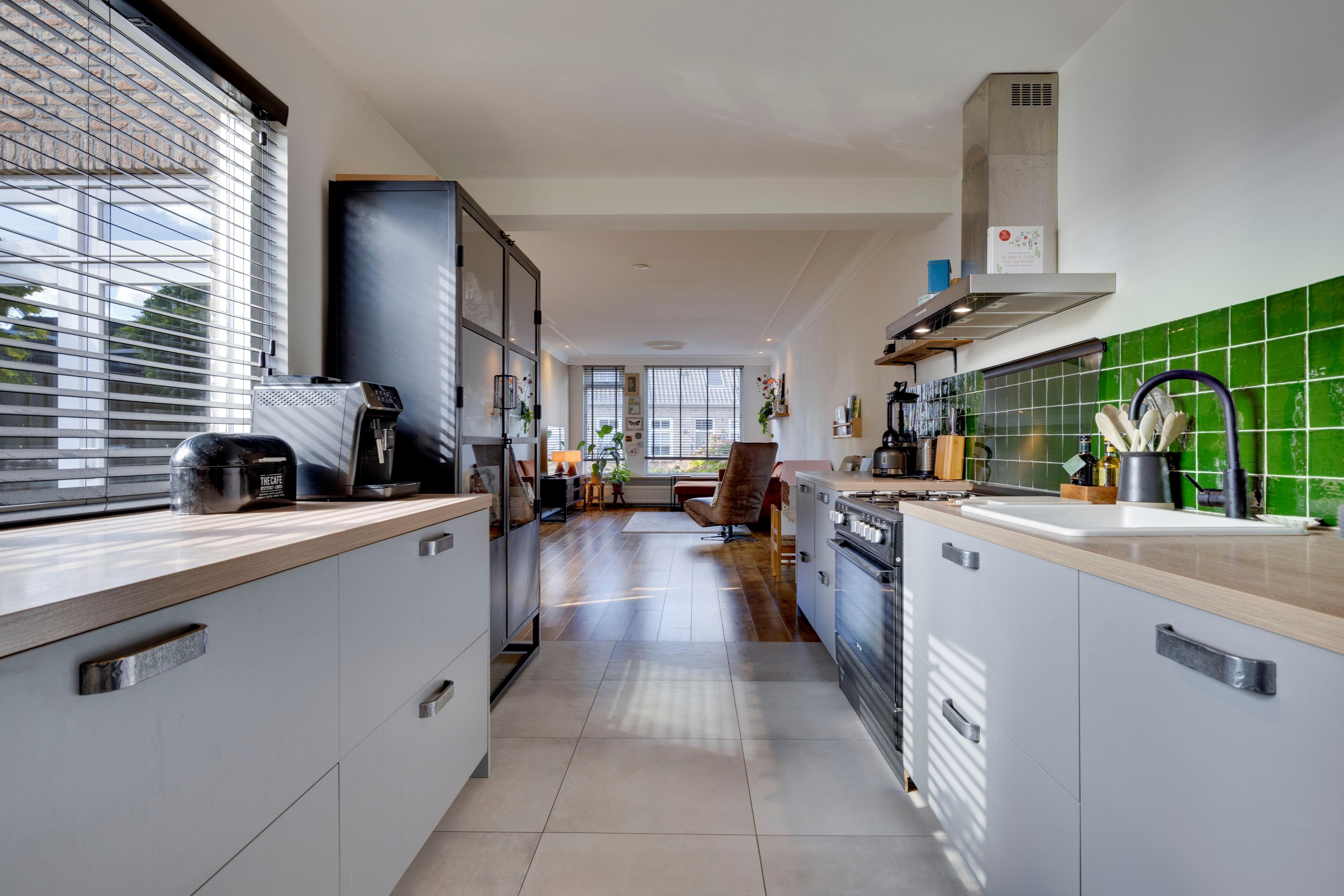 De royale keuken beschikt over een strak keukenblok in rechte opstelling met 5-pits gasfornuis met inbouwoven, vaatwasser en recirculatiekap. Een tweede keukenblok biedt extra werk- en bergruimte. De fijne lichtinval, praktische tegelvloer en deels betegelde achterwand maken het compleet.