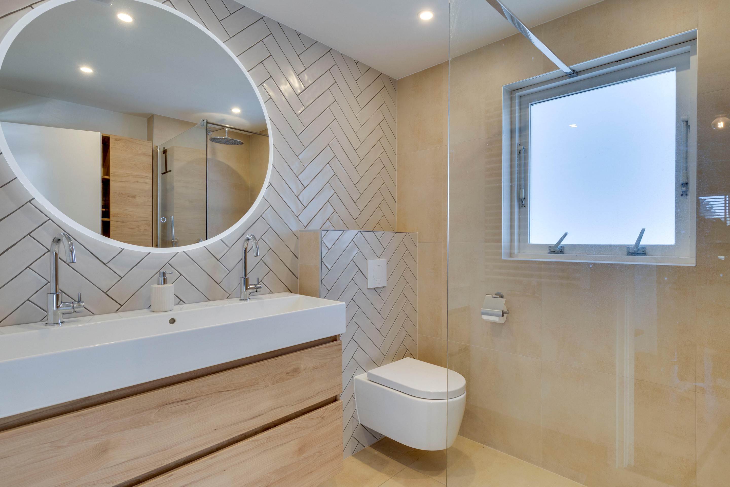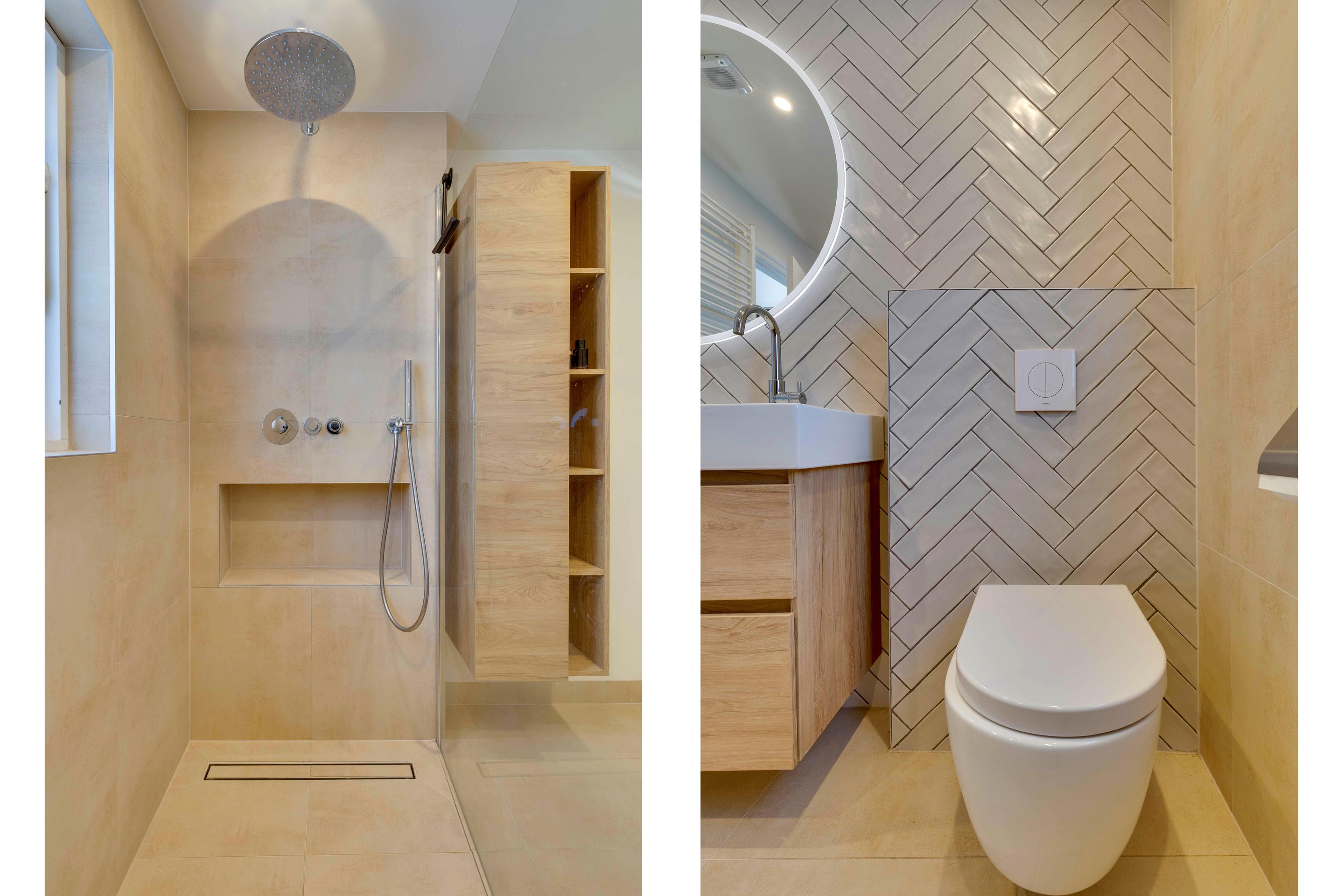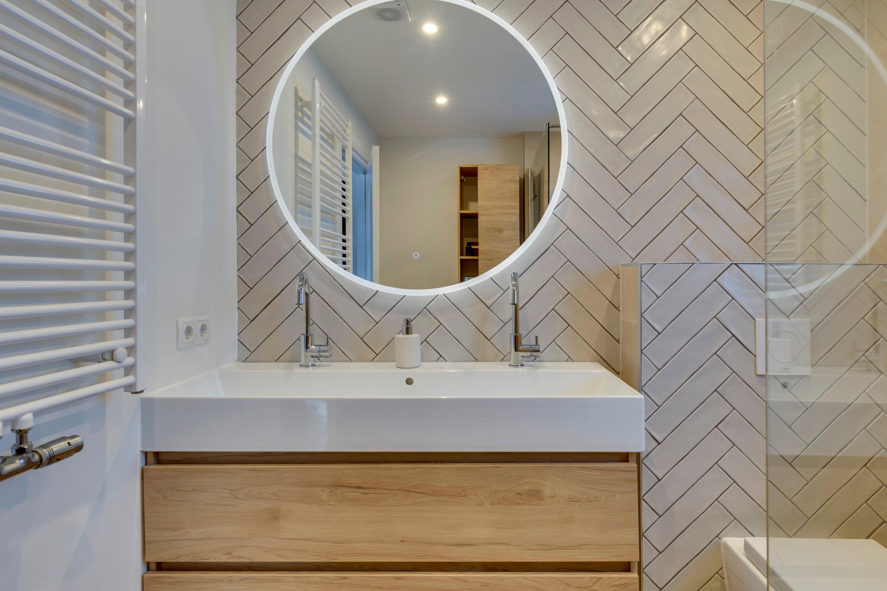 De moderne badkamer (2022) is een luxe plek om te ontspannen. Voorzien van een ruime inloopdouche, brede wastafel met meubel, vrijhangend toilet, wandradiator en hoogwaardige afwerking met tegels, stucwerk en inbouwspots. Dankzij het raam is er zowel natuurlijke ventilatie als prettig lichtinval.
