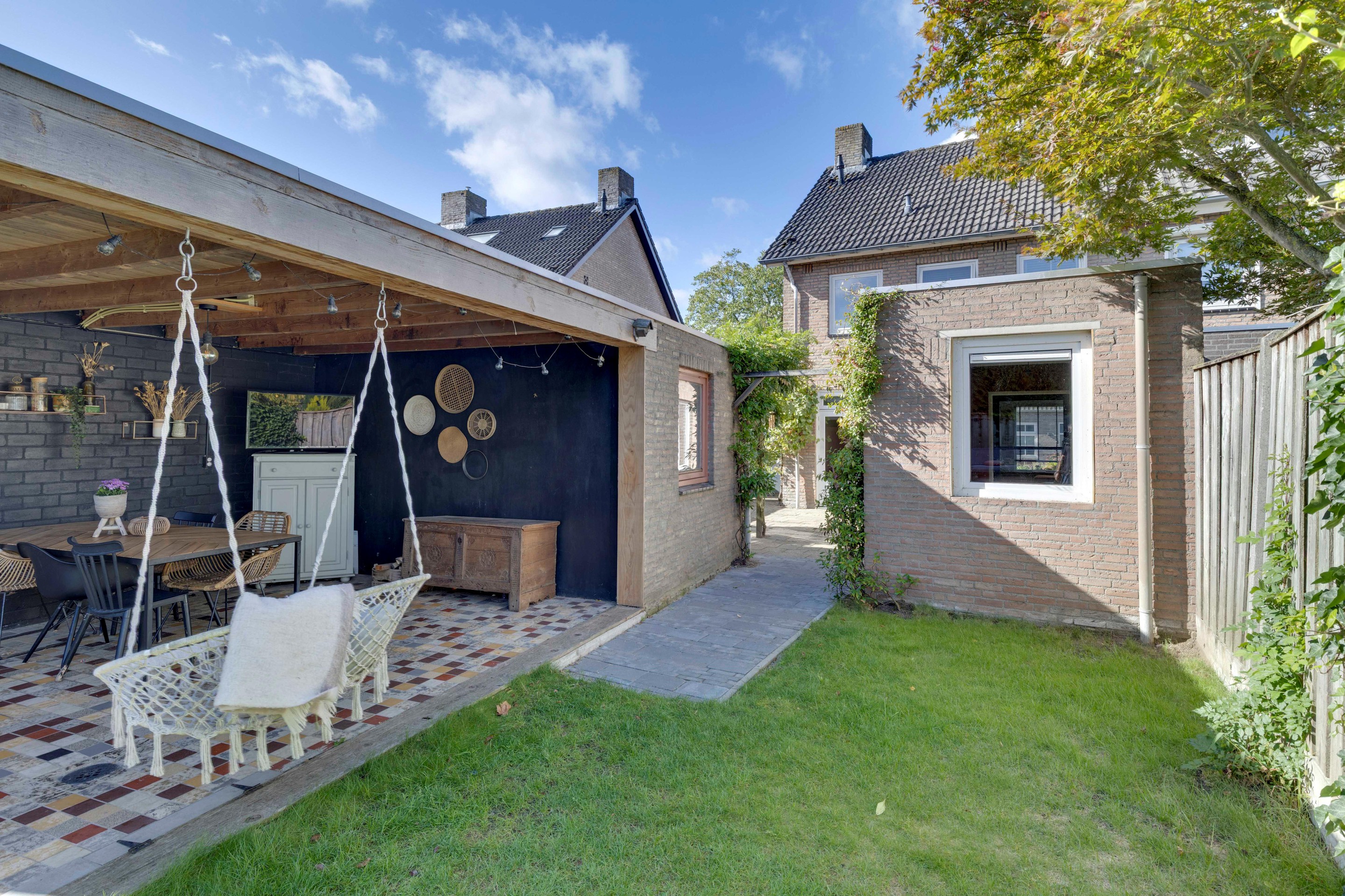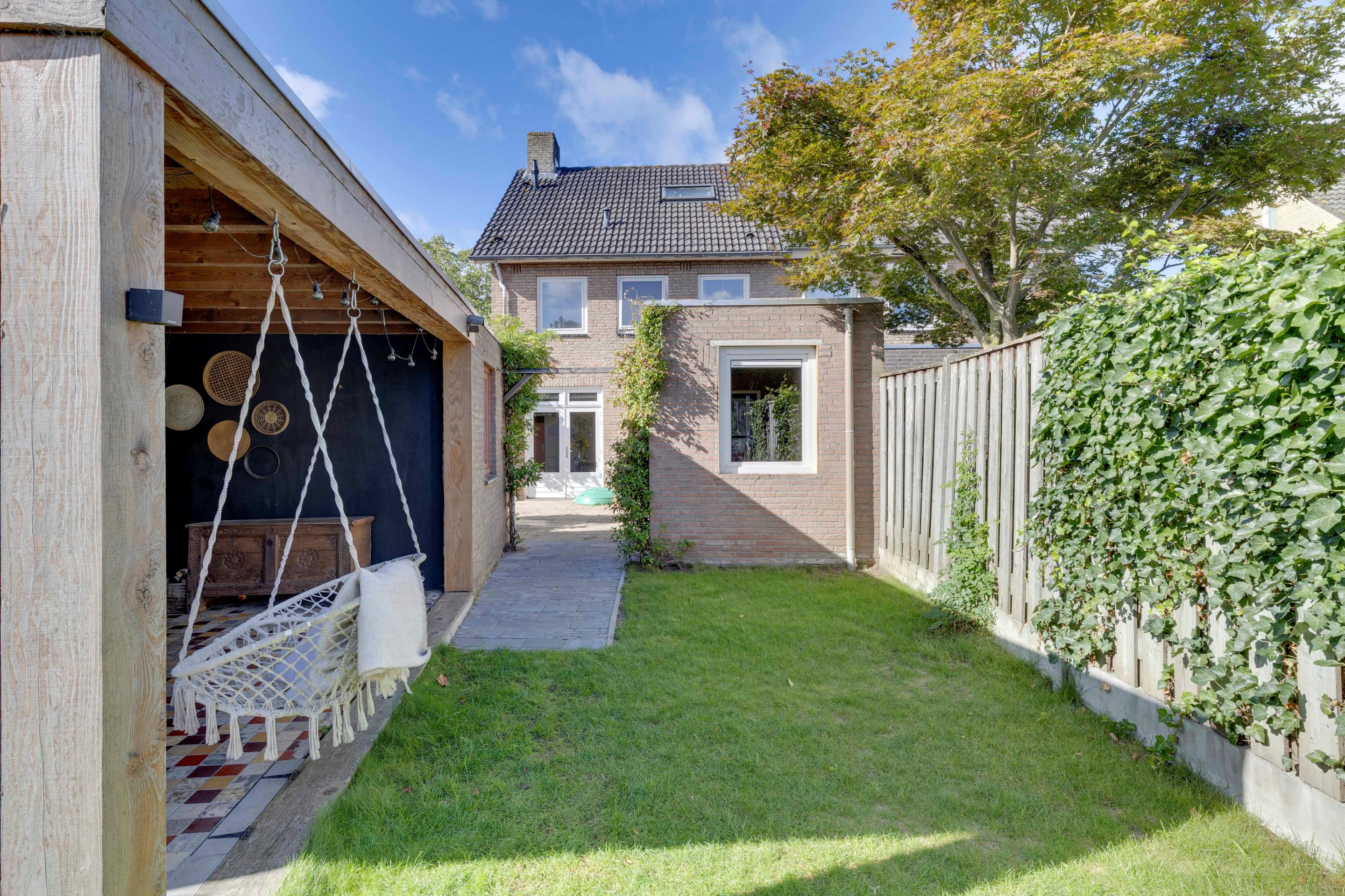 De diepe en zonnige achtertuin, gelegen op het noord-oosten biedt volop privacy en is ingedeeld met een royaal overkapt terras met een heerlijke zitmogelijkheid, een tweede vlonderterras, gazon en een ruime berging met stroomvoorziening. Via de vrije achterom bereik je de oprit. Dankzij de diepte van de tuin geniet je vrijwel de hele dag van de zon.
