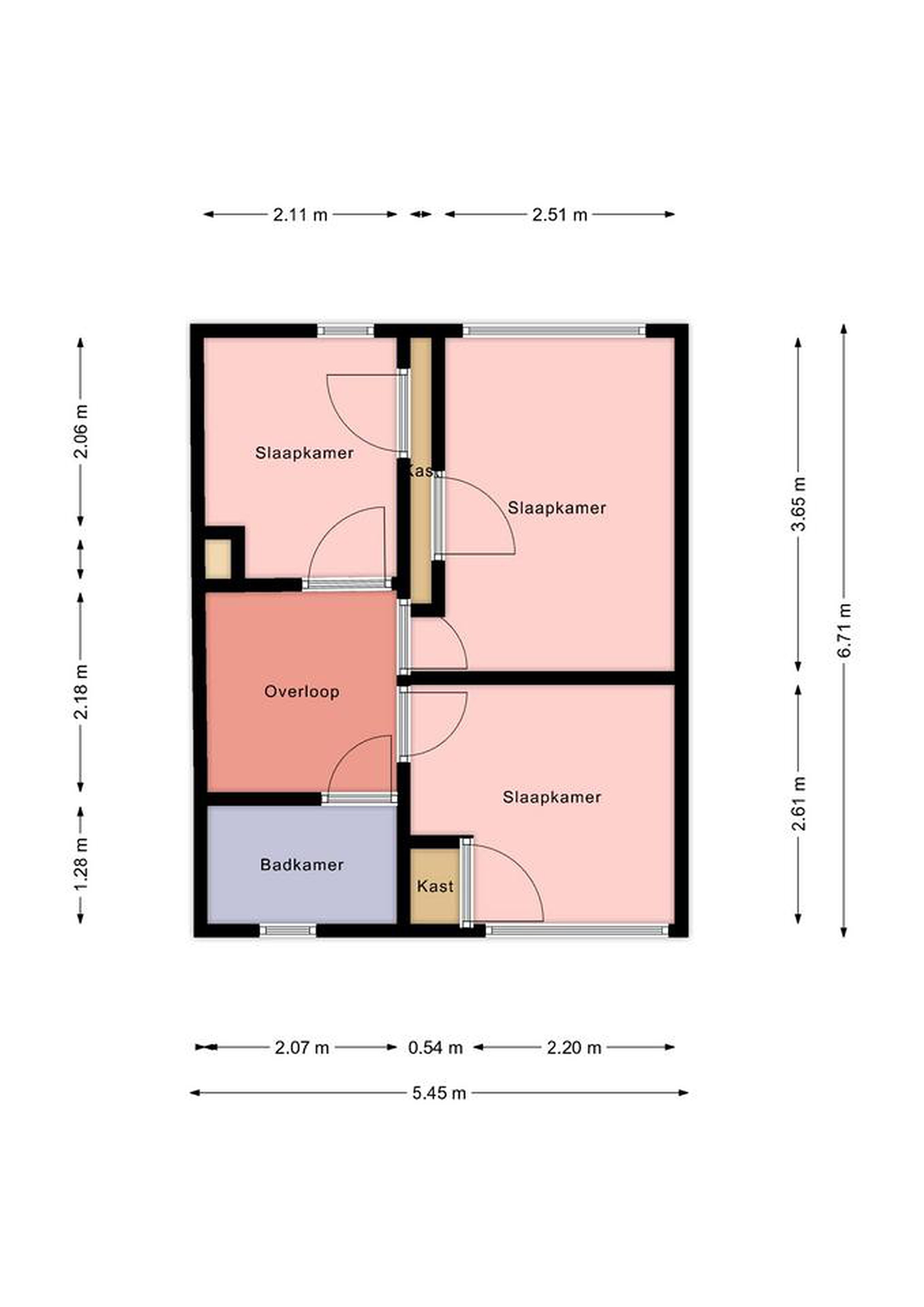 Eerste verdieping De eerste verdieping is voorzien van drie slaapkamers. De badkamer is eenvoudig, maar praktisch, met een douche en wastafel.
