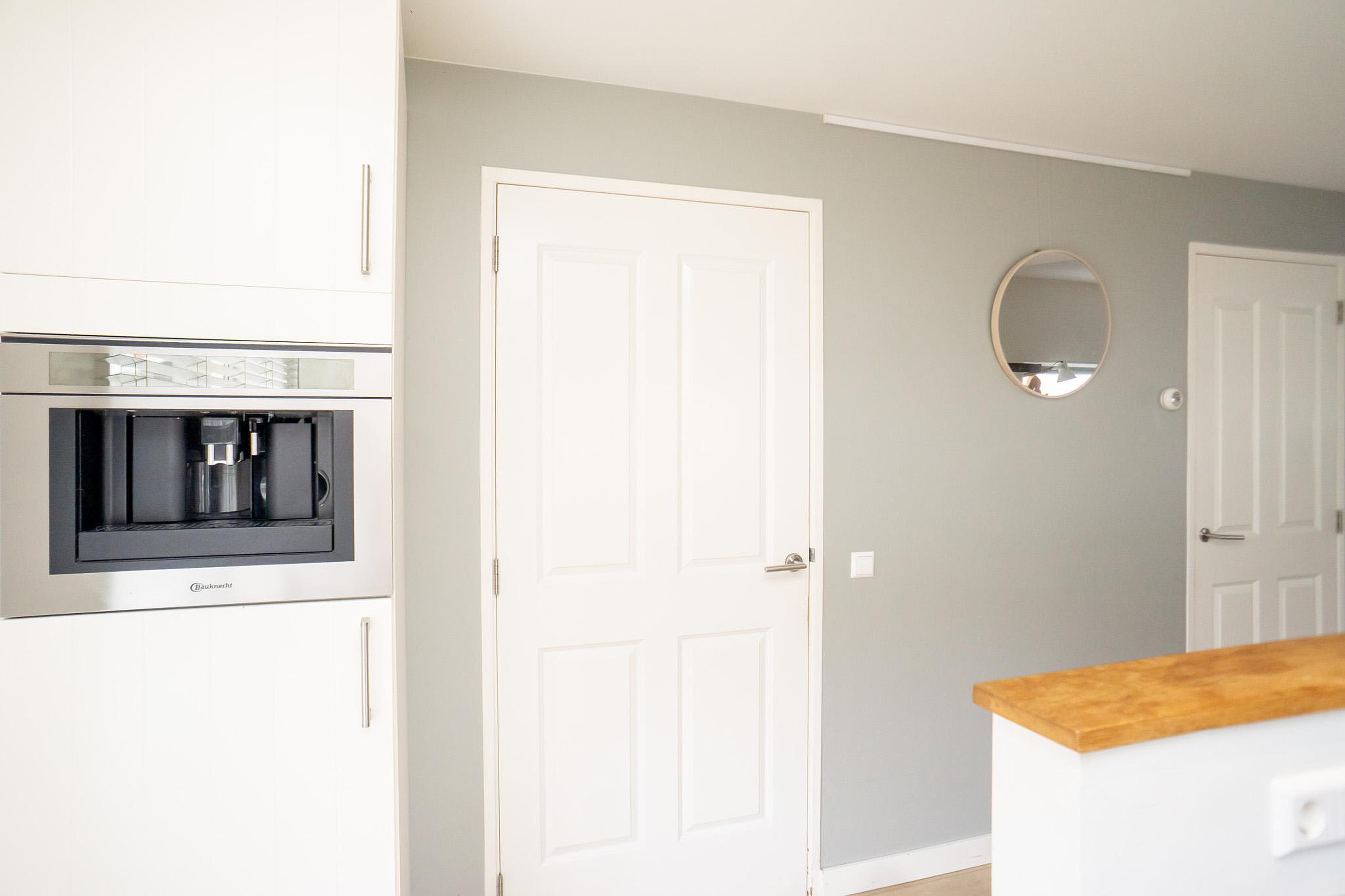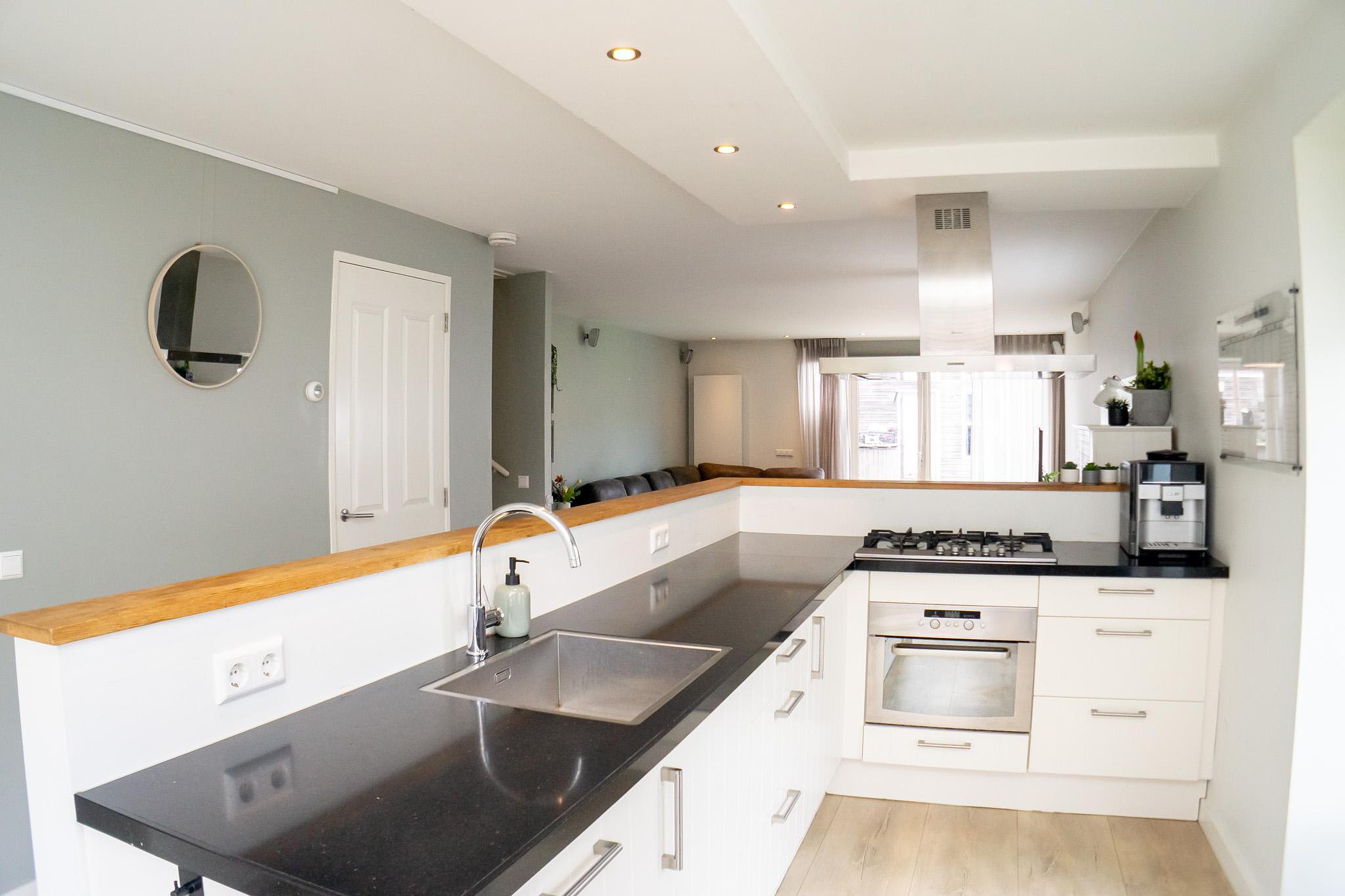 De uitgebouwde woonkamer vormt het hart van het huis en biedt een heerlijke, lichte leefruimte waar ontspanning en gezelligheid samenkomen. De open keuken sluit hier perfect op aan en is uitgerust met diverse inbouwapparatuur, ideaal voor uitgebreide diners en gezellige momenten met familie en vrienden.