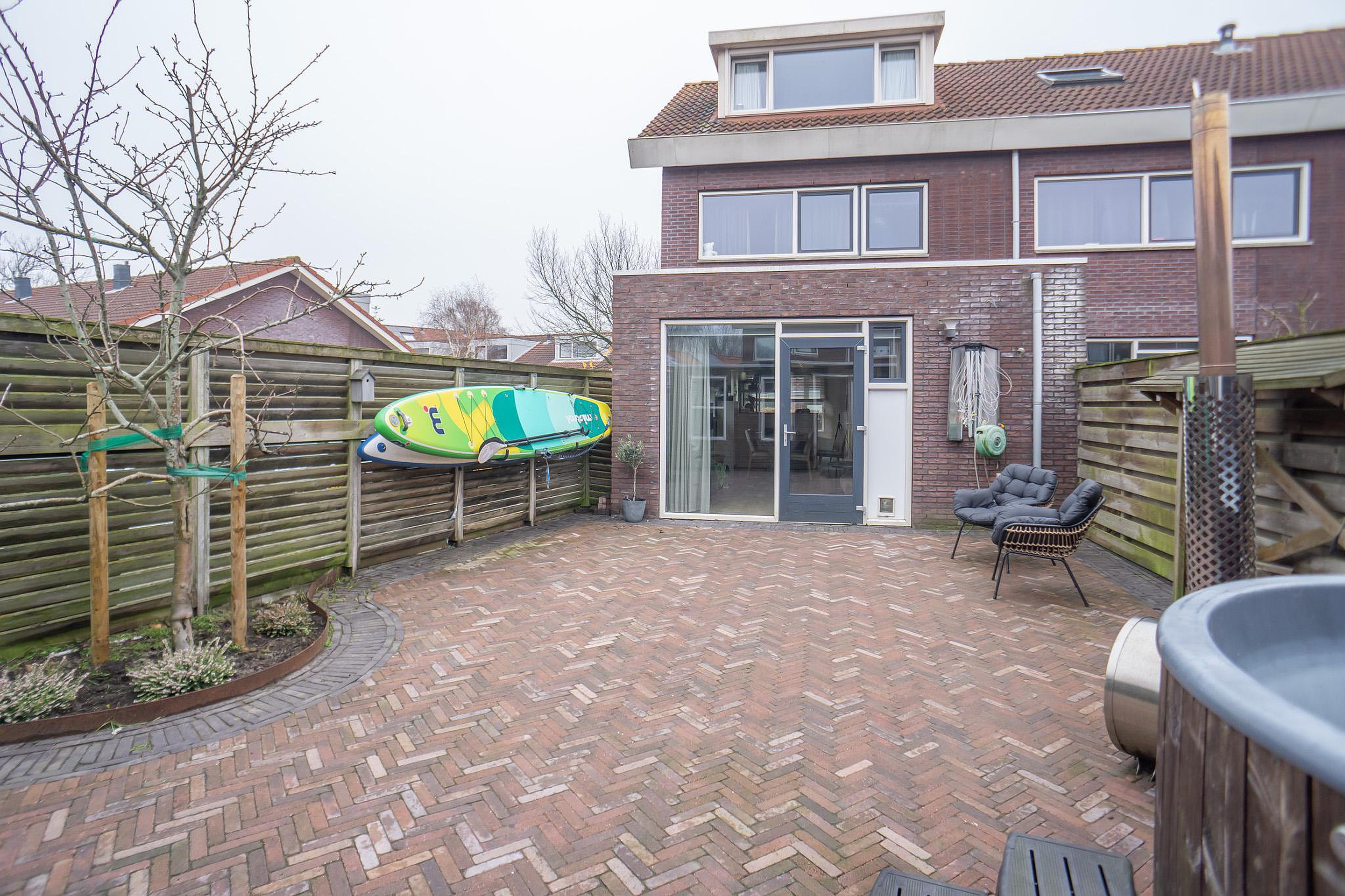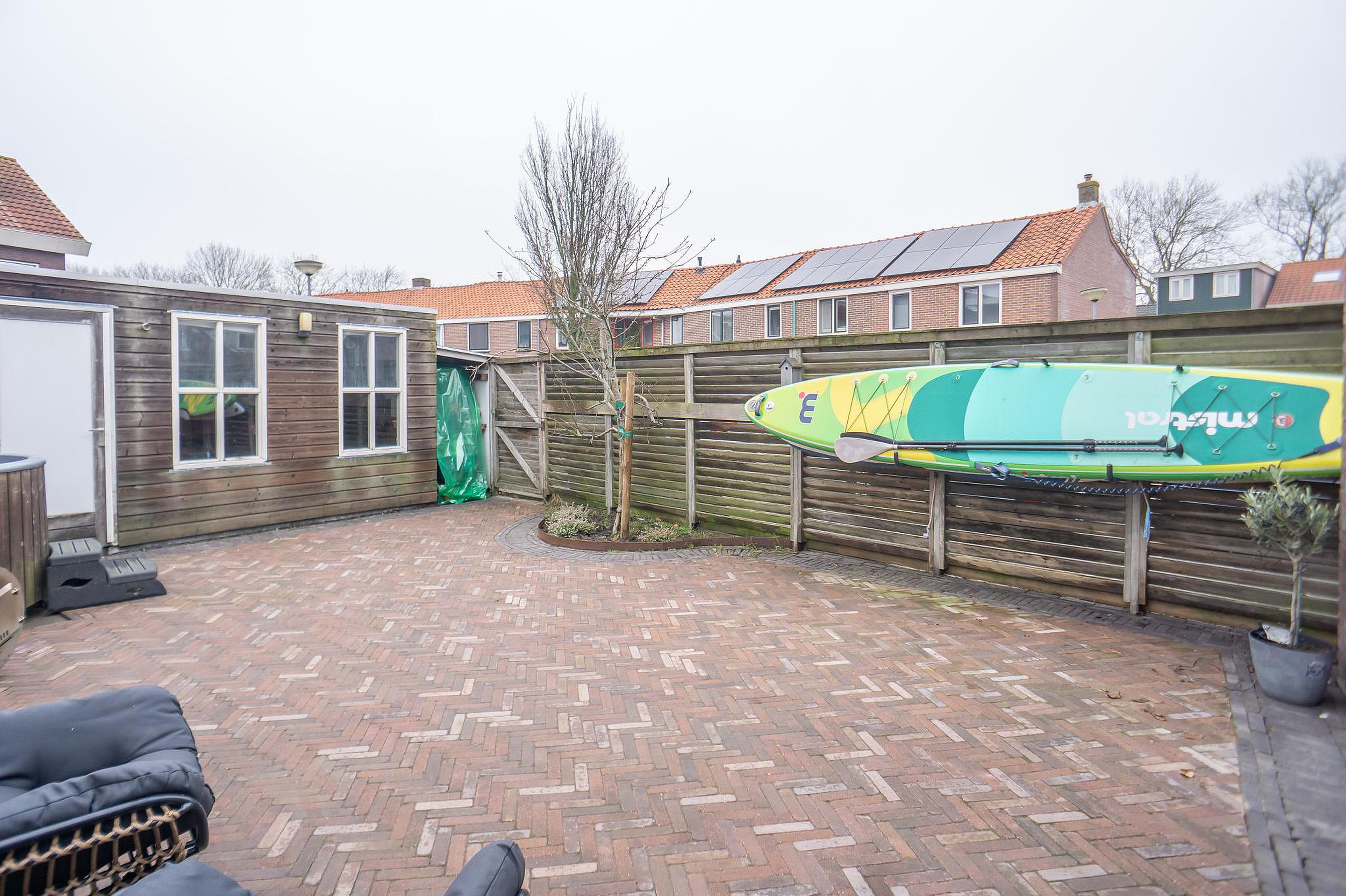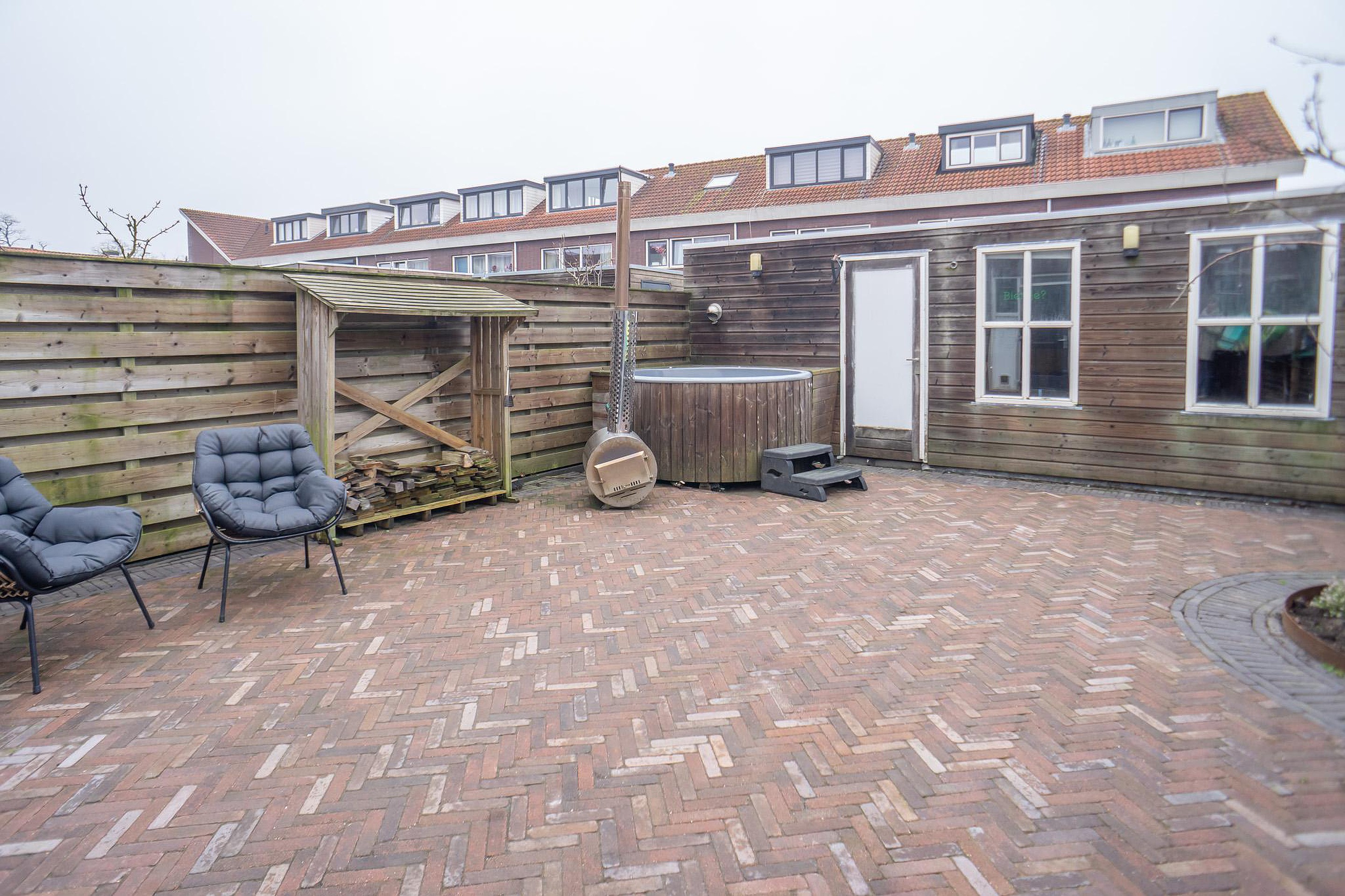 De achtertuin ligt op het noordwesten. Hier geniet u van privacy, rust en een unieke extra: een royale schuur/café met eigen toilet. Perfect als thuiskantoor, praktijkruimte, man cave of sfeervolle plek voor lange zomeravonden. Parkeren? Naast de woning bevinden zich de openbare parkeerplaatsen.
