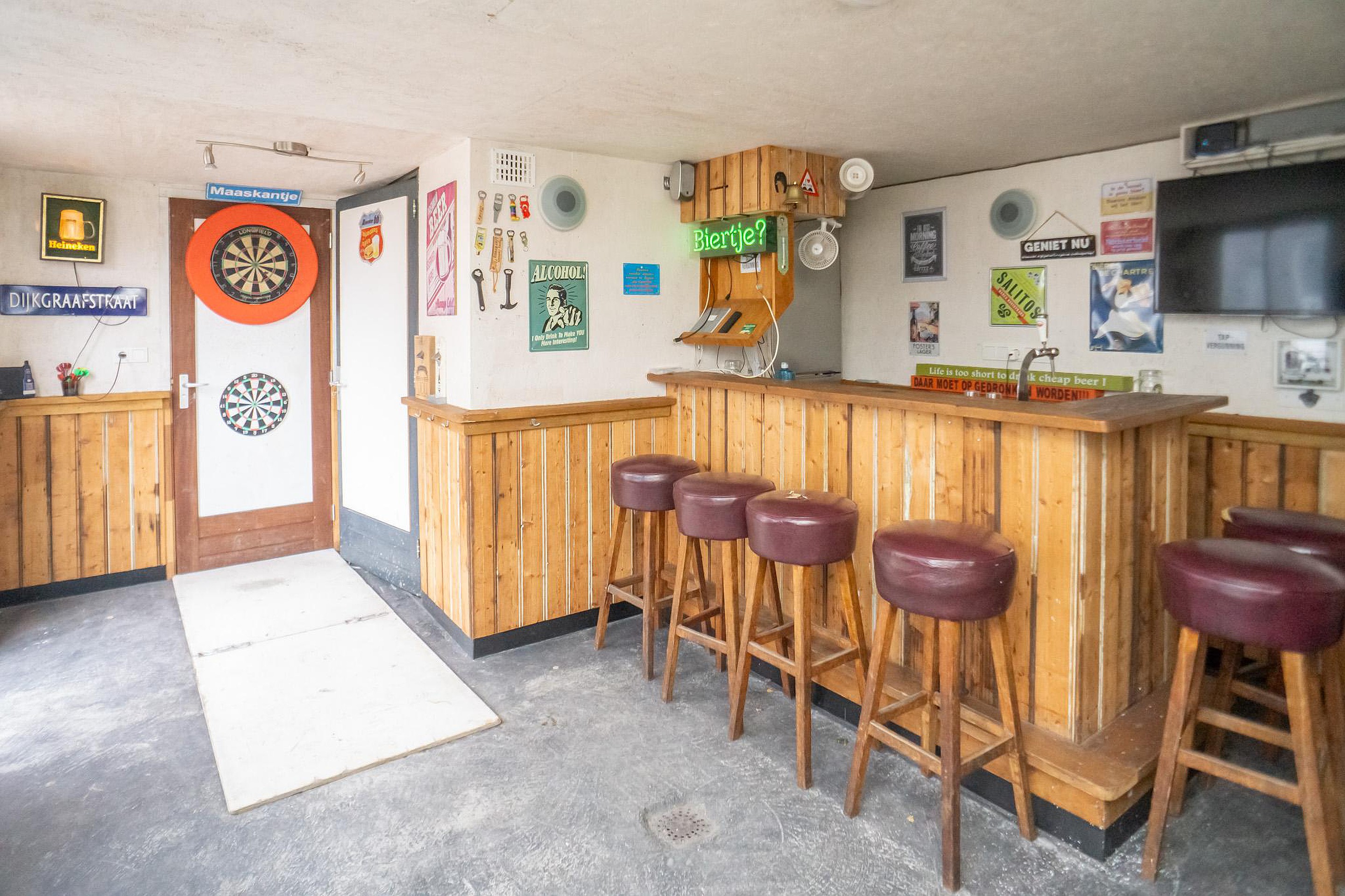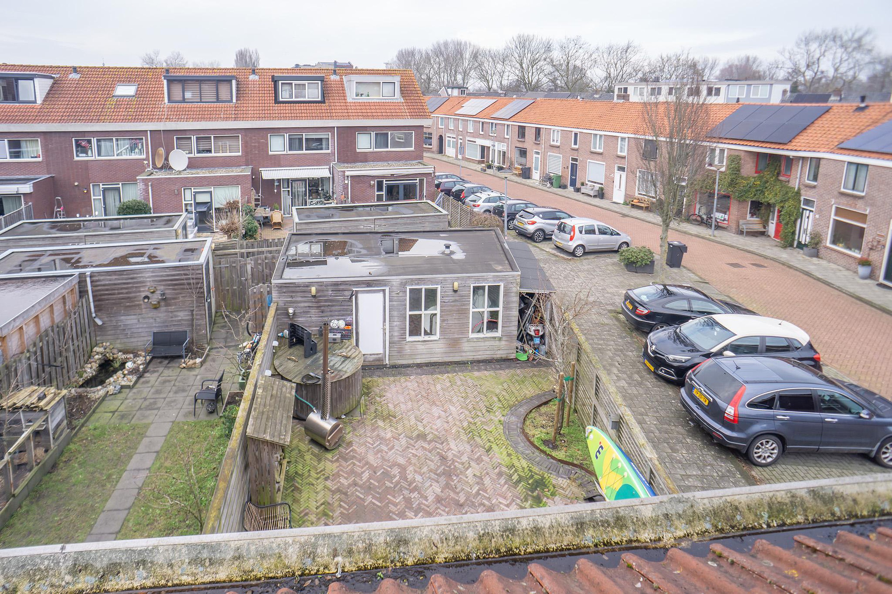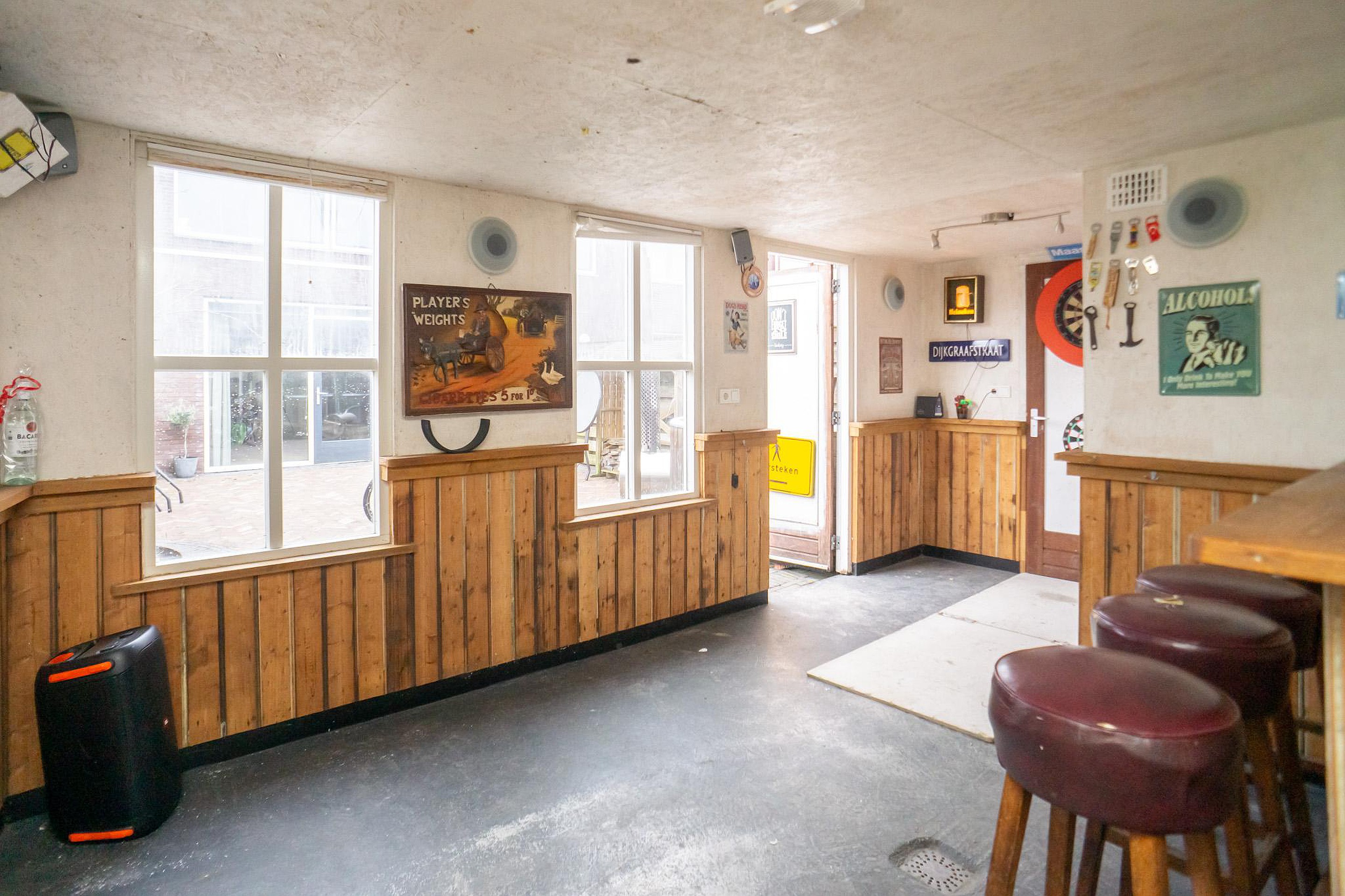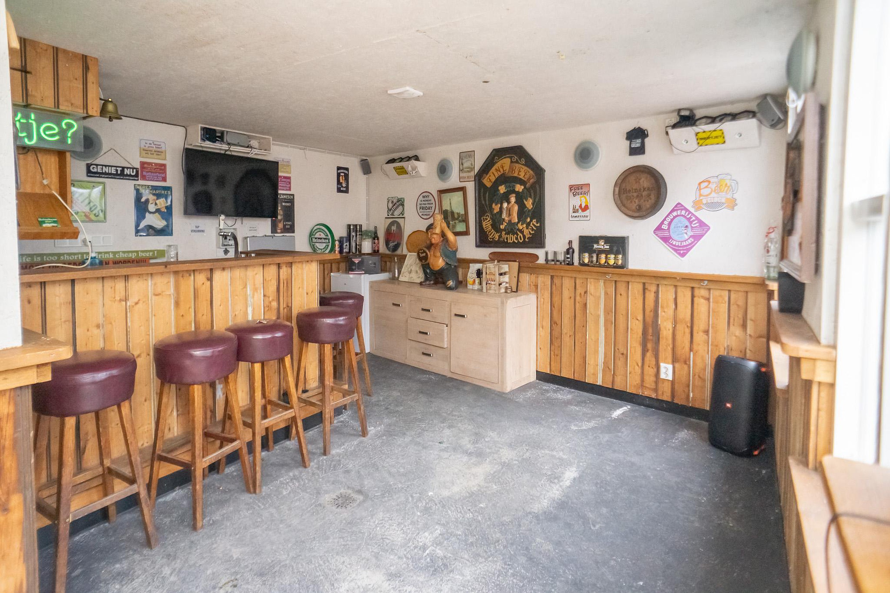 De achtertuin ligt op het noordwesten. Hier geniet u van privacy, rust en een unieke extra: een royale schuur/café met eigen toilet. Perfect als thuiskantoor, praktijkruimte, man cave of sfeervolle plek voor lange zomeravonden. Parkeren? Naast de woning bevinden zich de openbare parkeerplaatsen.