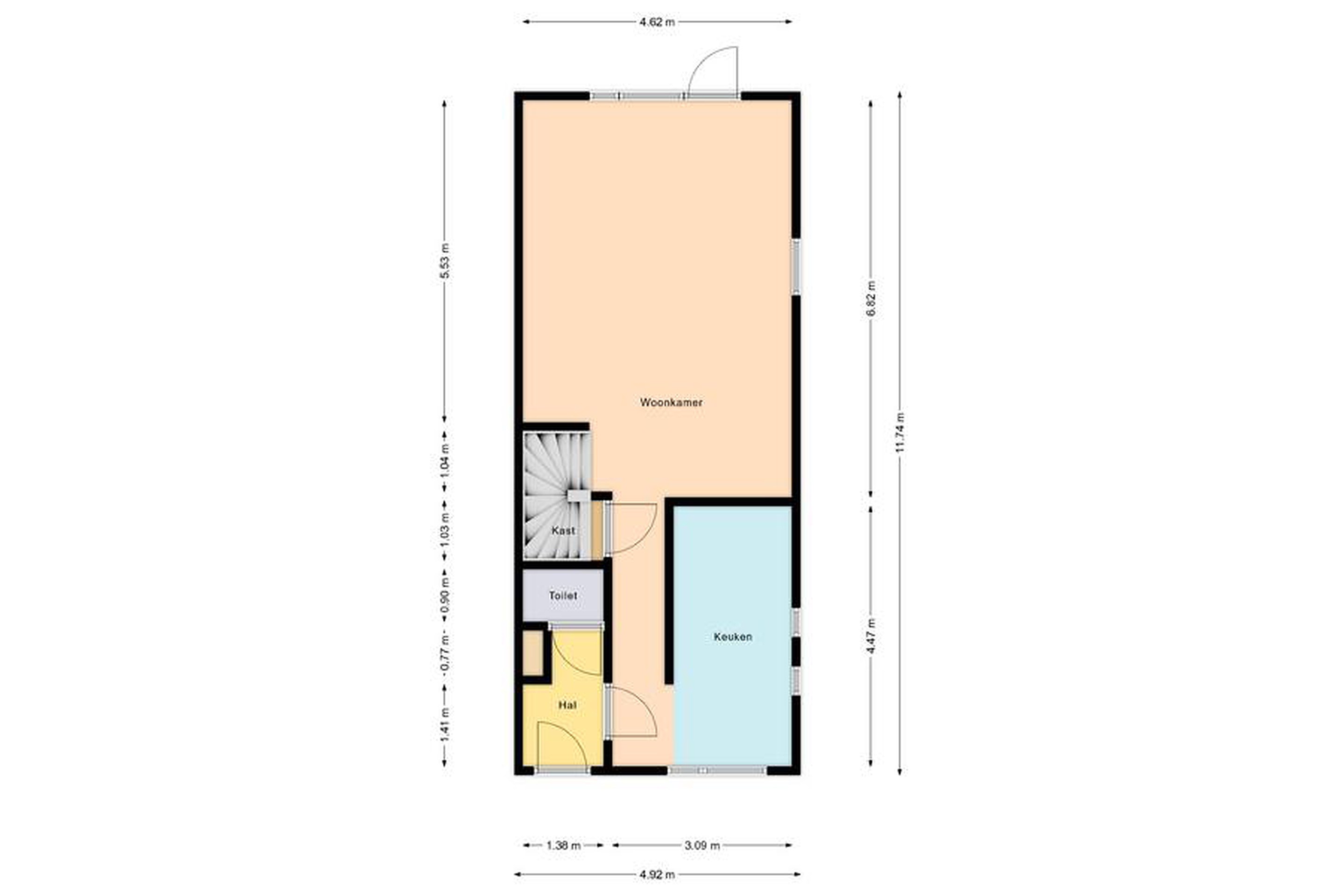 Entree met hal en toilet. Royale, uitgebouwde woonkamer met open keuken en veel lichtinval.