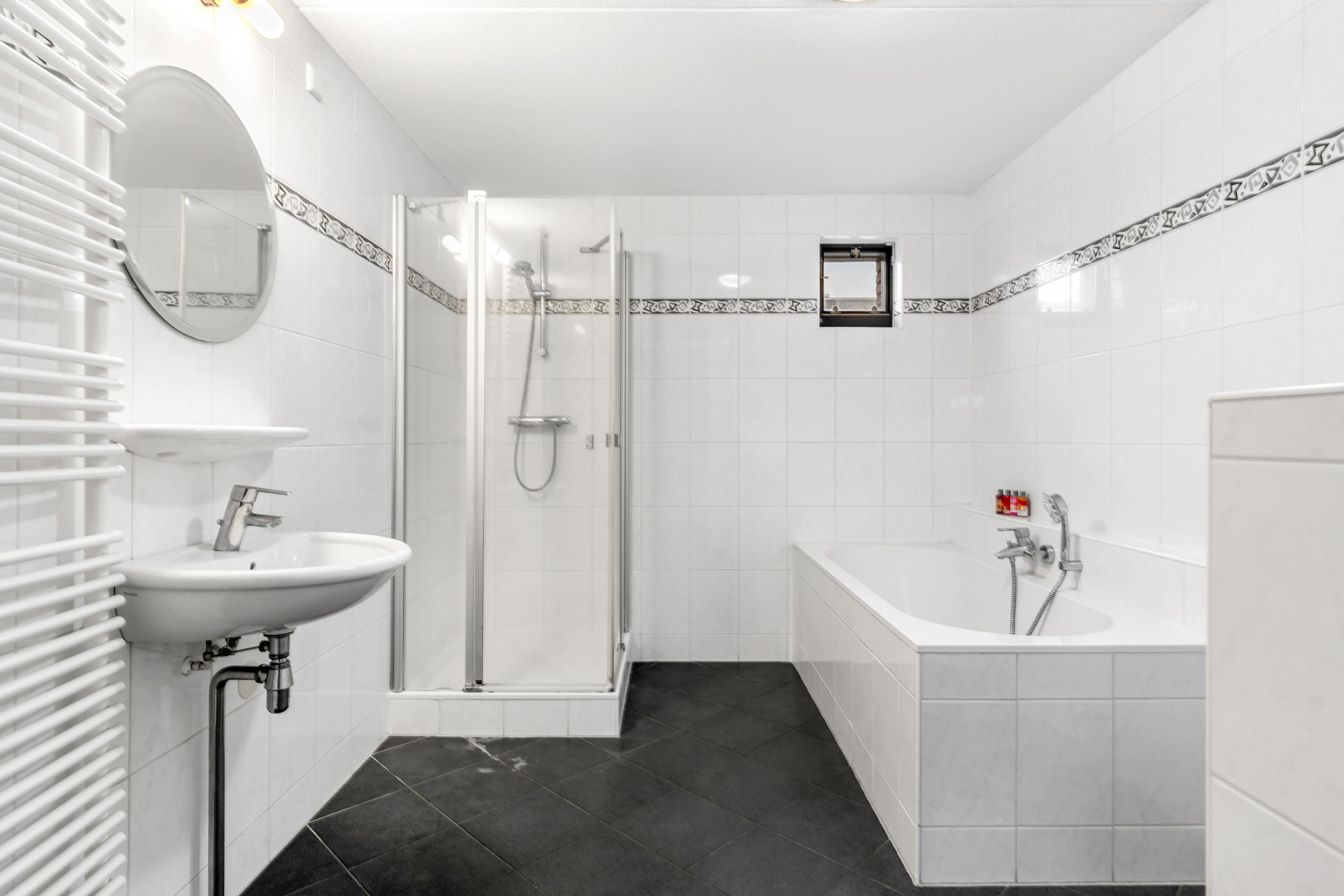 De badkamer van ruim 8 m2 is uitgerust met een douche, ligbad, wastafelmeubel en een toilet.