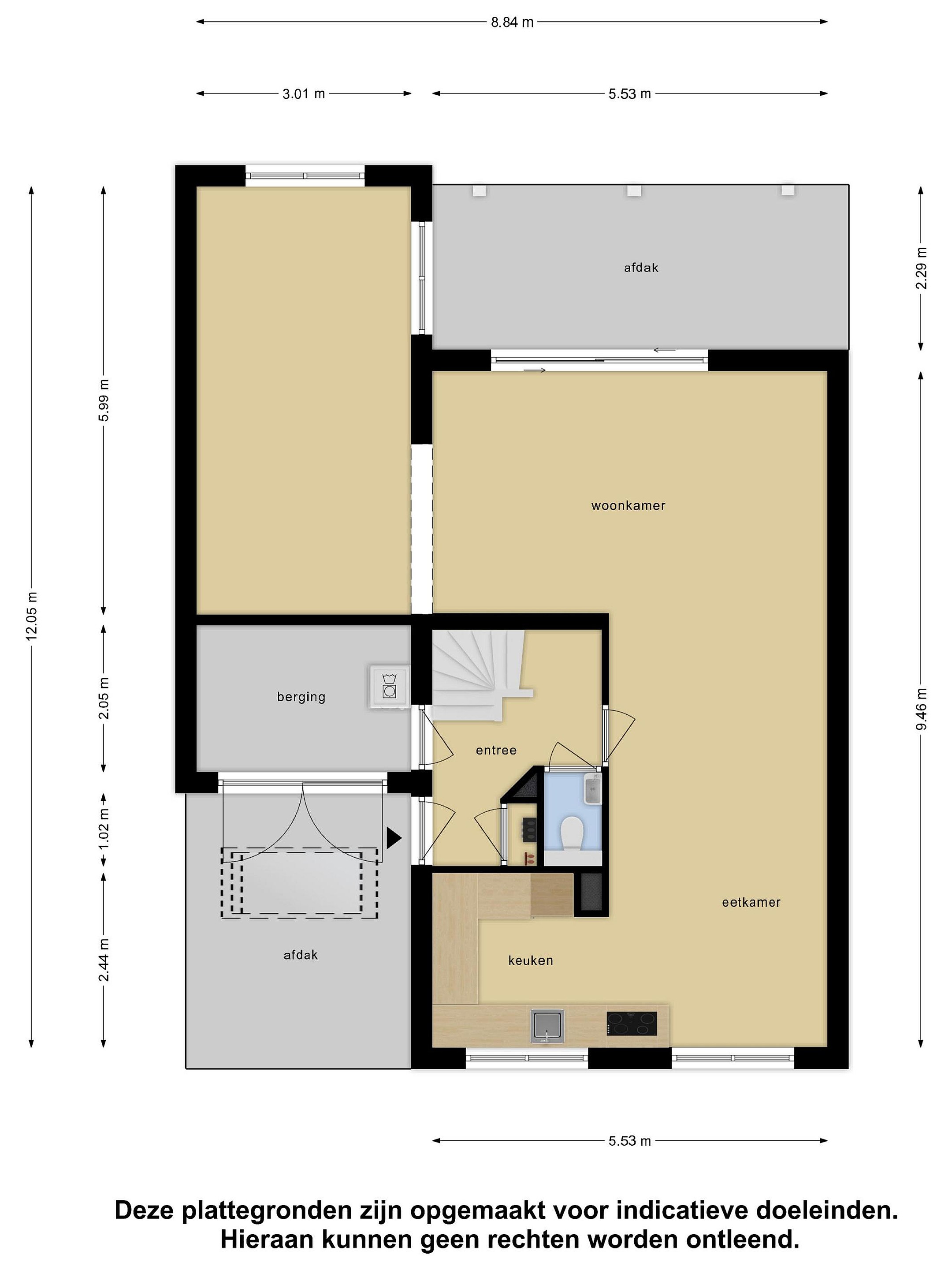 Via de oprit met carport stap je binnen in de hal met separaat toilet en toegang tot de inpandige berging. De royale woonkamer heeft grote raampartijen aan de tuinzijde en een fijne verbinding met de keuken. Aangrenzend vind je een extra ruimte die ideaal is als thuiswerkplek, speelhoek of hobbykamer. De keuken is verzorgd en uitgerust met inductiekookplaat, vaatwasser, grote koelkast, separate vriezer en volop werk- en opbergruimte.