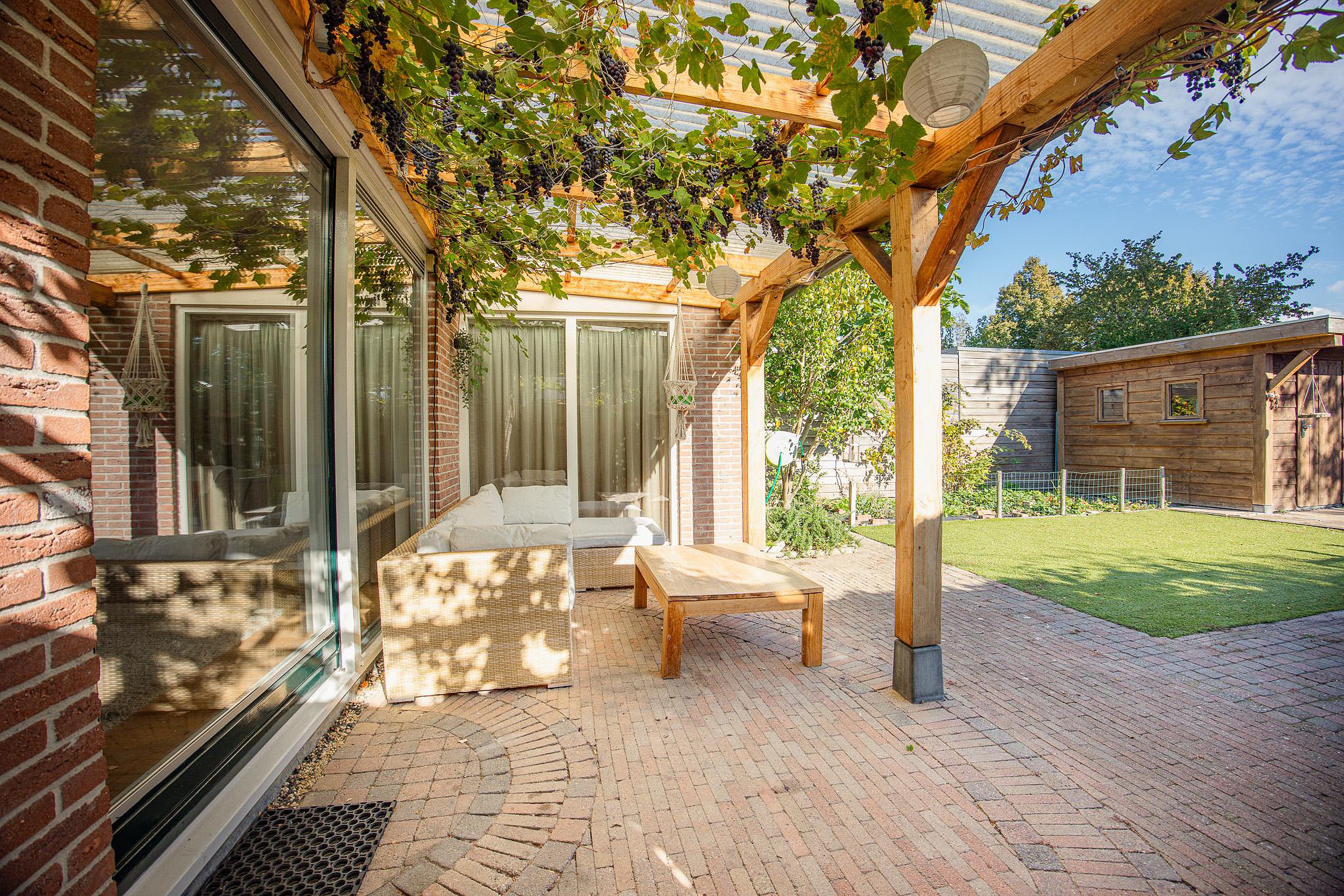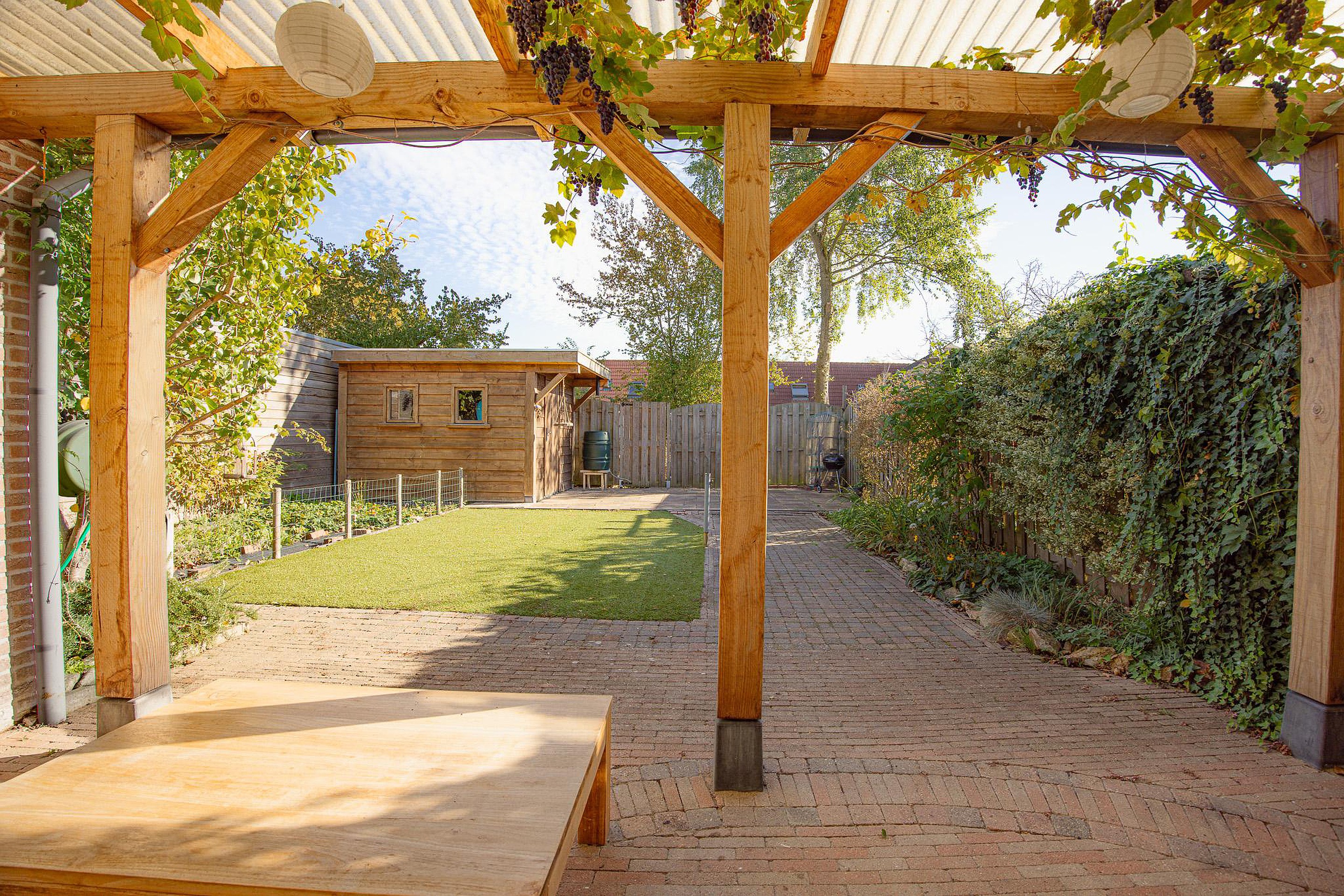 - Zonnige achtertuin met terrasoverkapping en vrijstaande houten berging (2021)
